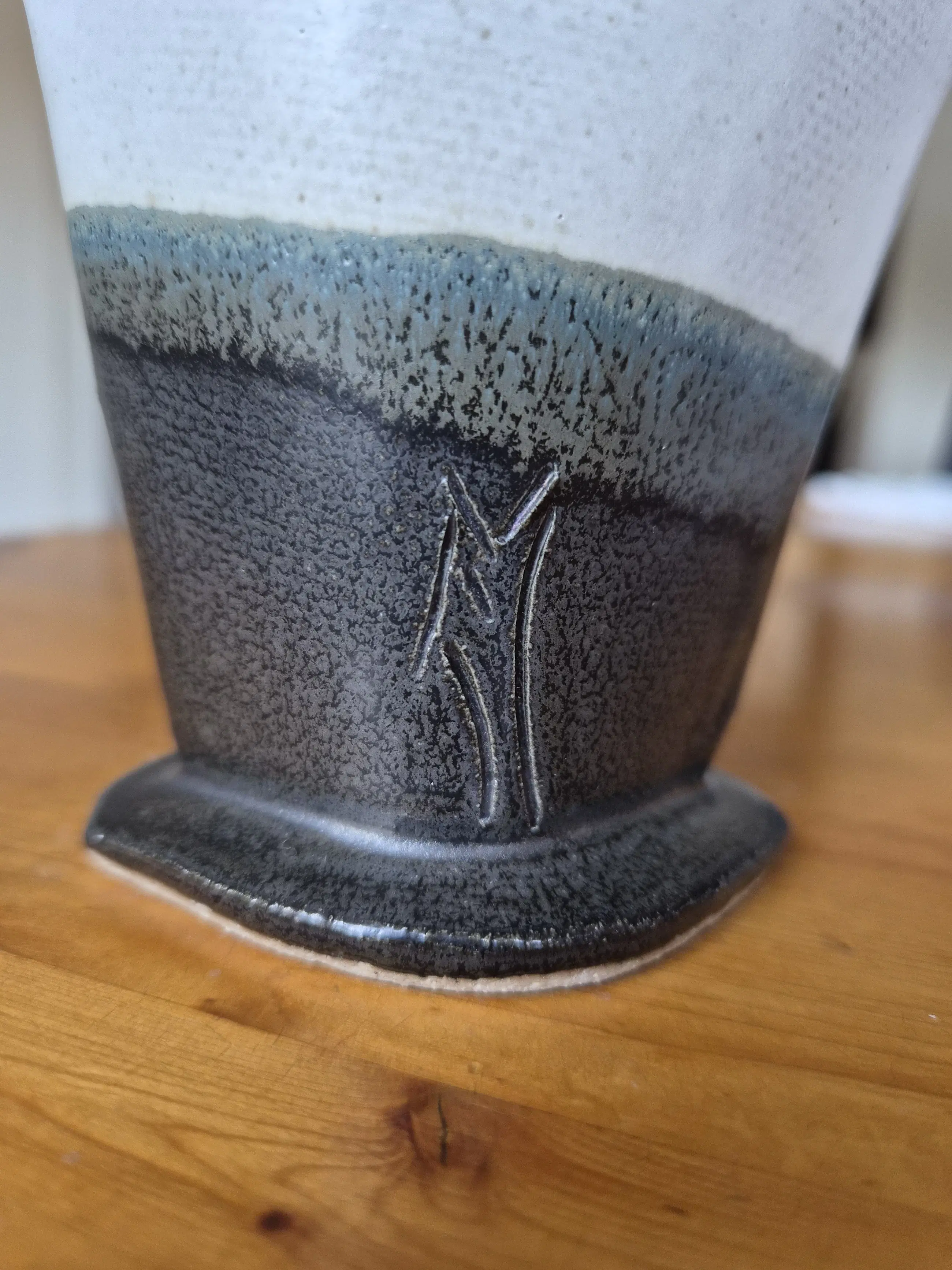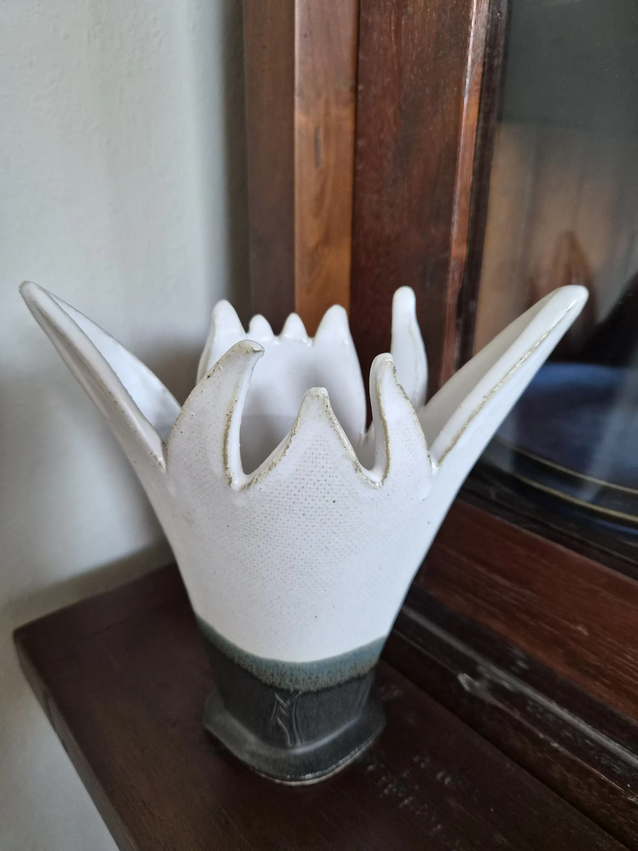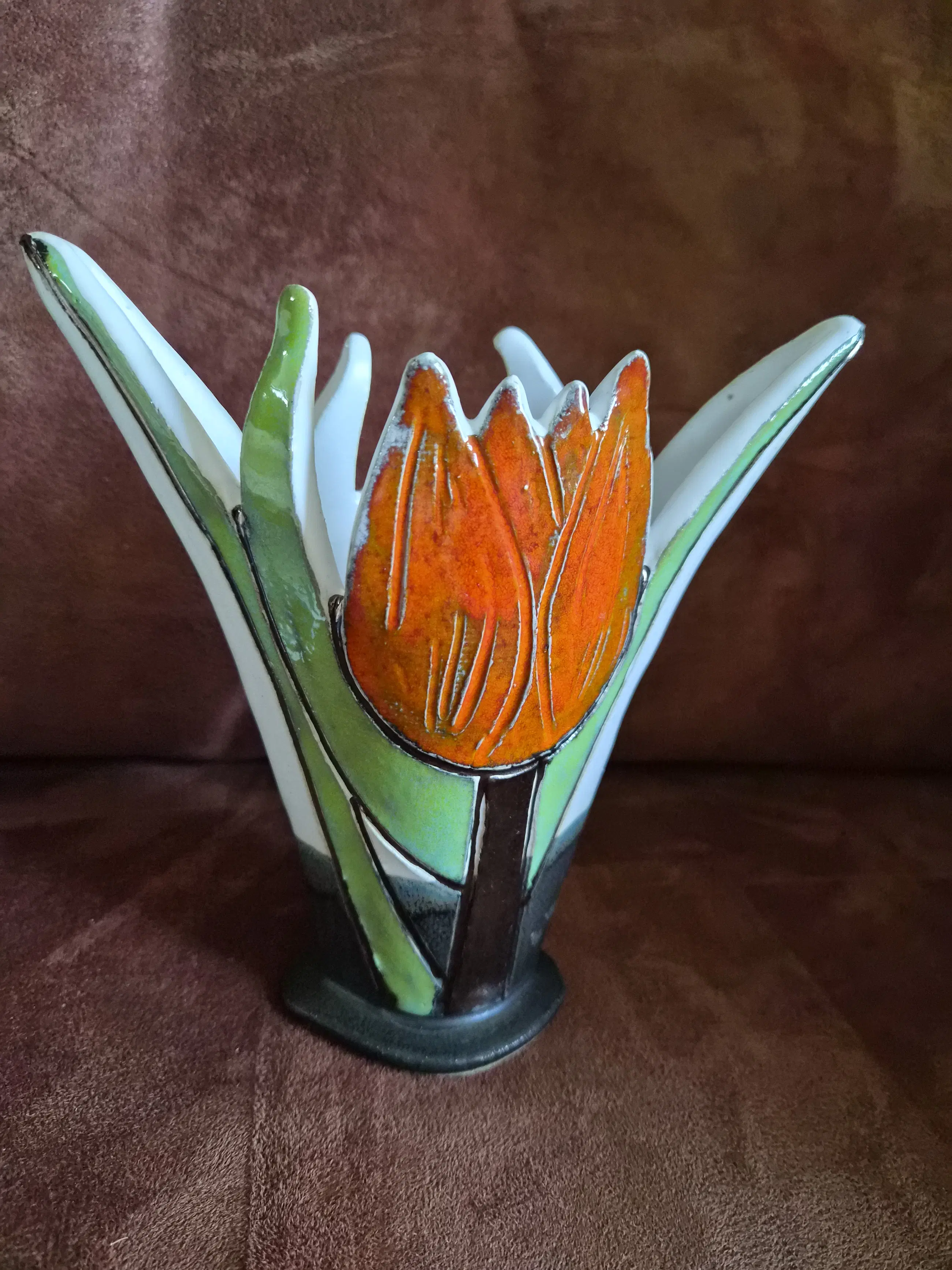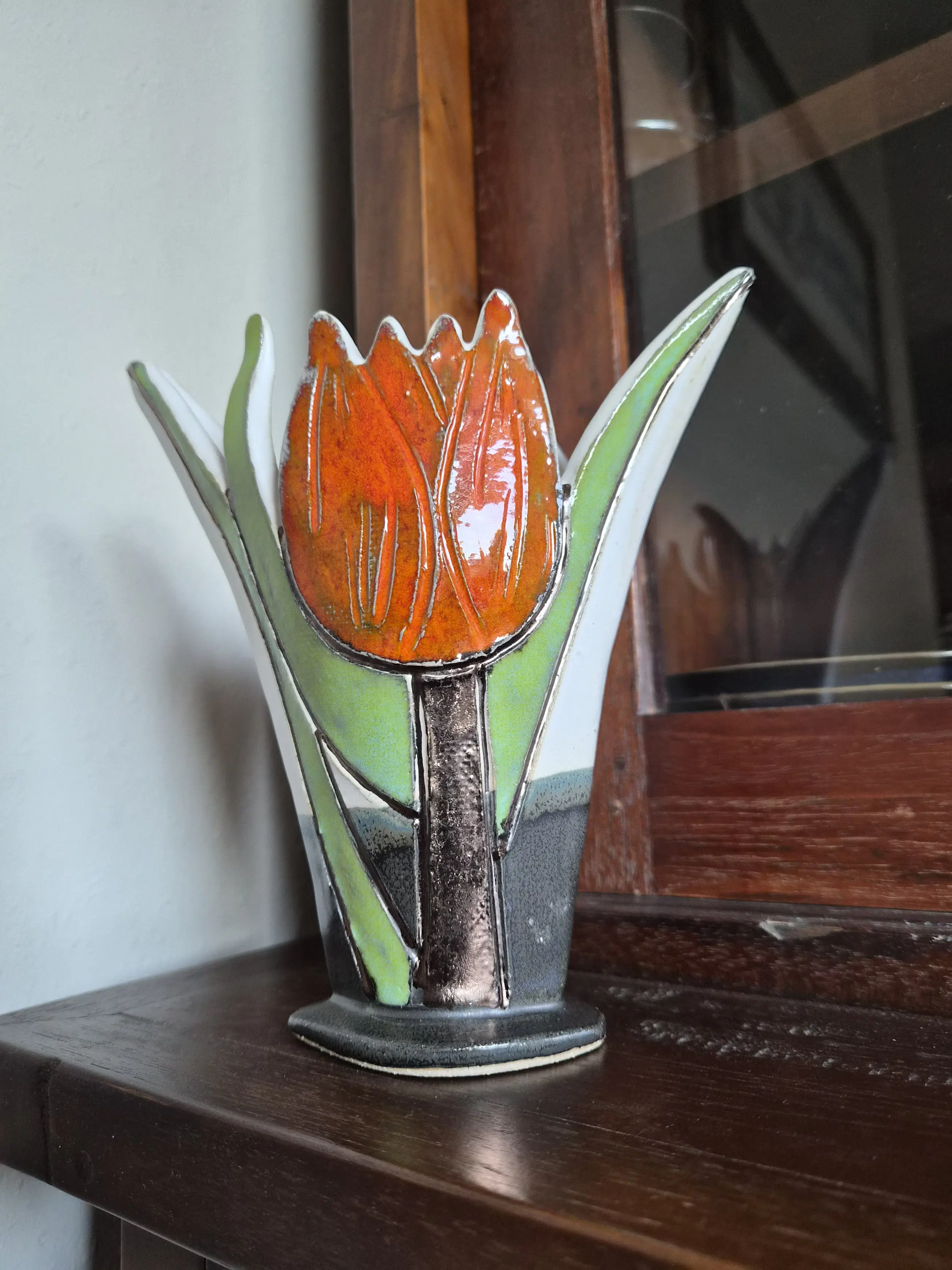 Puntgaaf keramiek van Ed Meissenberg. Oranje tulpvaas met belijningen in bronskleur