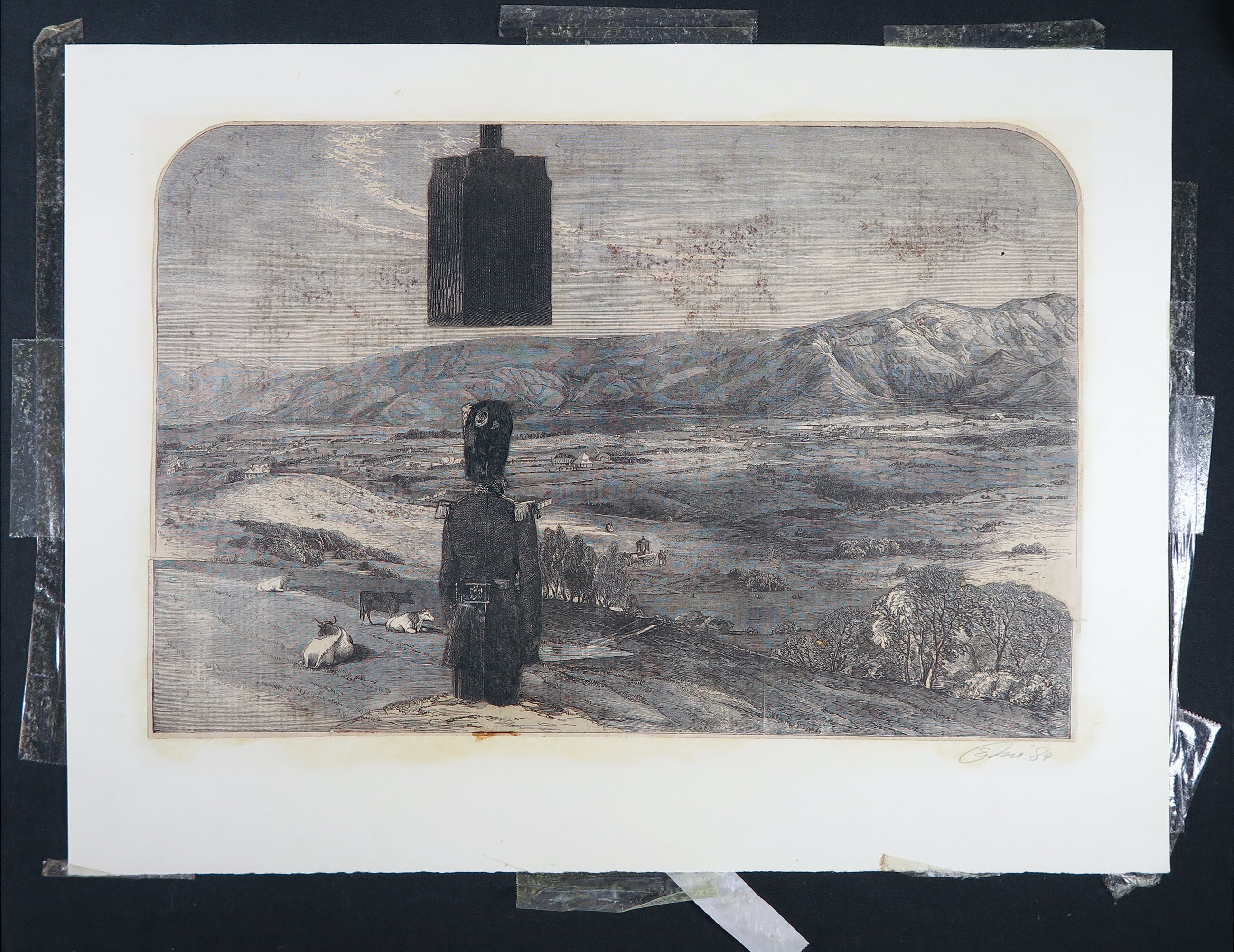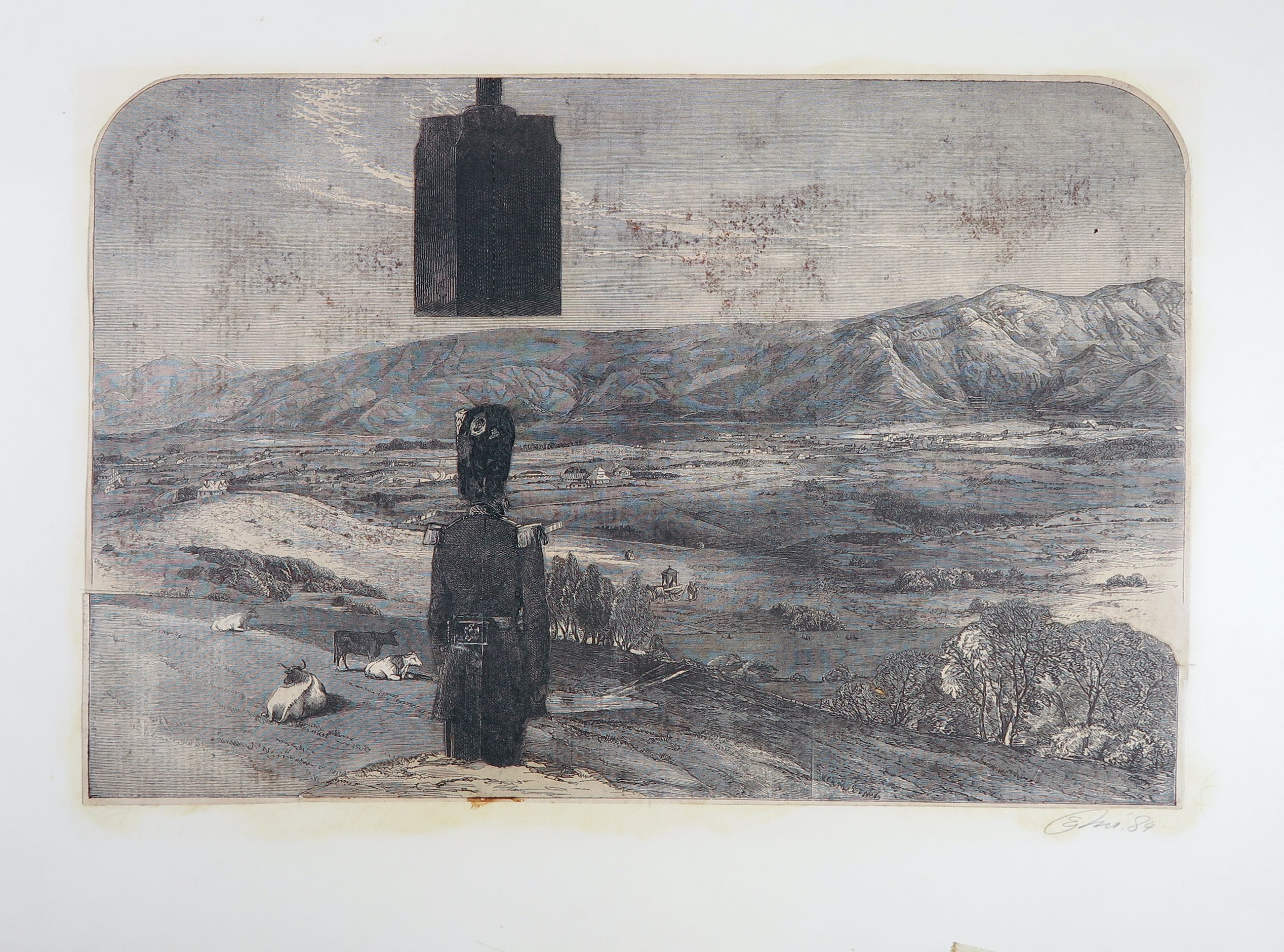 Grote verzuring van het papier verspreid over de hele voorstelling. Sterk vergeeld papier. De uitgeknipte etsen en gravures verschillen onderling in conditie. | |||||||||||