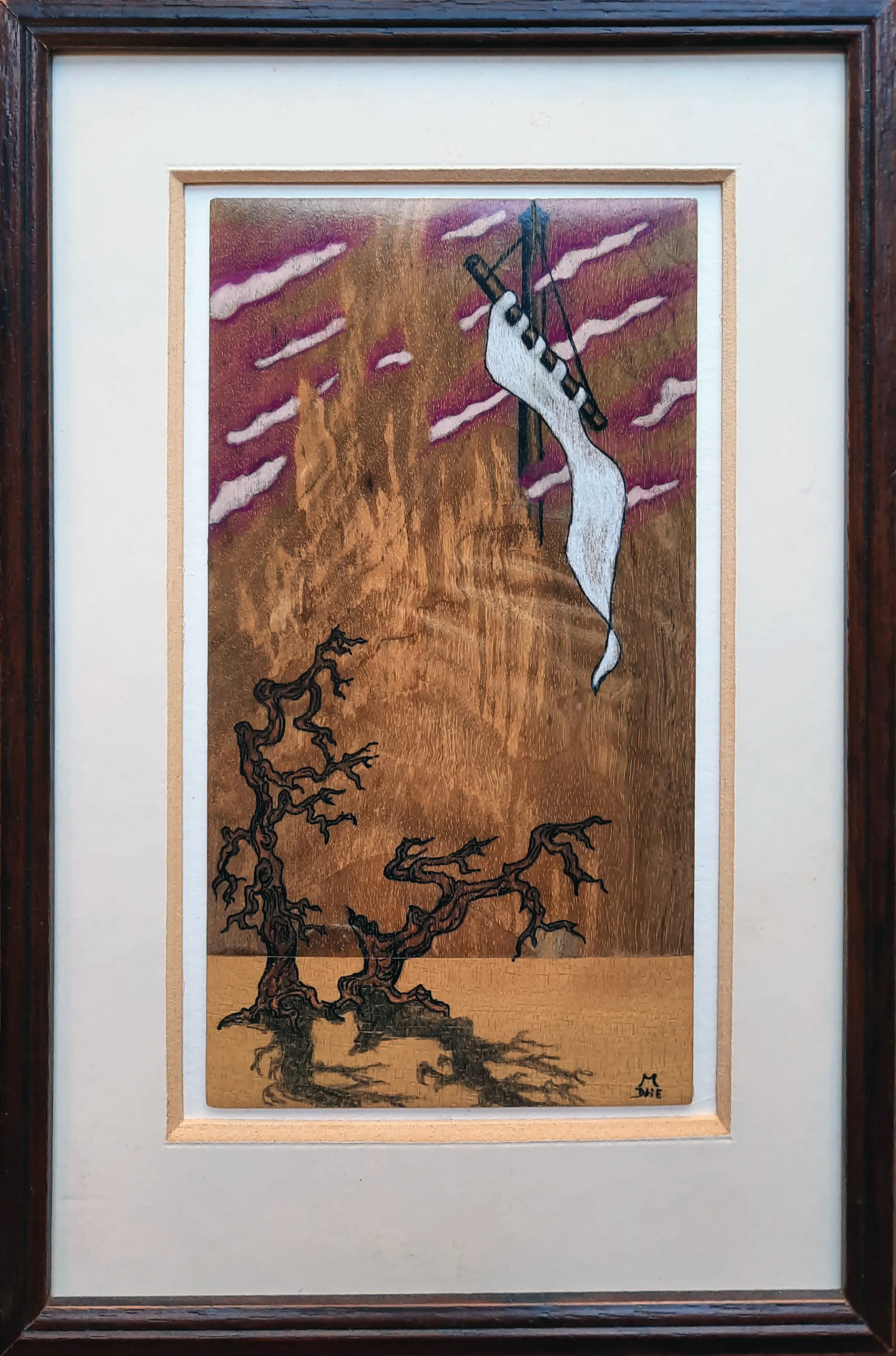 In simpel houten lijstje. Chinees aquarel op hout. Müller werkte eerst met de techniek intarsia. Later ging hij schilderen op hout. De nerven van de verschillende houtsoorten gebruikte hij in zijn voorstellingen. Müller werd sterk beïnvloed door de Japanse prentkunst.
