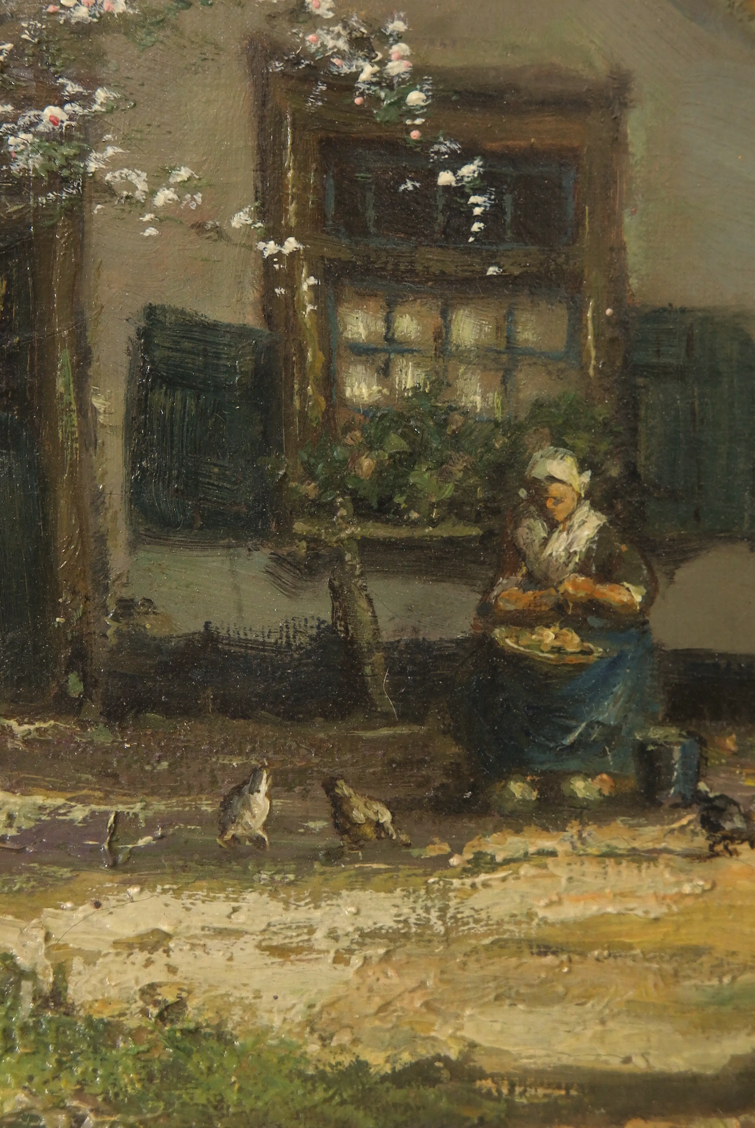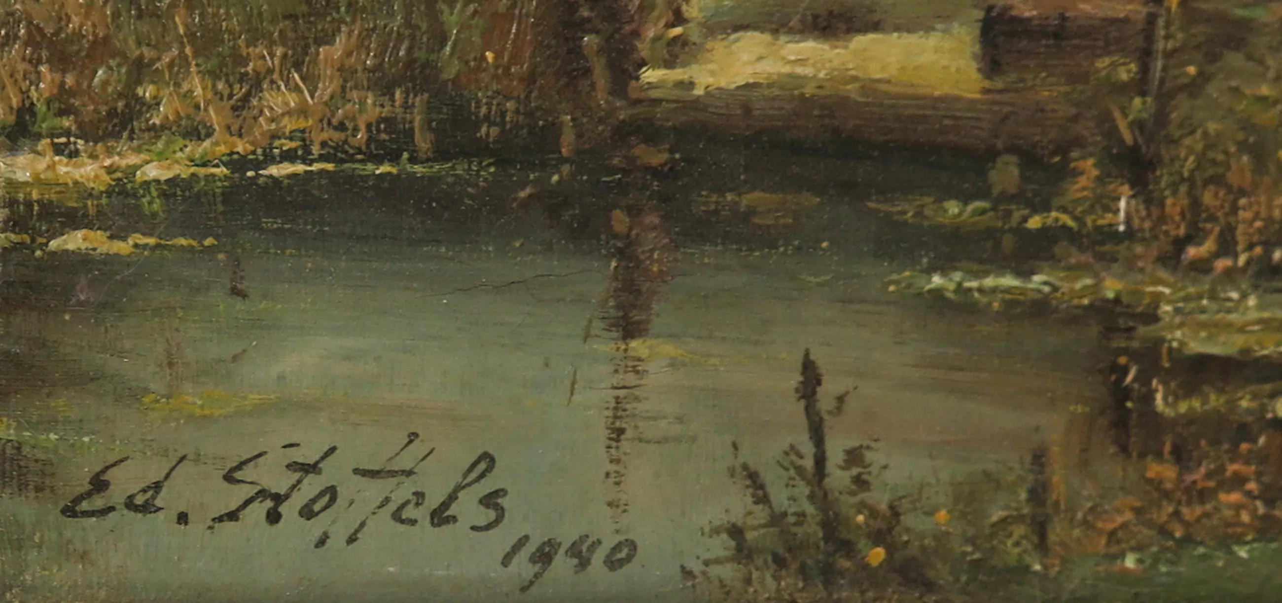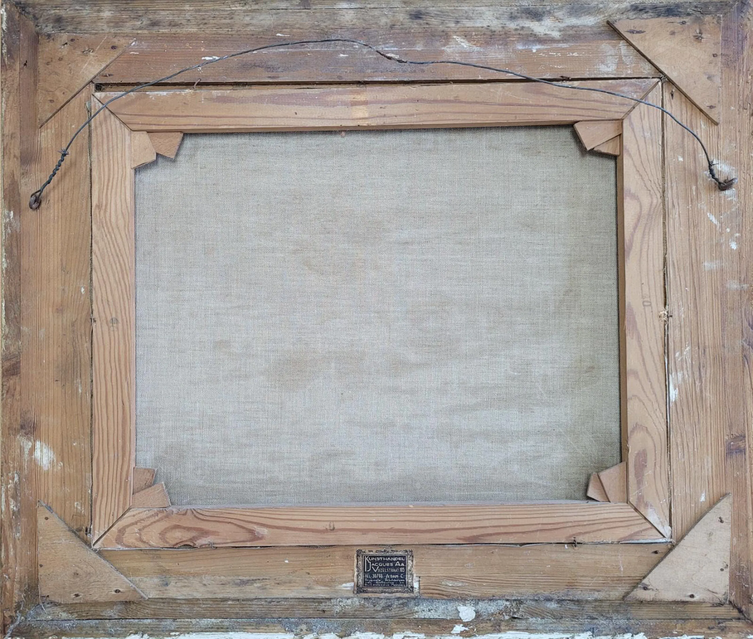 | Wat craquelé/barstjes in de verf zonder verfverlies.Het vernis is vergeeld/vuil.Het doek/spieraam zit vrij losjes in de lijst. | |