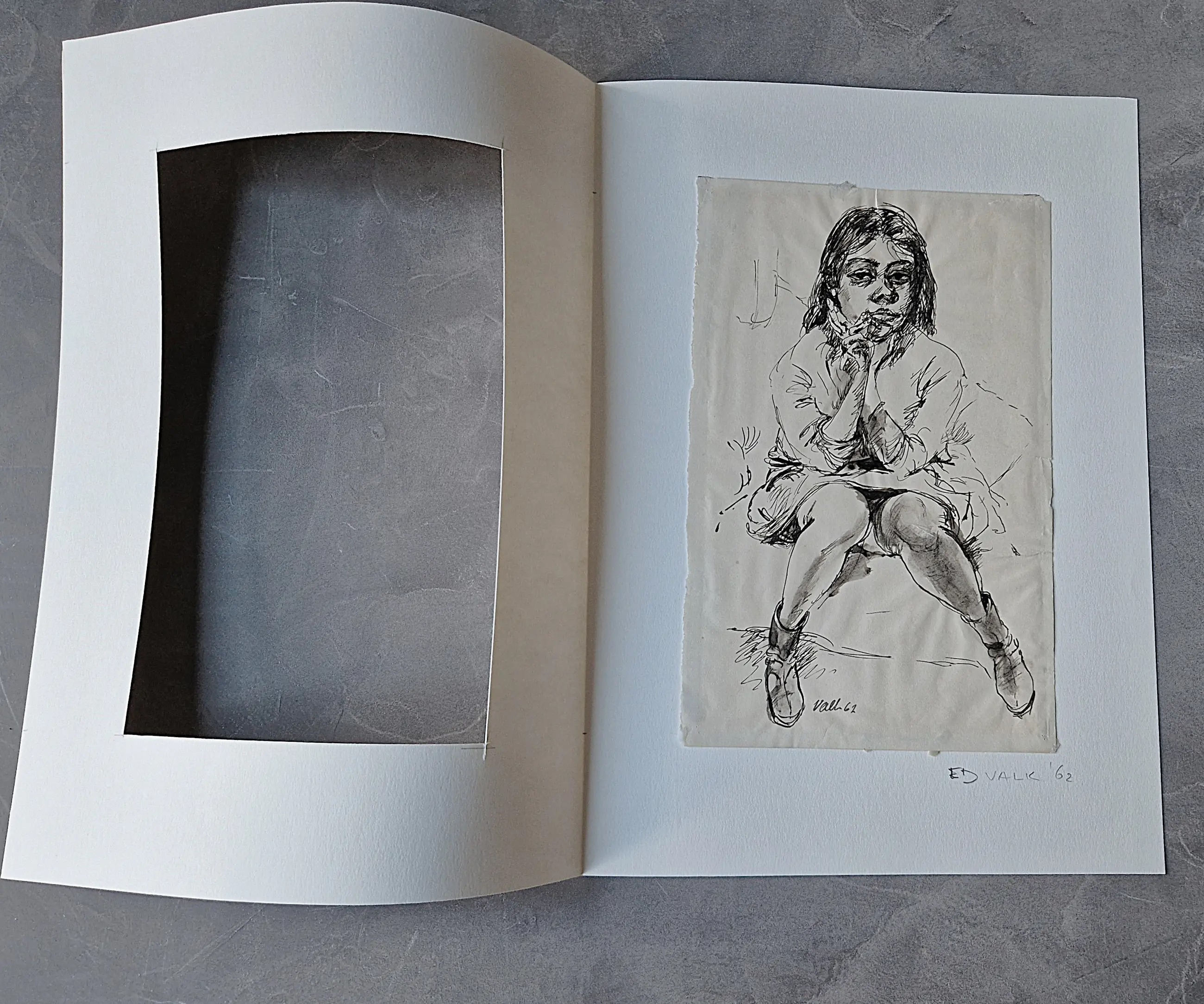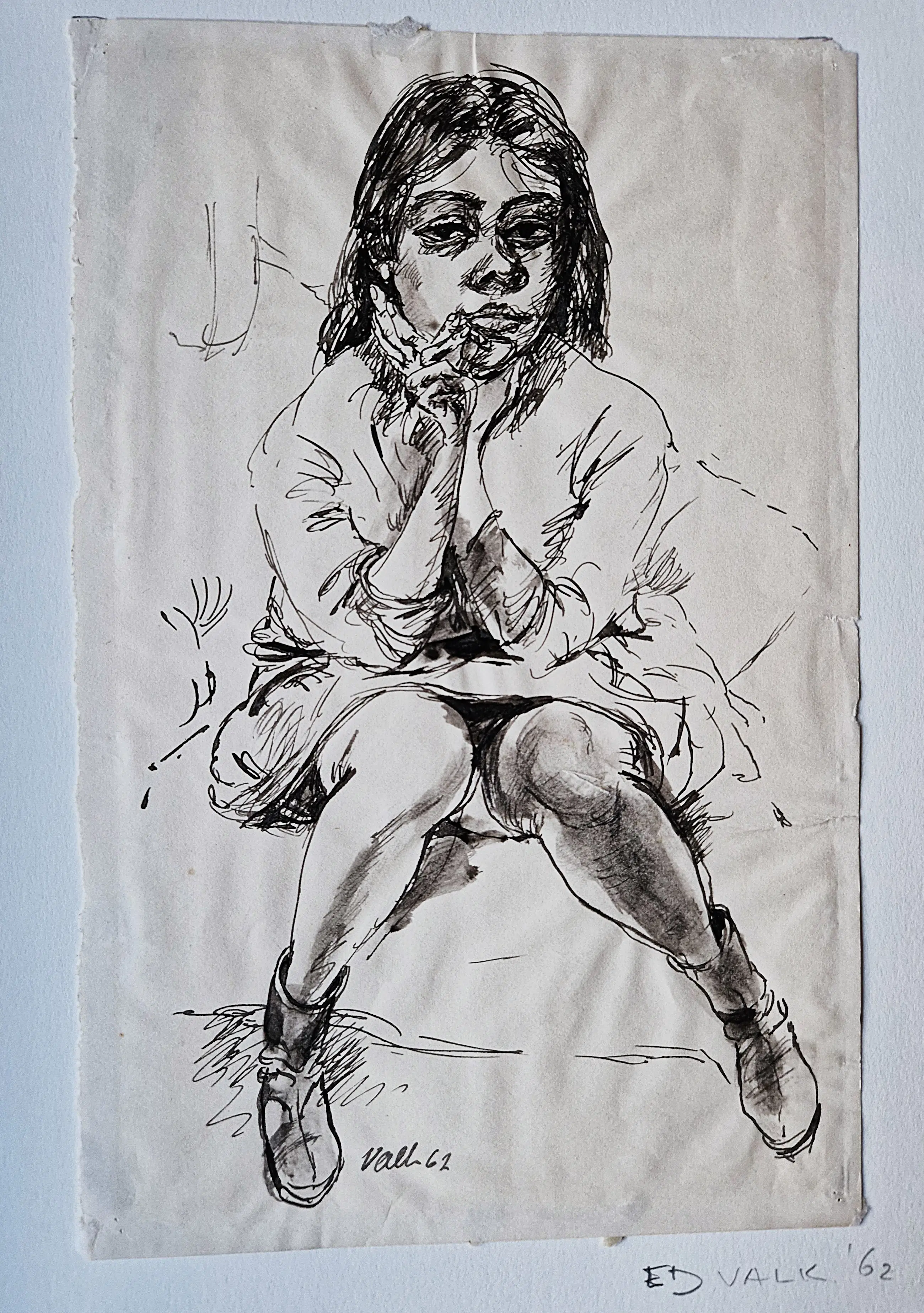 - ‘Meester van de lijn’, zo werd Ed Valk genoemd door collega’s. Direct nadat hij in 1952 afgestudeerd was aan de Koninkllijke Academie in Den Haag, besloot hij zich te gaan specialiseren in tekenen en aquarelleren. Aanvankelijk maakte Ed grote pentekeningen: ‘Op die manier’, zo stelde hij, ‘ dwong ik mezelf om eenvoudig te tekenen en helder, met lange lijnen die door het hele beeldvlak liepen.’Later ging hij over op potlood en krijt. Ed kreeg naam met zijn tekeningen van mensen, bomen, bloemen en planten.