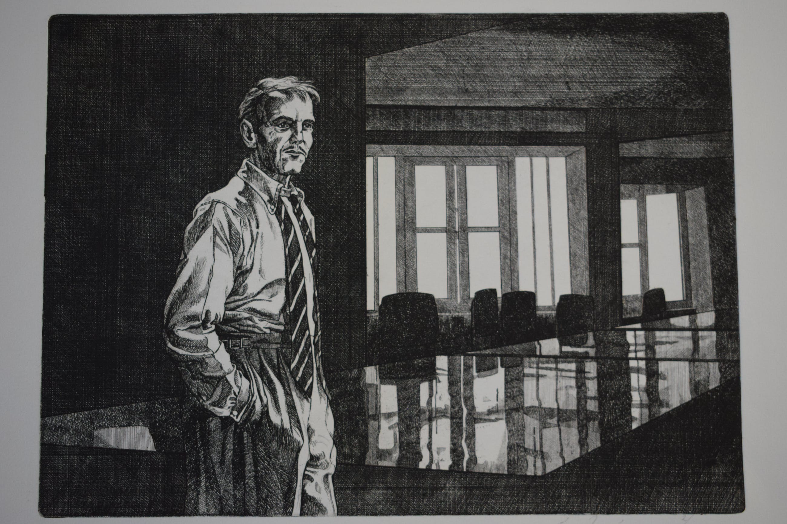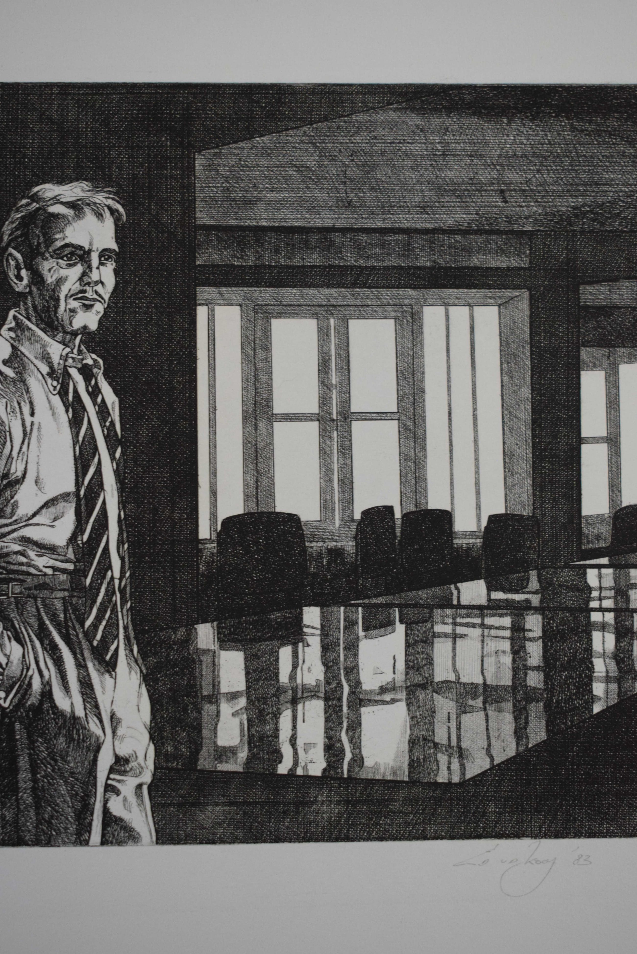 Een statige man die geportretteerd wordt in een lege vergaderzaal. Mooie weerspiegeling van de ramen op de tafel .