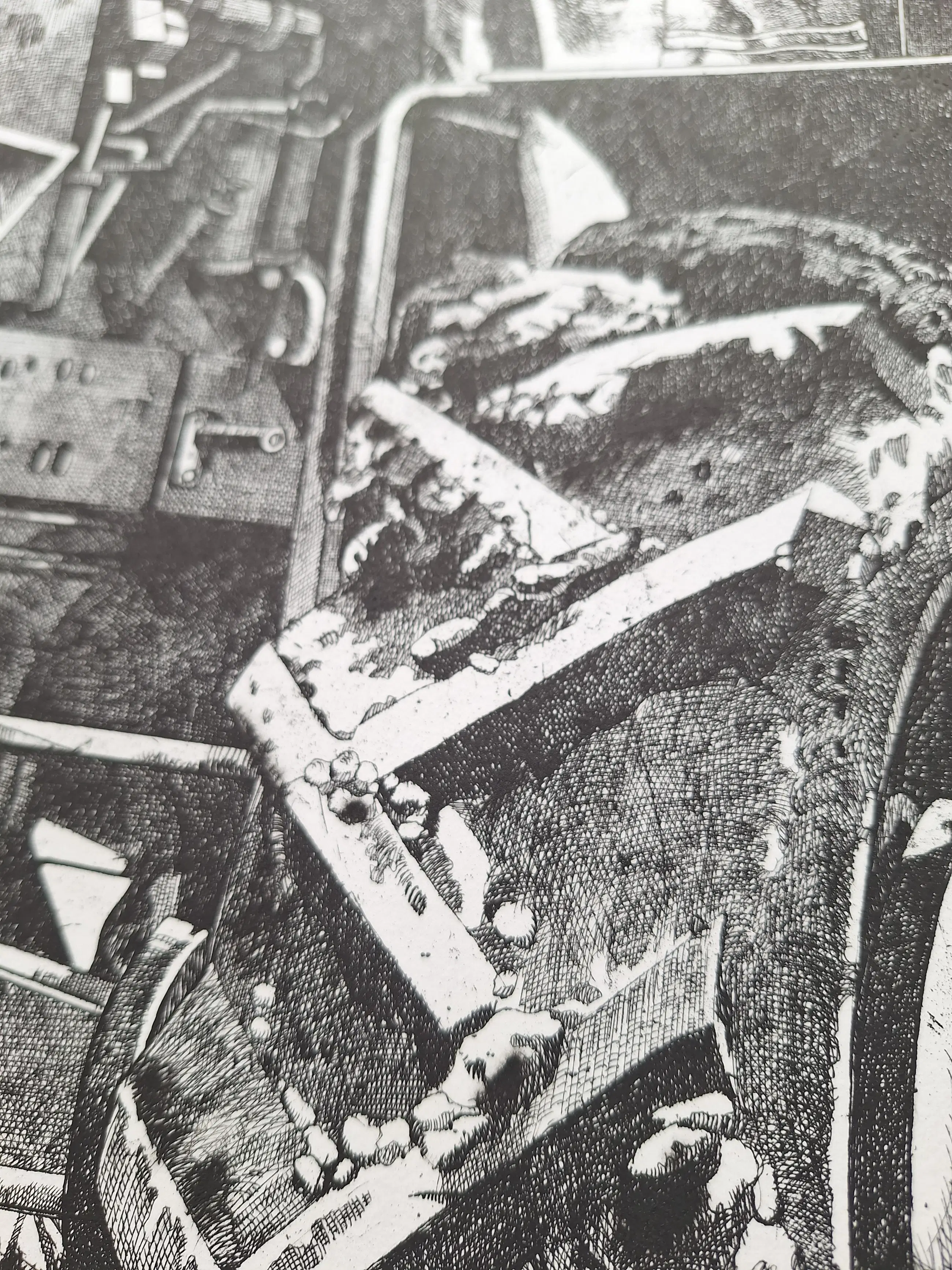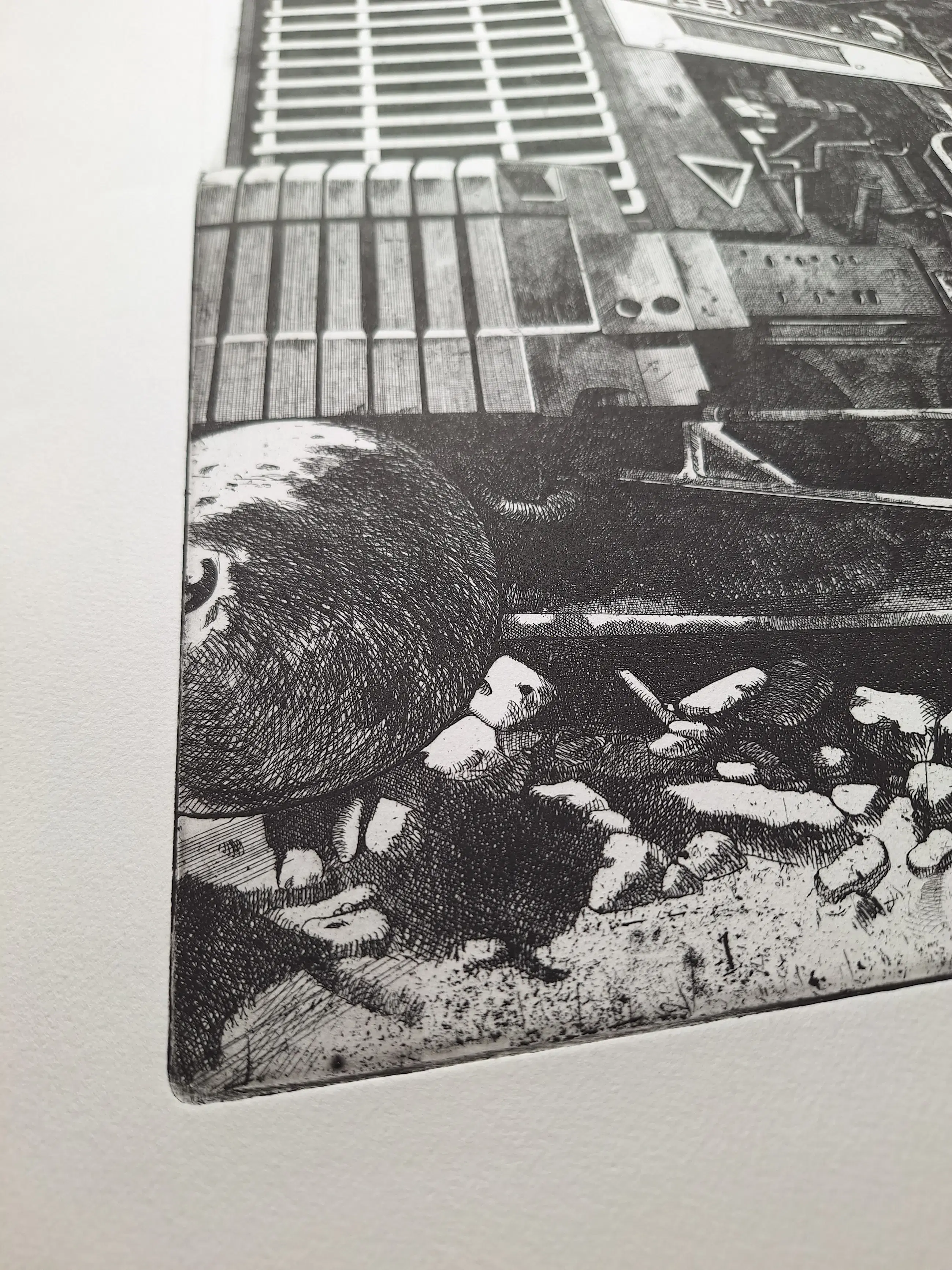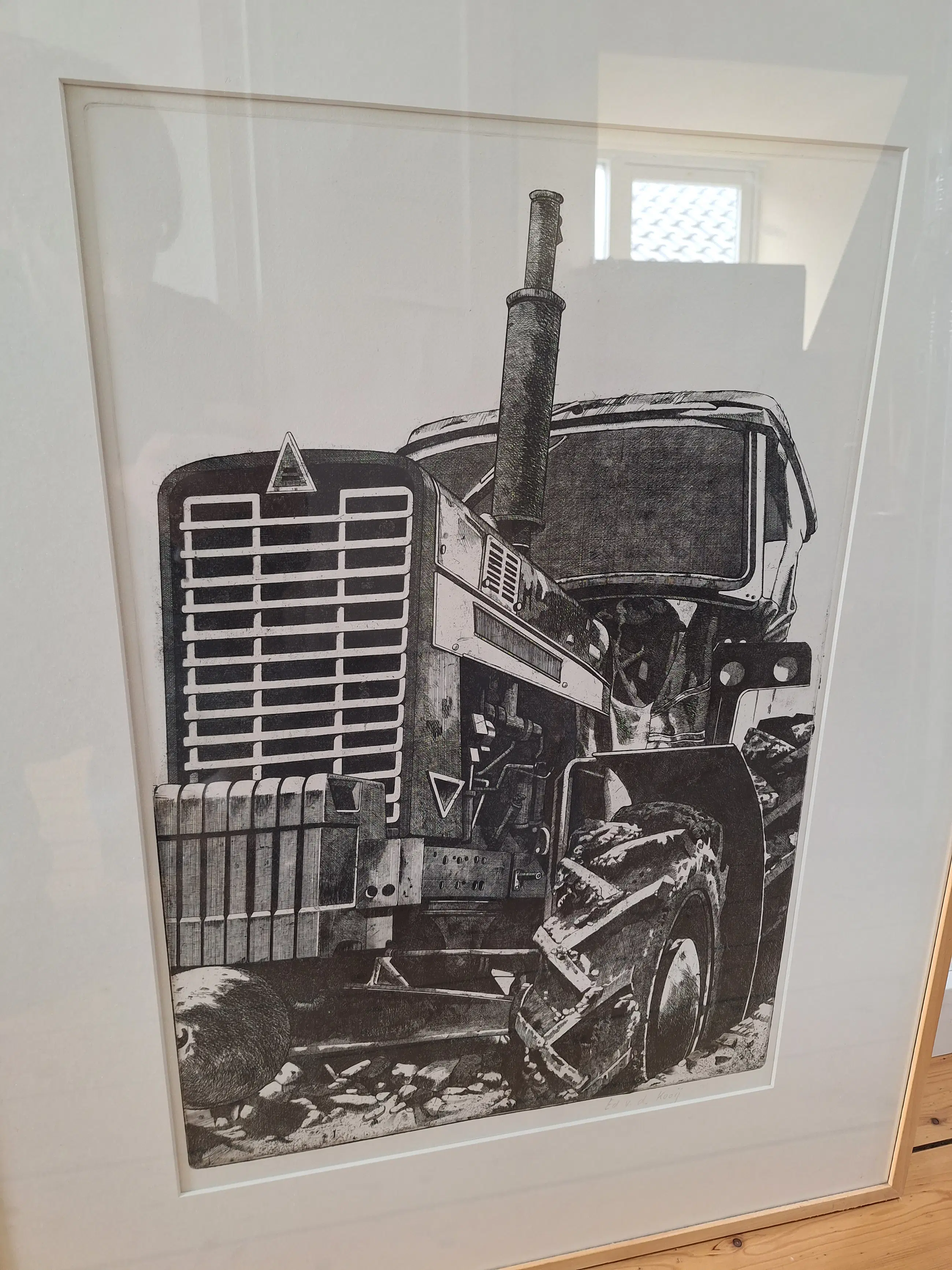 Mooie ets van een tractor. Het beeld is ongeveer 40x60 centimeter, het papier is ongeveer 55x75 centimeter. Het werk wordt zonder lijst verkocht. Enkele vlekjes op de achterkant van het papier.