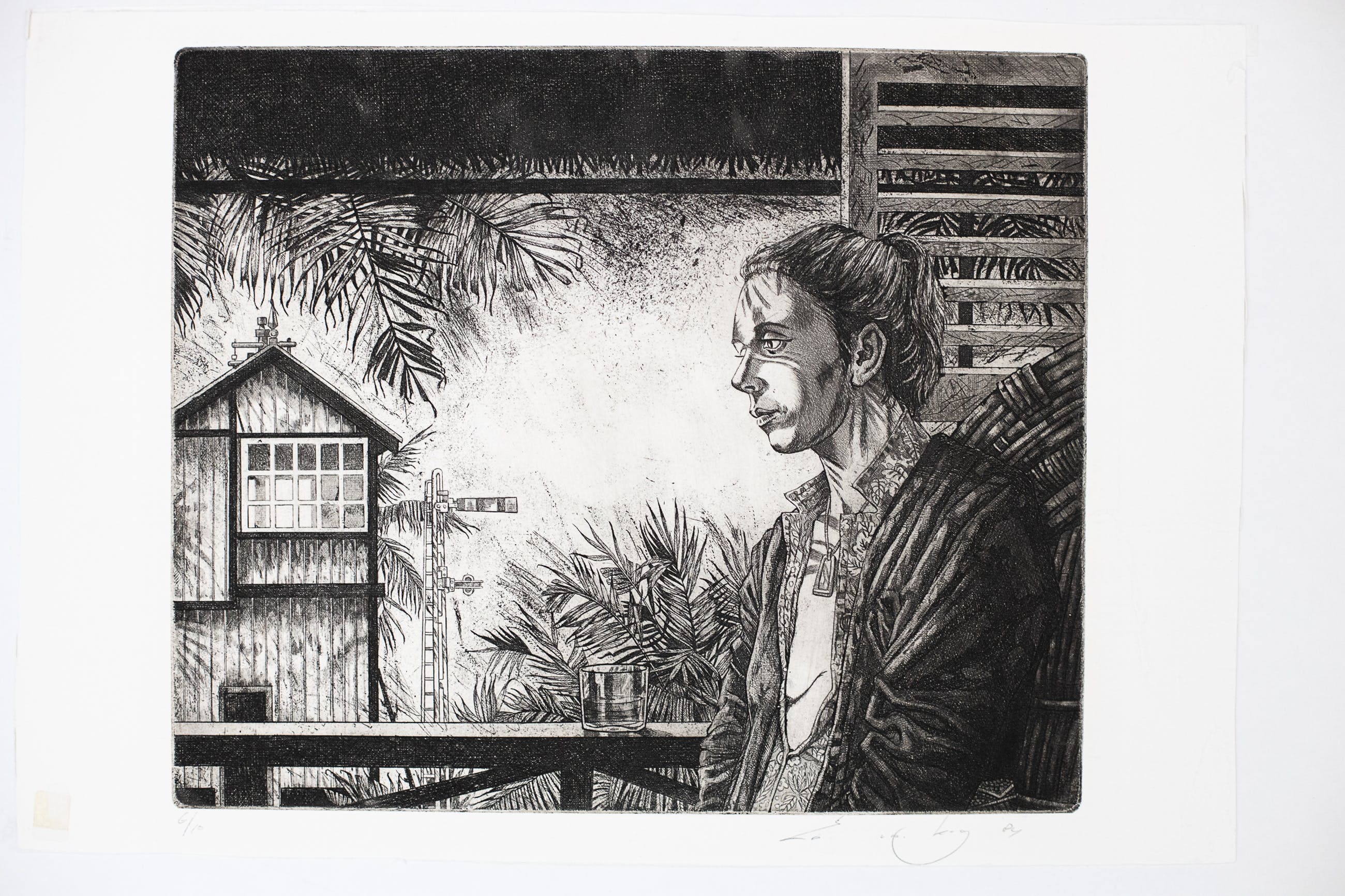 Een set van 2 etsen in zwart wit op geschept papier. Man bij bed en Vrouw in oosters kamp. Beide zijn 26 cm hoog. Die met de vrouw is 30 cm breed en de afbeelding met de man is 40 cm breed. De werken zijn niet ingelijst en rechtstreeks bij de kunstenaar gekocht.
