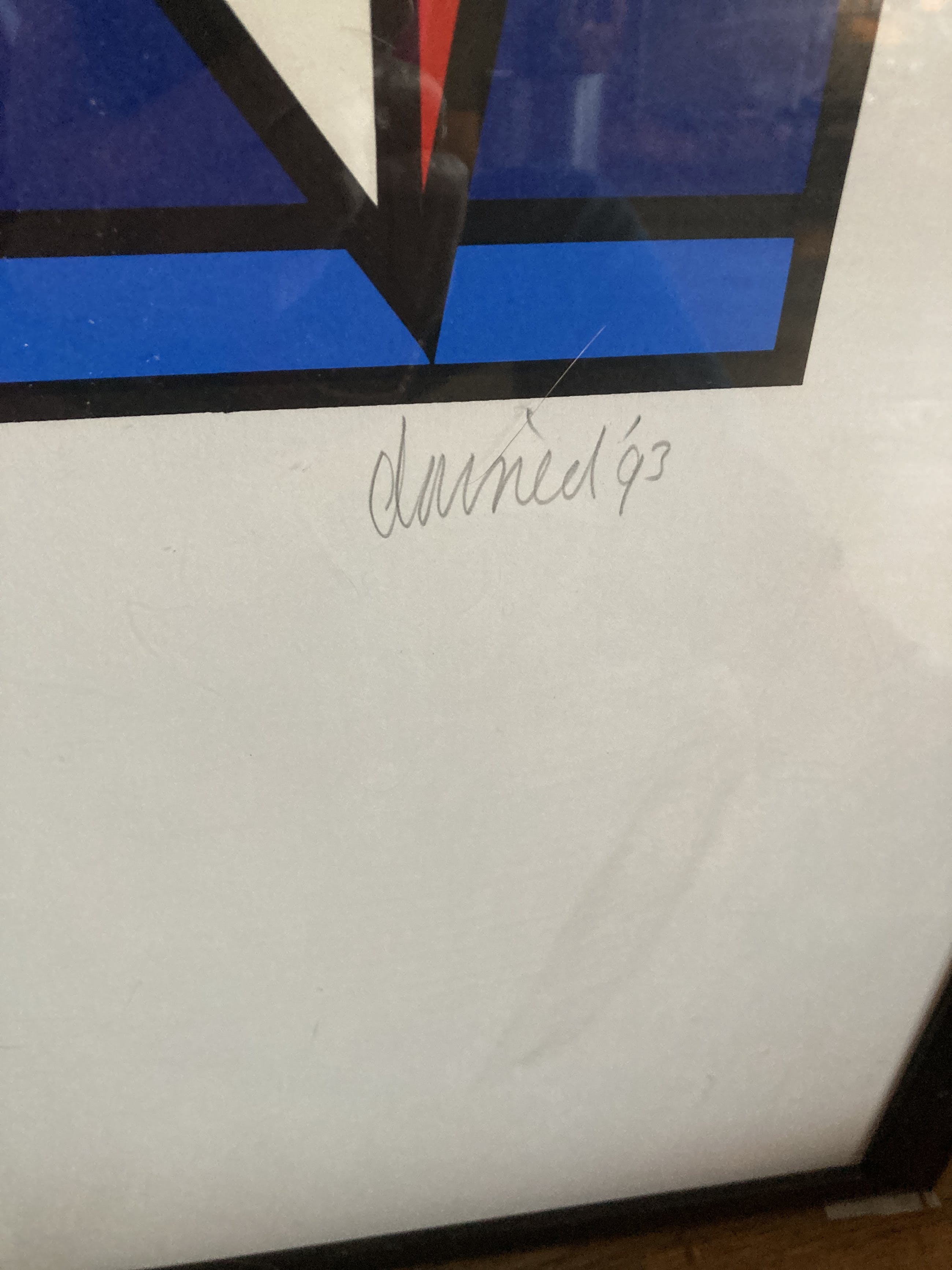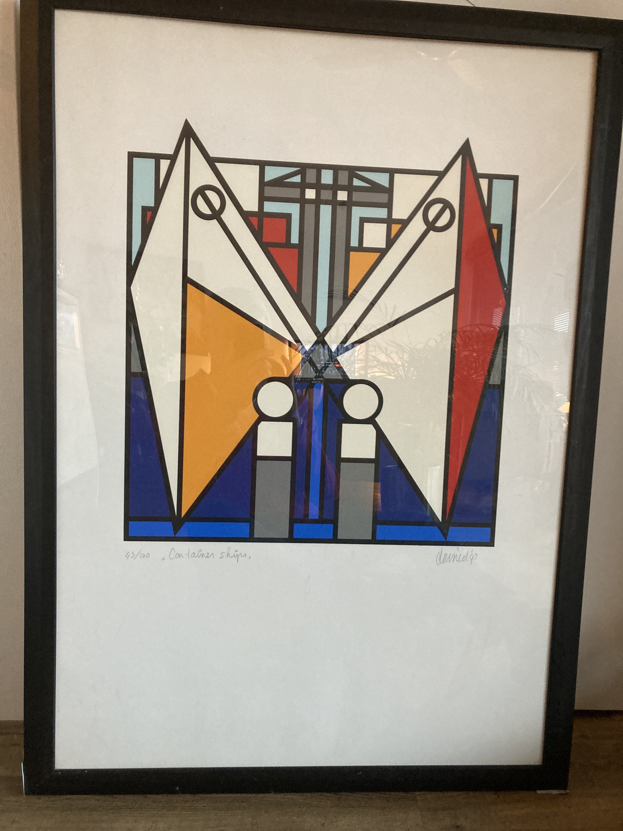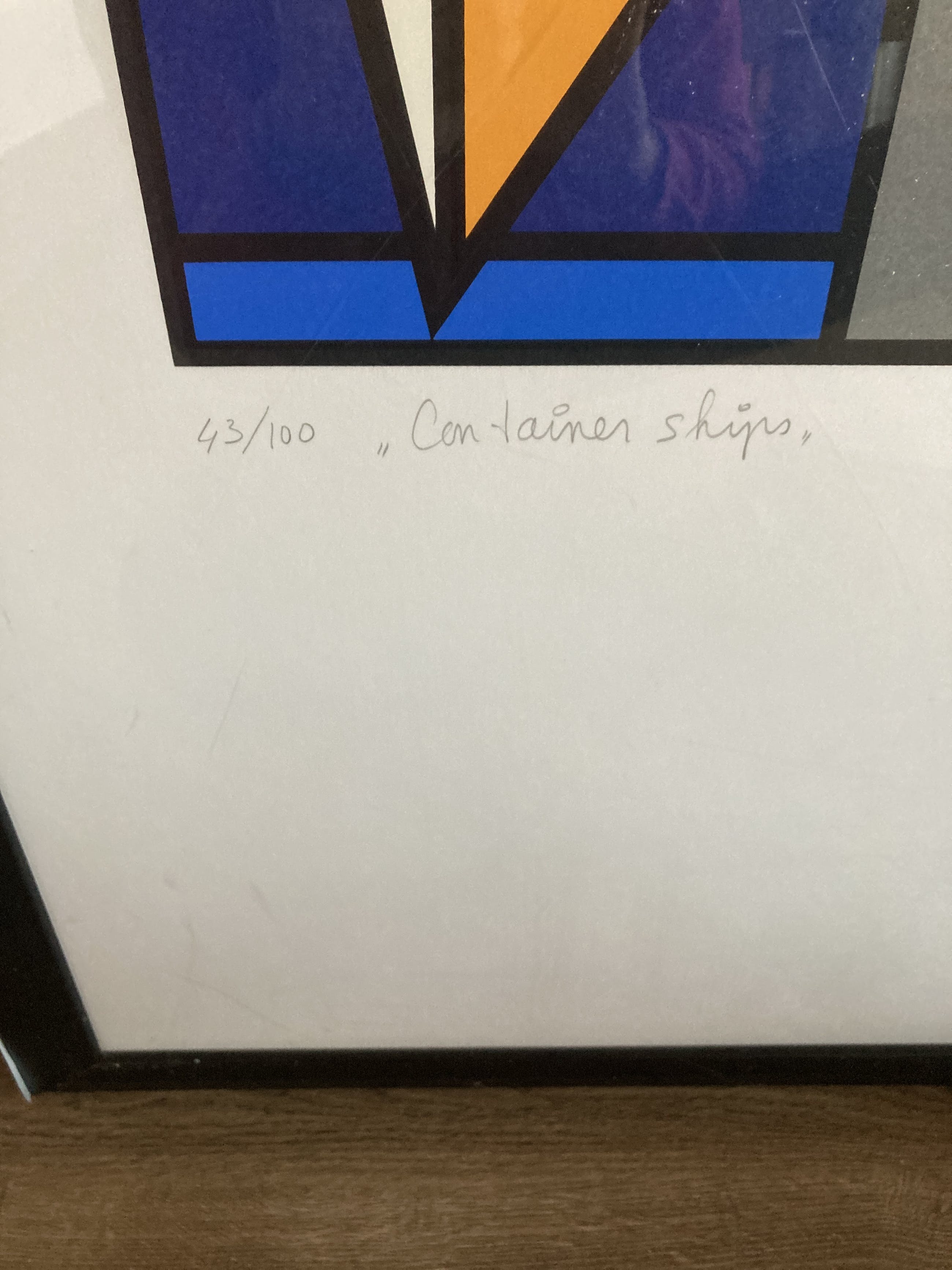 Prachtige, kleurrijke en grote Kleurenlitho met een zwarte houten lijst van 4 cm breed. Met l.o. 43/100 Containerships met potlood en r.i doorned ‘93 met potlood.