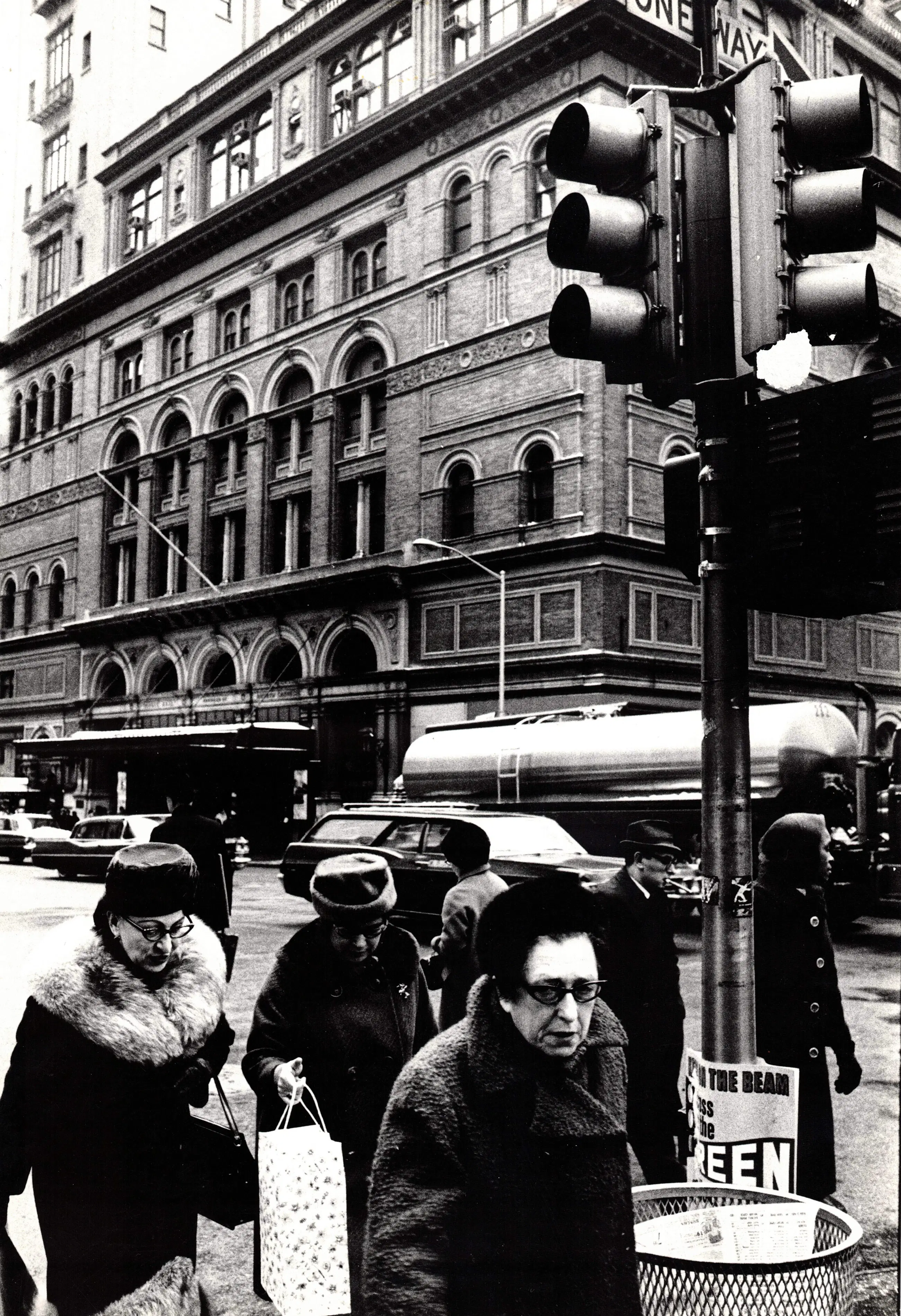 Prachtig jaren 60 stadsbeeld van New York door Eddy Posthuma de Boer. Crosstown traffic voor de Carnegie Hall, op de hoek van 7th Avenue en West 57th Street, net ten zuiden van Central Park. Gelatinezilverdruk, met situering in ball-point en studiostempel achterop. In zeer goede conditie.