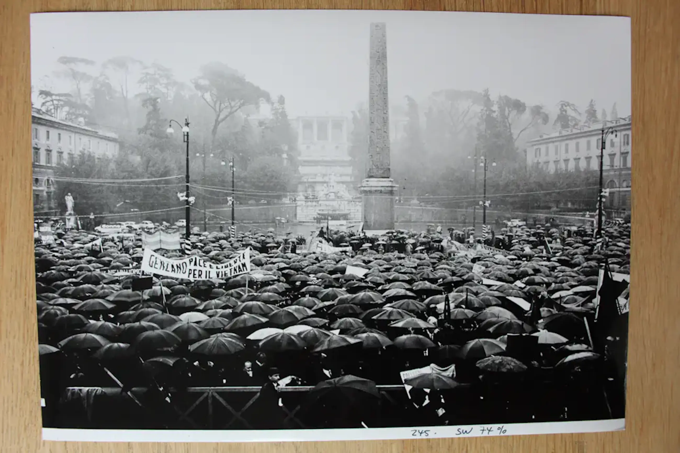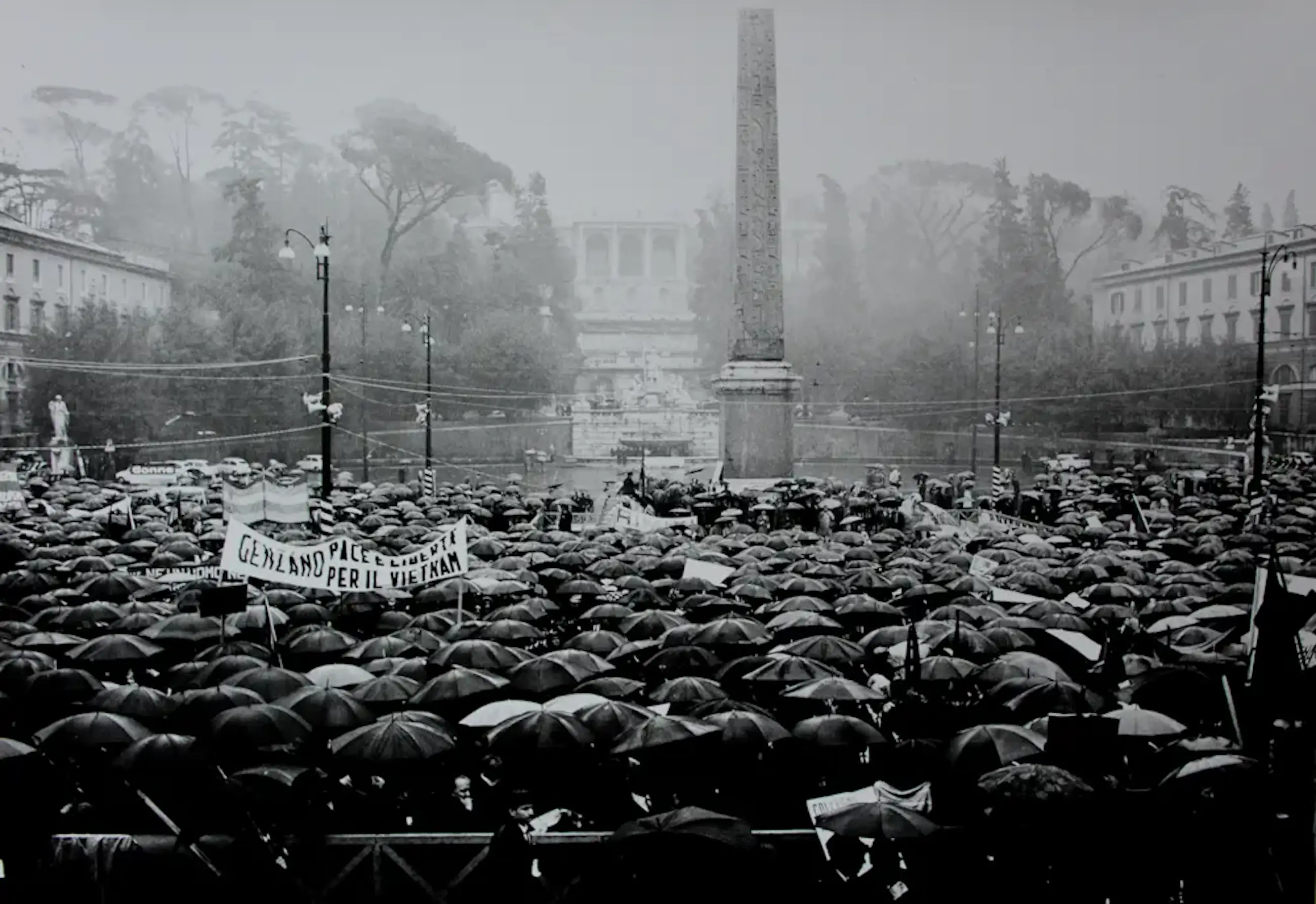 Foto van Eddy Posthuma de Boer van een protest tegen de Vietnamoorlog in Italie. Afmetingen foto: H22 x b31cm. Het werk is, achterop voorzien van een atelier stempel, van de kunstenaar. De authenticiteit van dit werk wordt volledig gegarandeerd. Een certificaat van echtheid kan, op verzoek, worden gemaild.