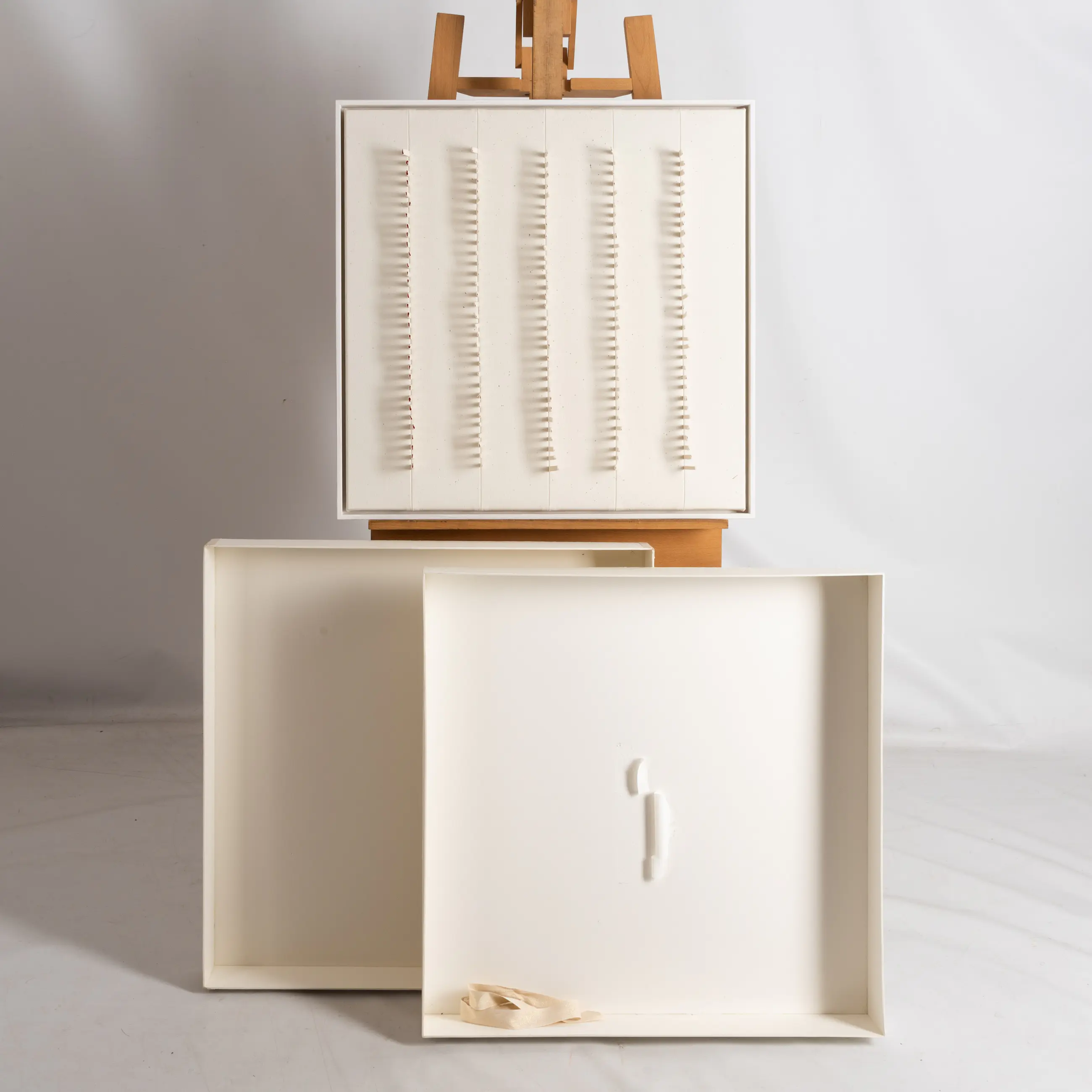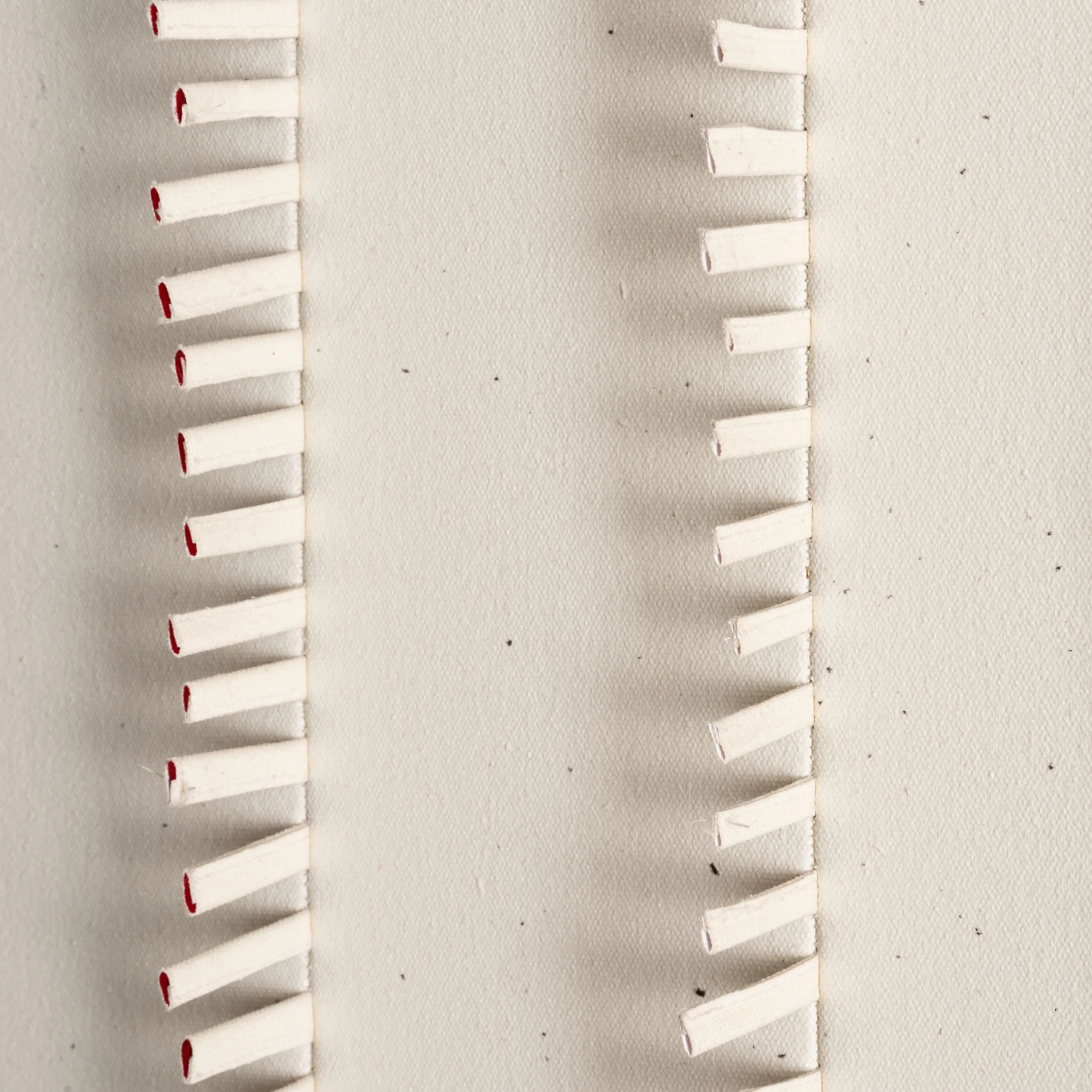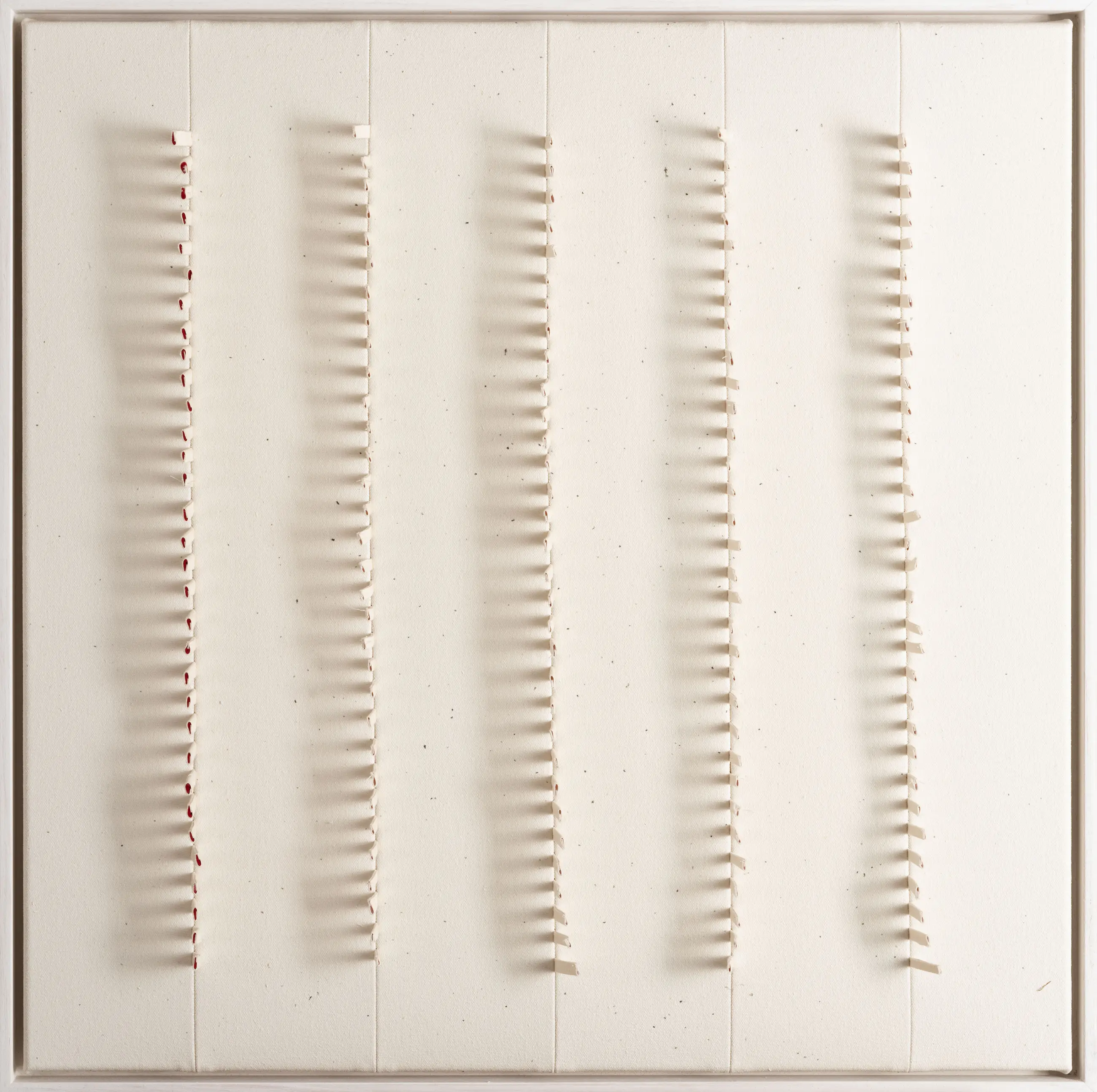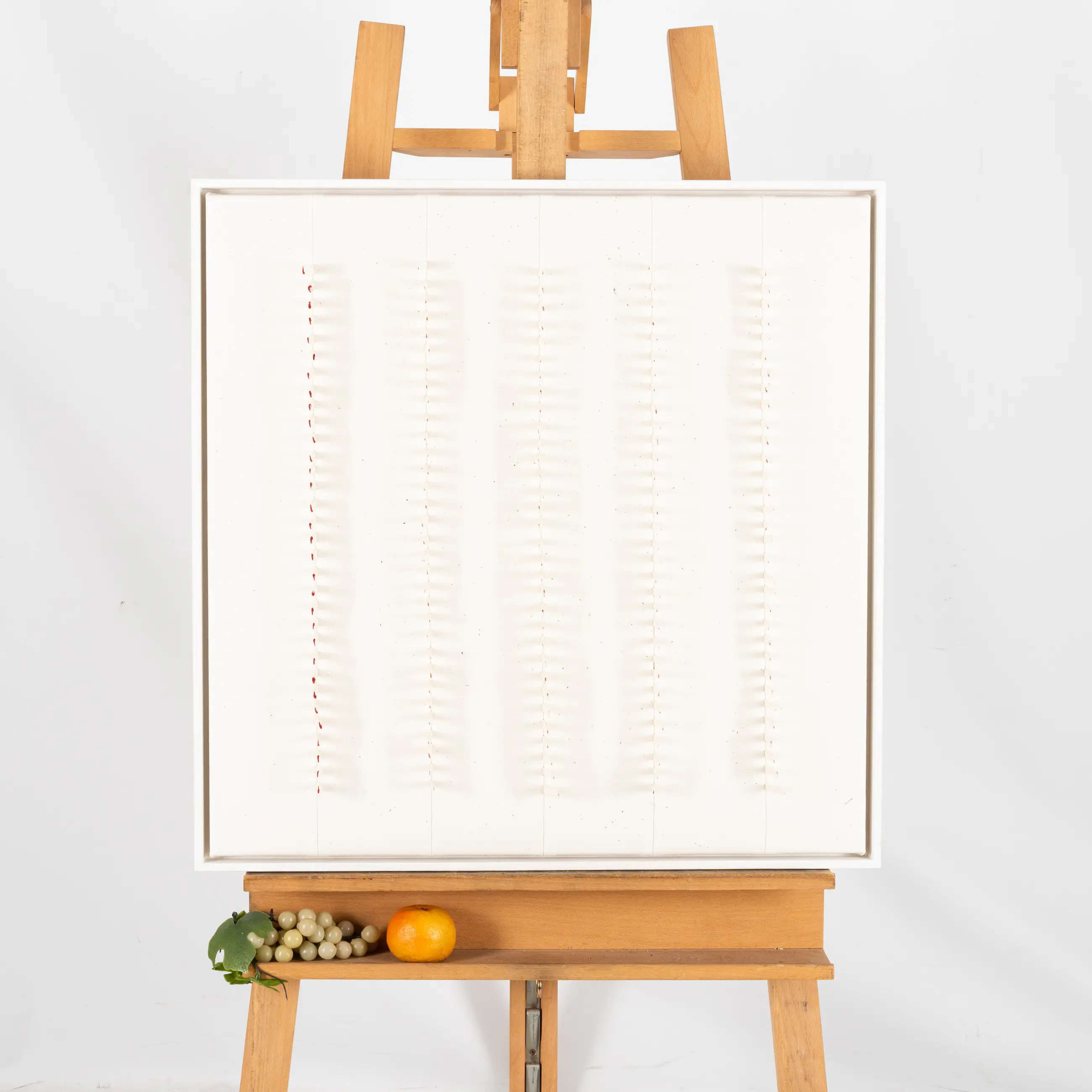 Minimalistisch reliëfwerk van Eddy Stikkelorum, opgebouwd uit ritmisch geplaatste kleine, witte elementen op een monochrome ondergrond. De verticale reeksen creëren een strak patroon, waarbij licht en schaduw een spel vormen en het werk voortdurend verandert naargelang de kijkhoek en belichting. De subtiele rode accenten aan de zijkant van de elementen geven het werk een onverwachte gelaagdheid en spanning. Het resultaat is een bijna meditatieve compositie die de balans zoekt tussen orde en variatie, stilte en vibratie.