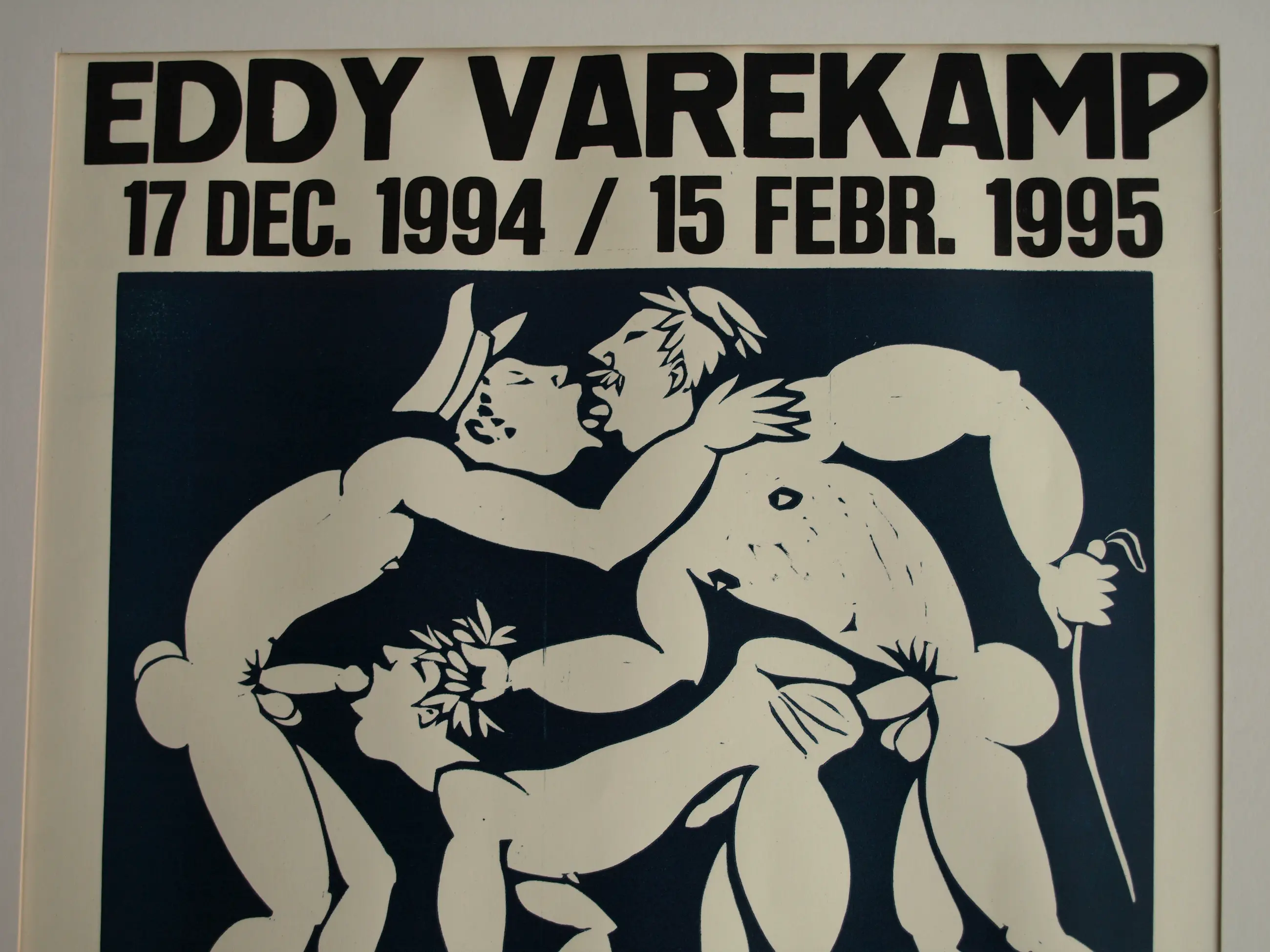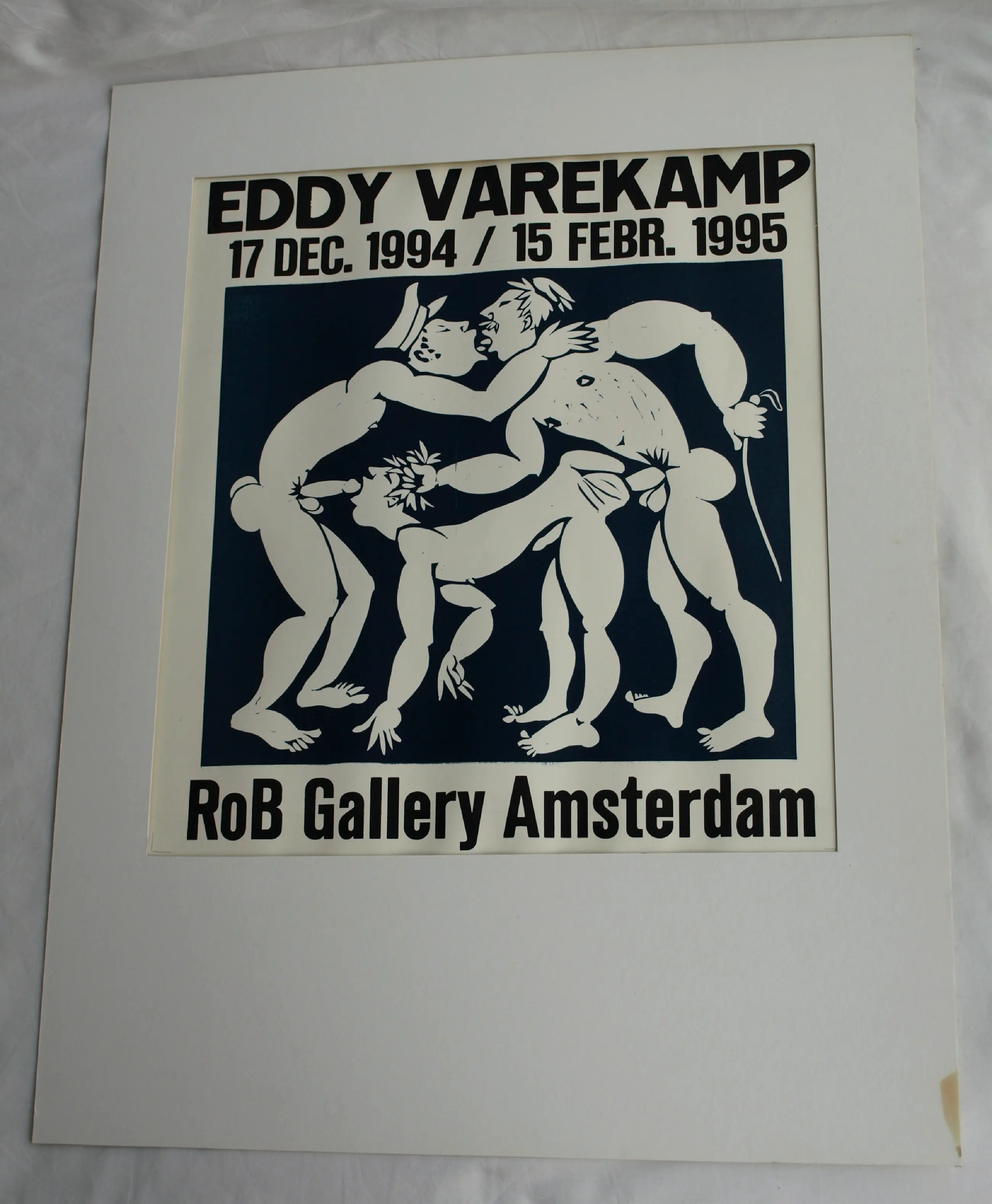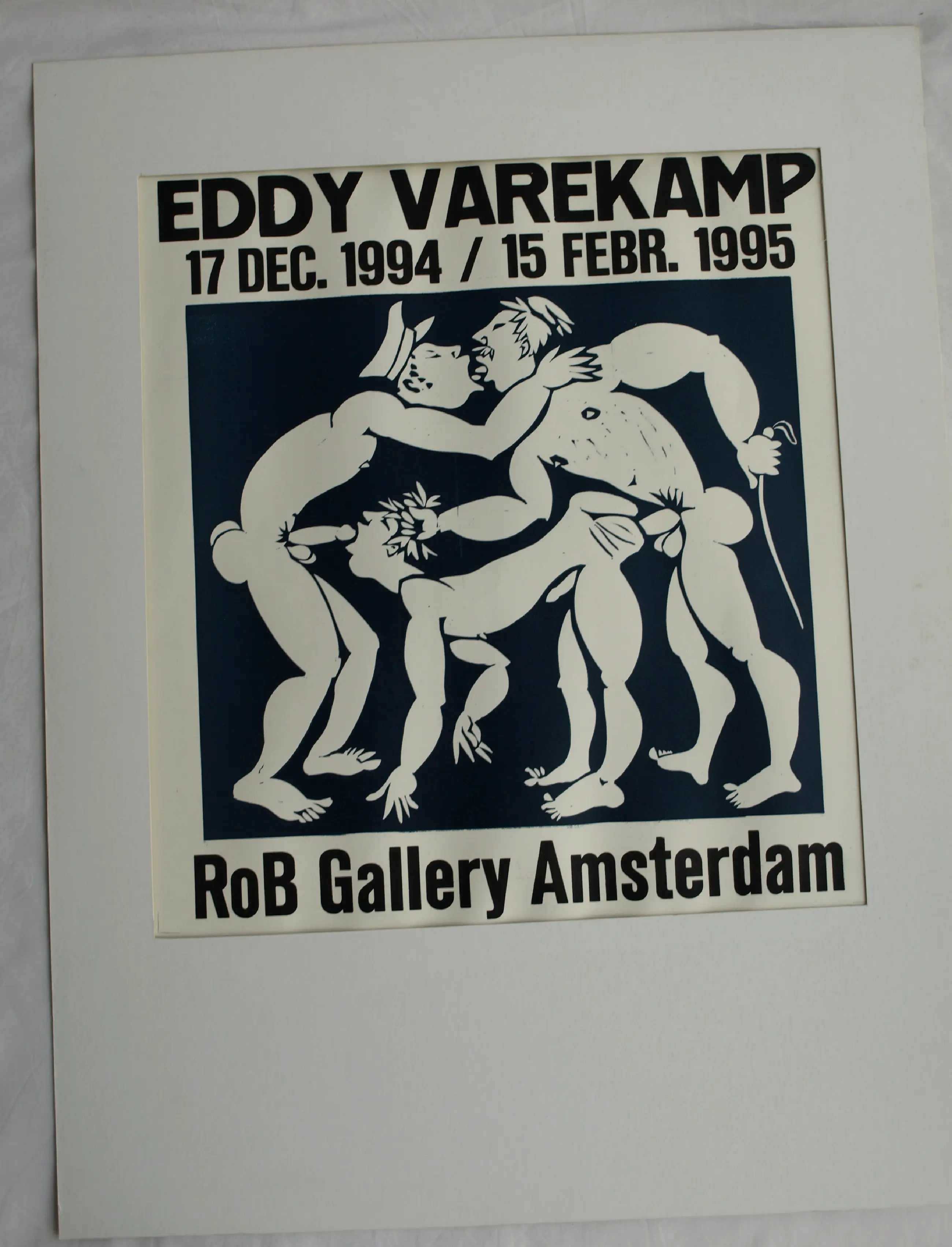 Een tentoonstellings-affiche uit 1994 met een afdruk van een linosnede van de Amsterdamse kunstenaar Eddy Varekamp (1949), ter gelegenheid van een expositie van werk van de kunstenaar in Rob Gallery Amsterdam. Deze expositie was van 17 december 1994 tot 15 februari 1995.