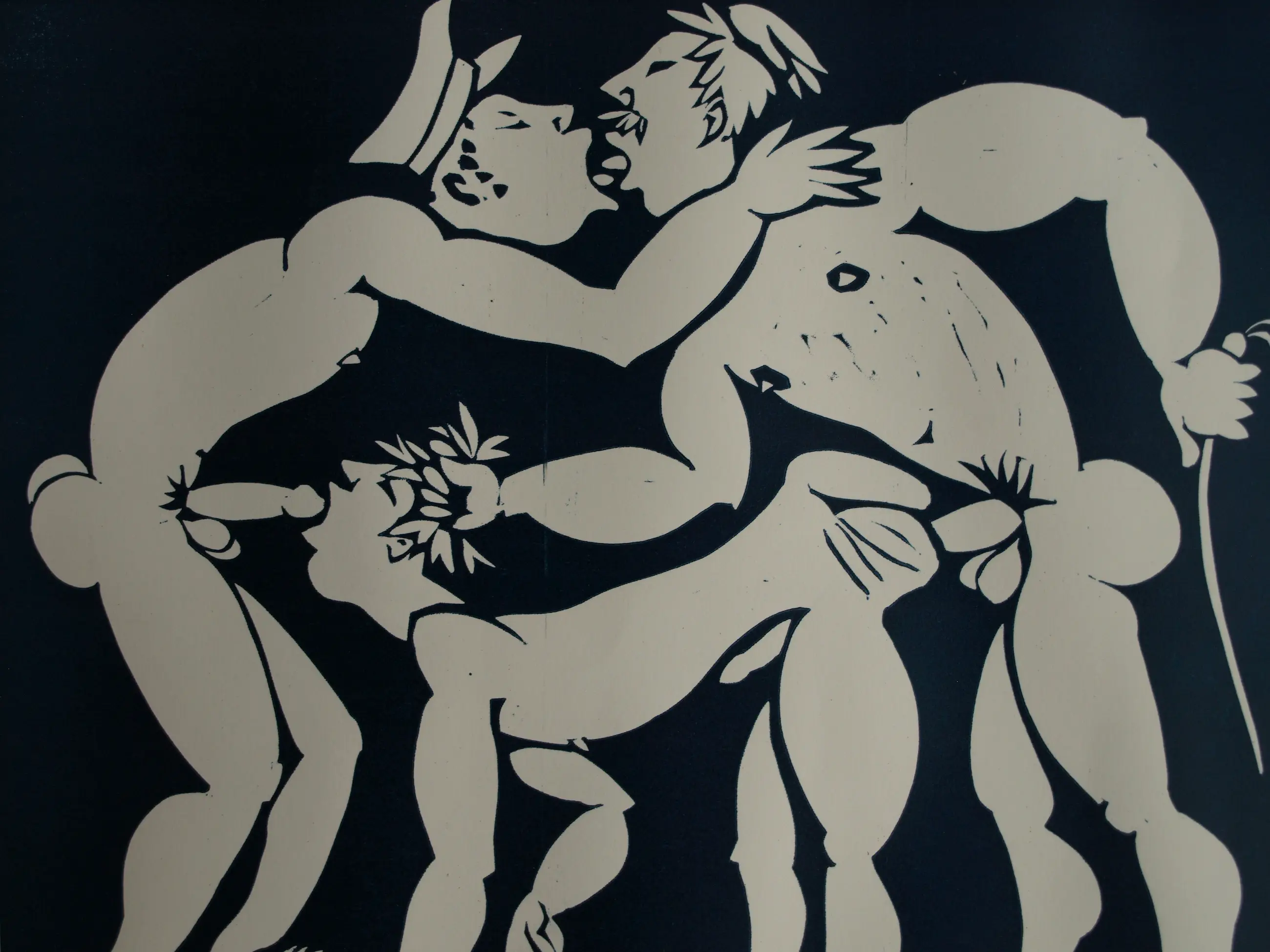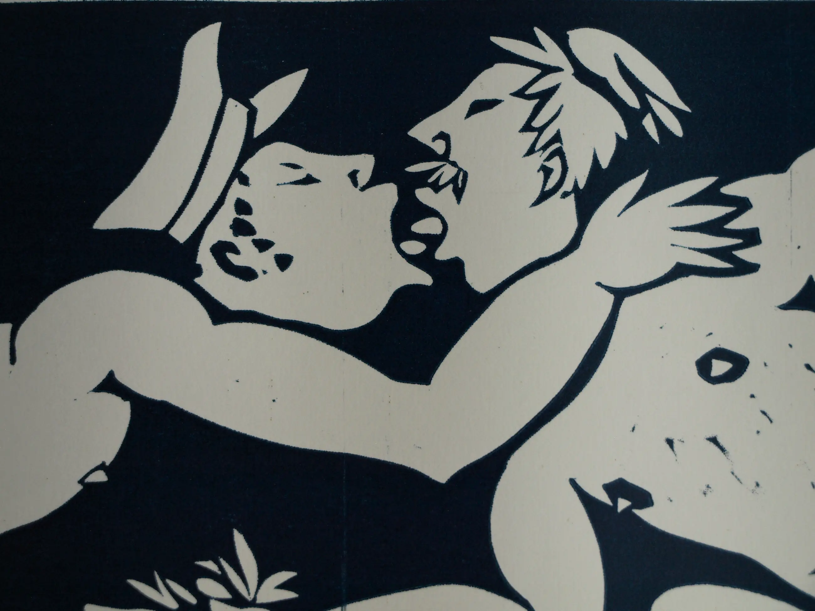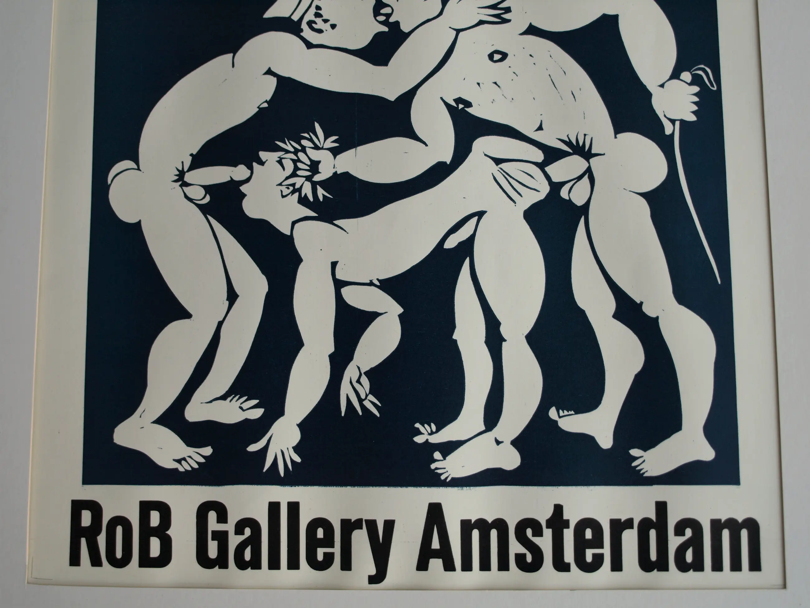 Een tentoonstellings-affiche uit 1994 met een afdruk van een linosnede van de Amsterdamse kunstenaar Eddy Varekamp (1949), ter gelegenheid van een expositie van werk van de kunstenaar in Rob Gallery Amsterdam. Deze expositie was van 17 december 1994 tot 15 februari 1995.