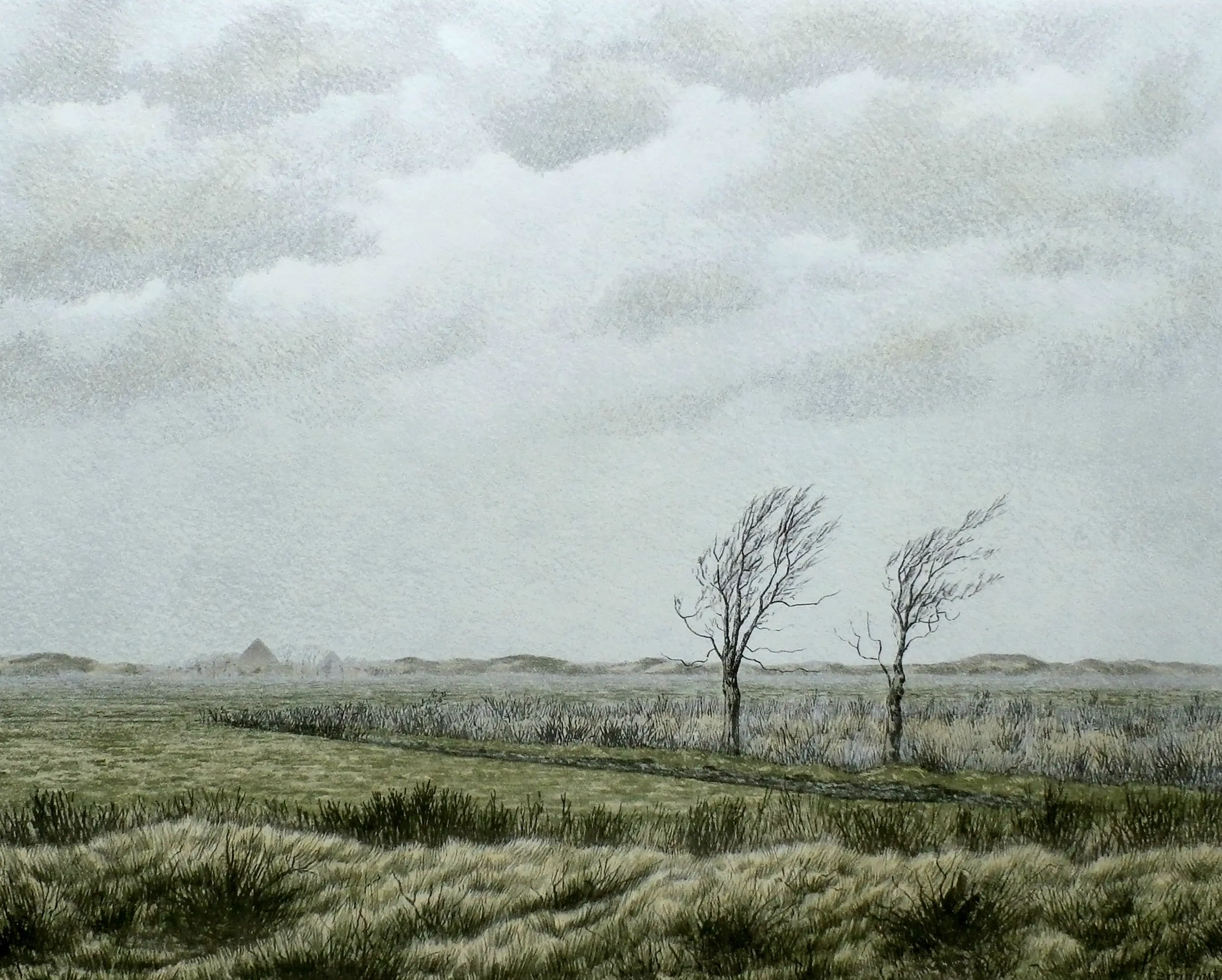 Kleurenlitho van Edgar Fernhout. Titel: Noord Hollands landschap. Afmetingen blad: H47.5 x b63 cm. Afmetingen voorstelling: H35 x b44 cm. Het werk is rechts onderaan in de druk gesigneerd.
