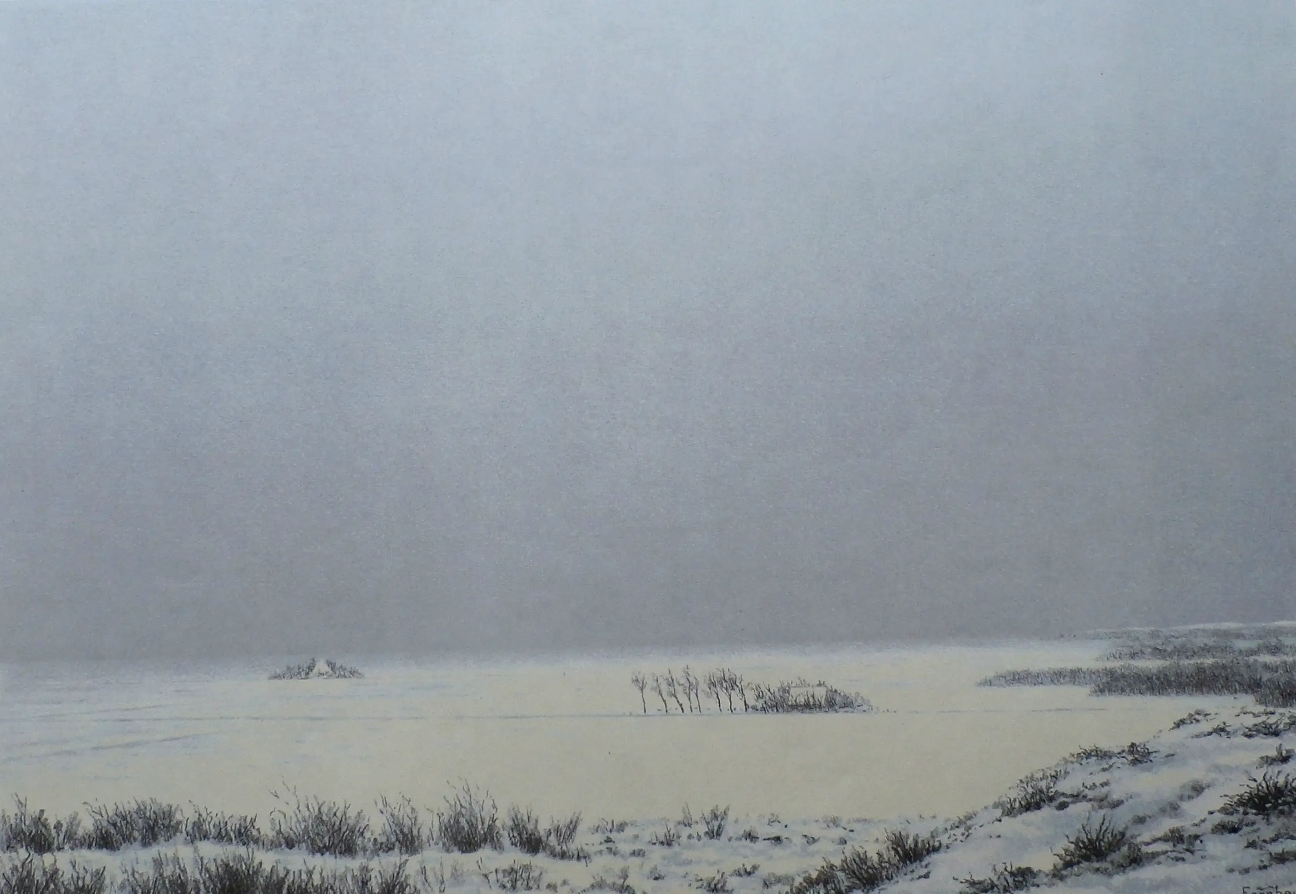Kleurenlitho van Edgar Fernhout. Titel: Winters landschap. Afmetingen blad: H48 x b63 cm. Afmetingen voorstelling: H34 x b47.5 cm. Het werk is rechtsonder in de druk gesigneerd.