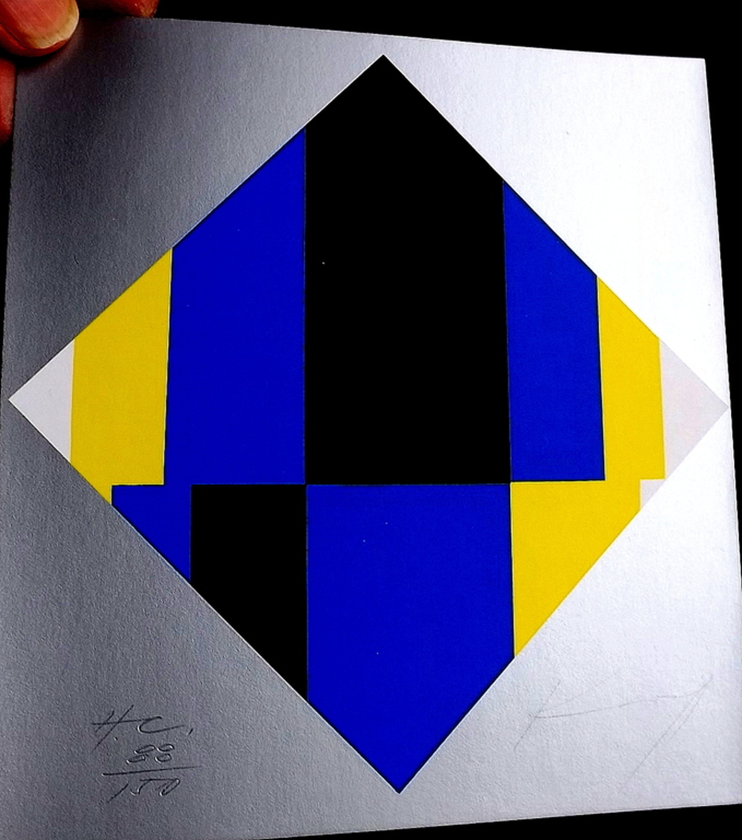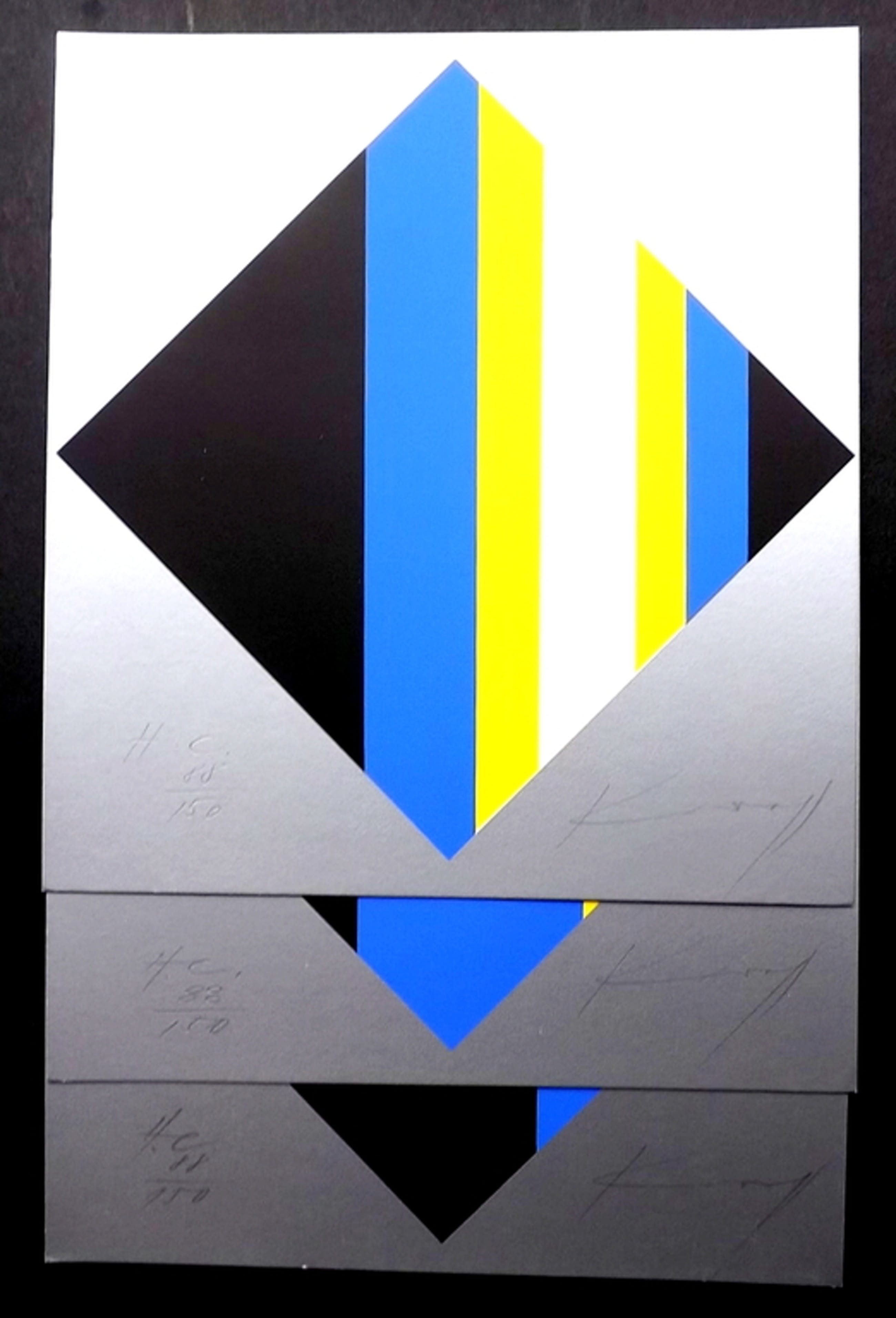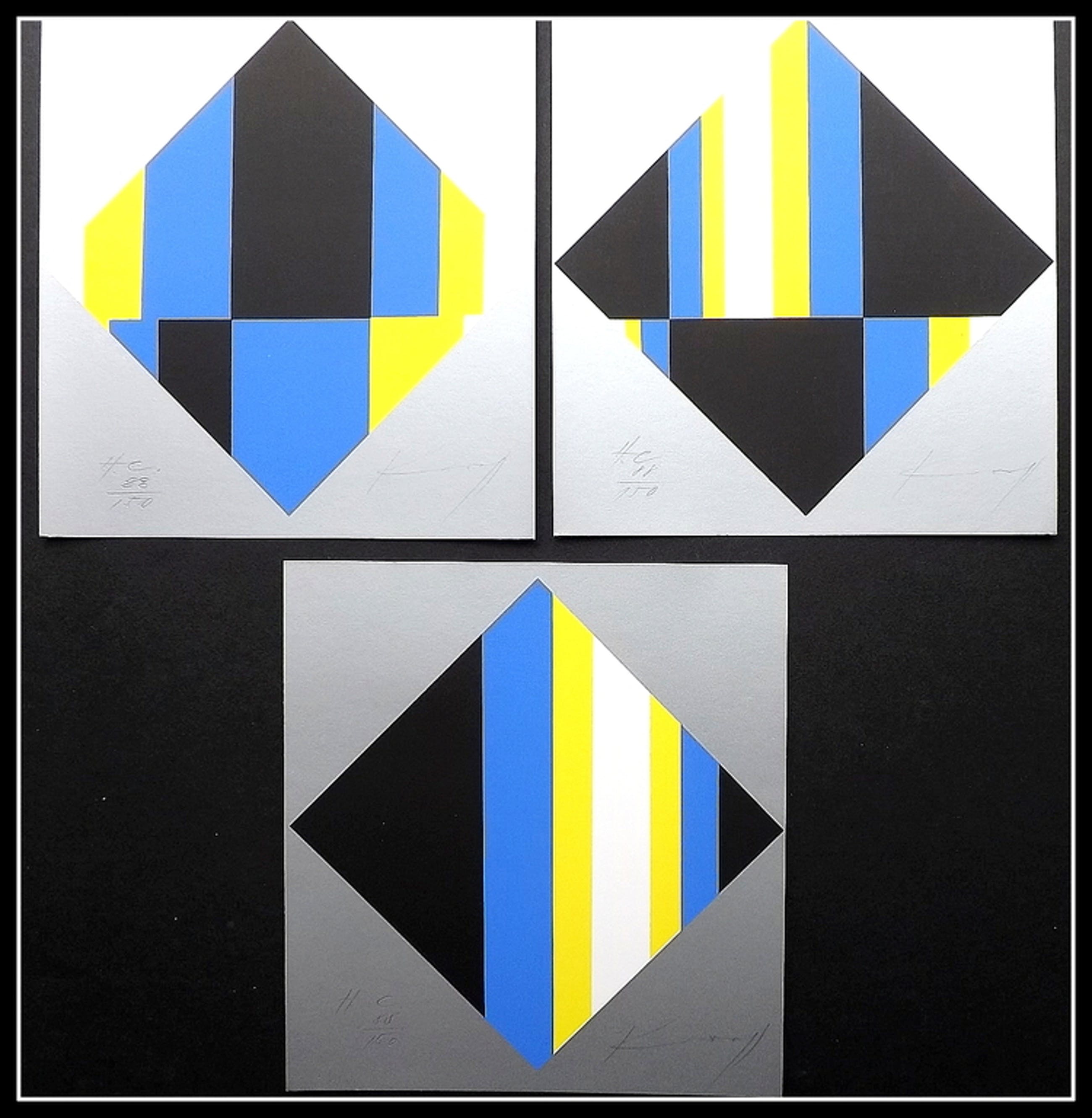 Van deze Duitse kunstenaar wordt zelden werk aangeboden. De 3 litho's zijn afgedrukt in heldere kleuren op glanzend kartonachtig papier.