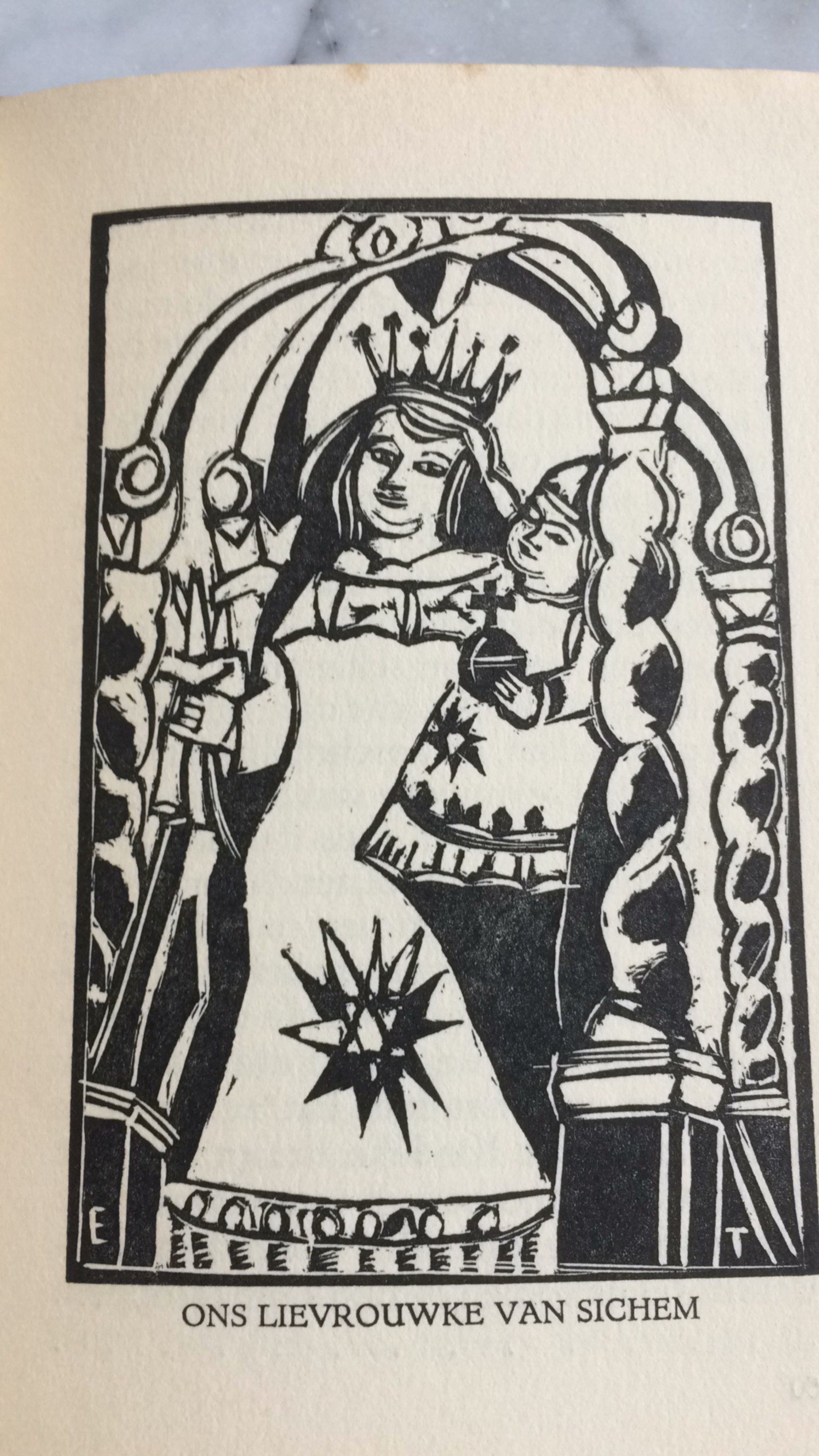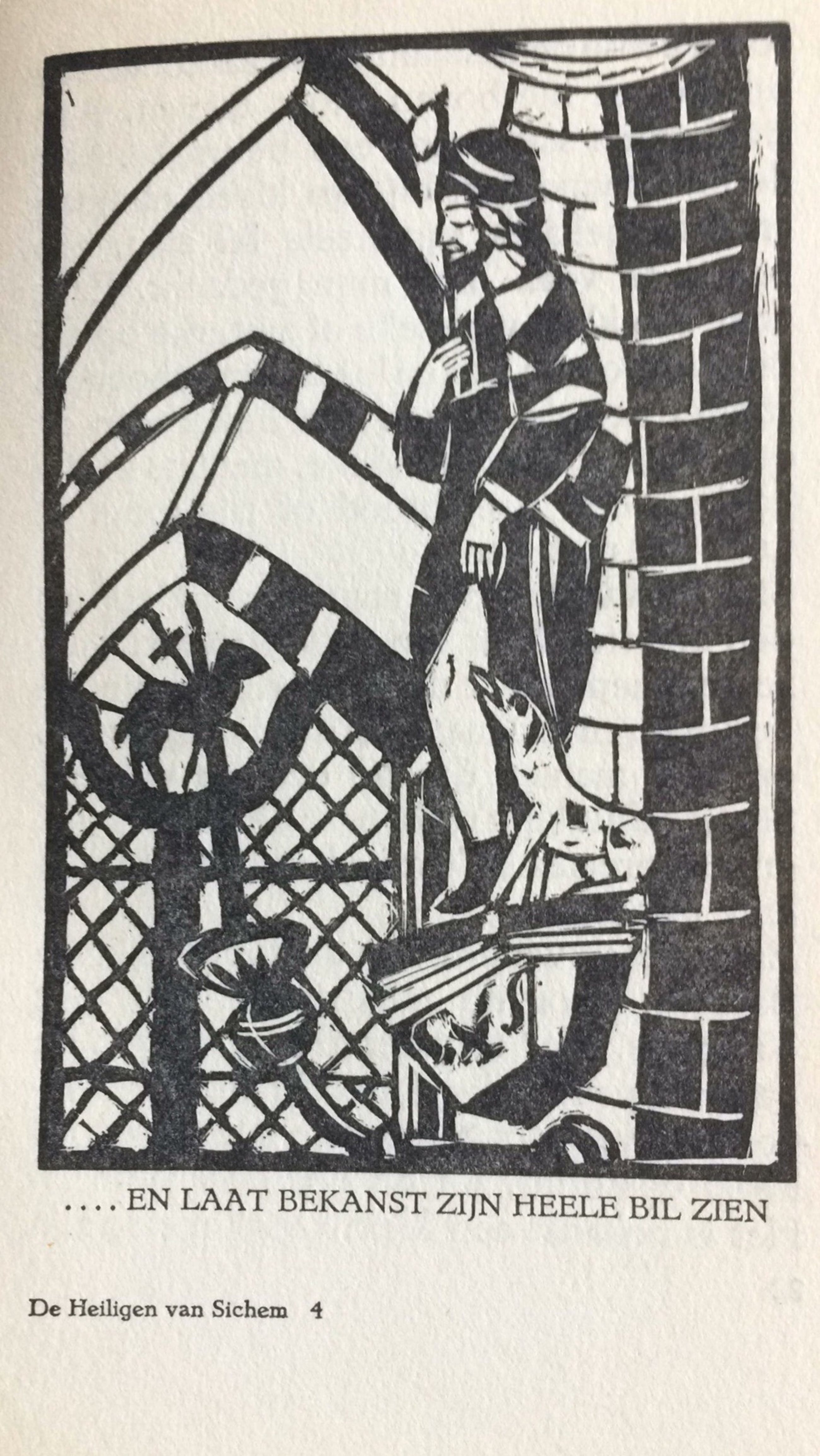 Vier in de plaat gesigneerde hout- snedes van Edgar Tijtgat. De bekende kunstenaar Tijtgat maakte deze houtsnedes voor de uitgave ‘ De heiligen van Sichem ‘. De uitgave is de tweede druk van deze vertelling. De houtsnedes werden door Tijtgat voor deze uitgave gemaakt rond 1930. Het boekje verscheen bij se WB in 1932. Het is uiteraard aan de koper om te kiezen voor de kunstwerken te behouden in het boekje waarvoor zij gemaakt zijn of inlijsting. Verzending per PostNL. ( k.k. )