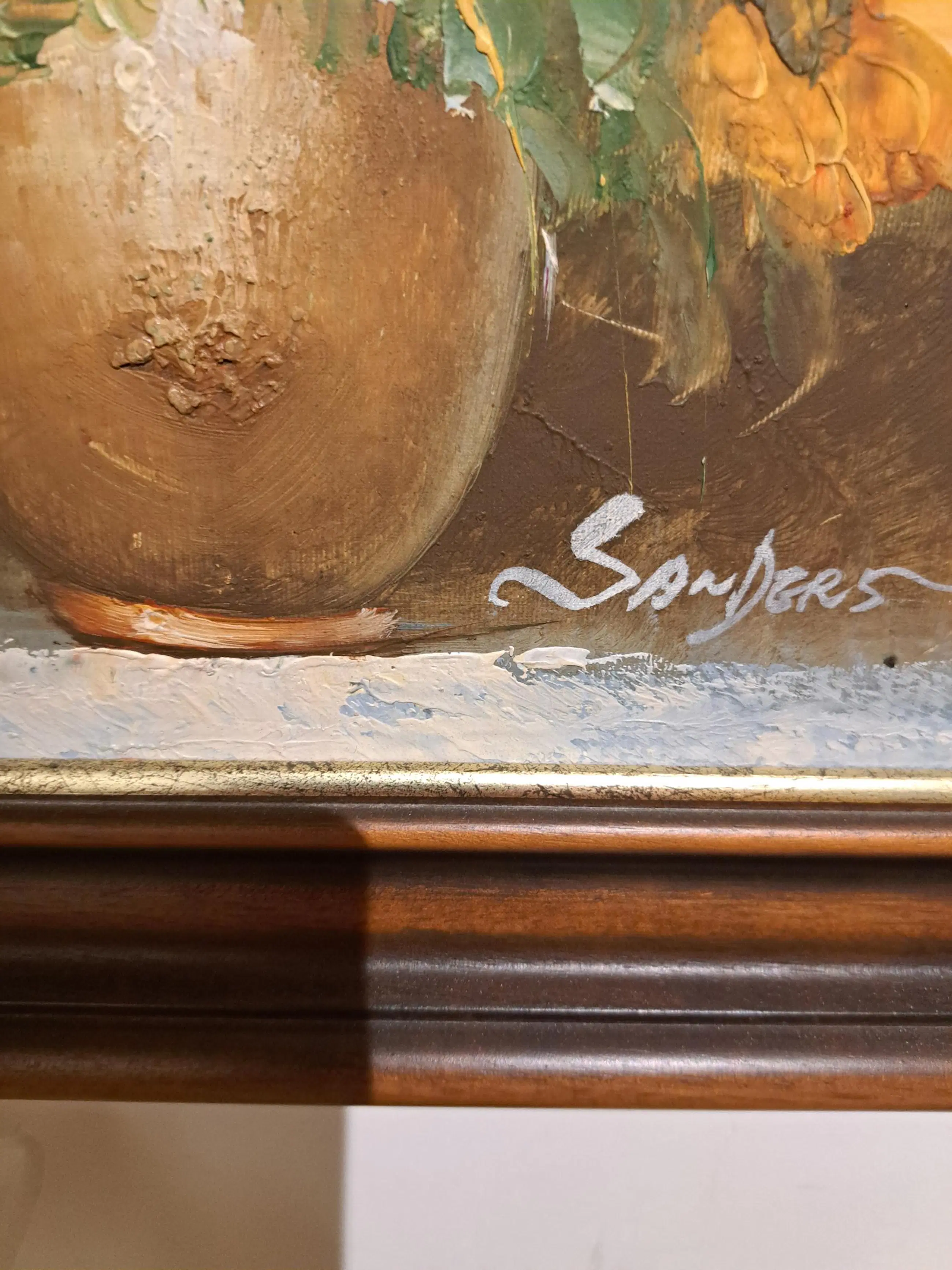 Edmond Sanders - Stilleven met zonnebloemen in bolvormige, goudkleurige vaas