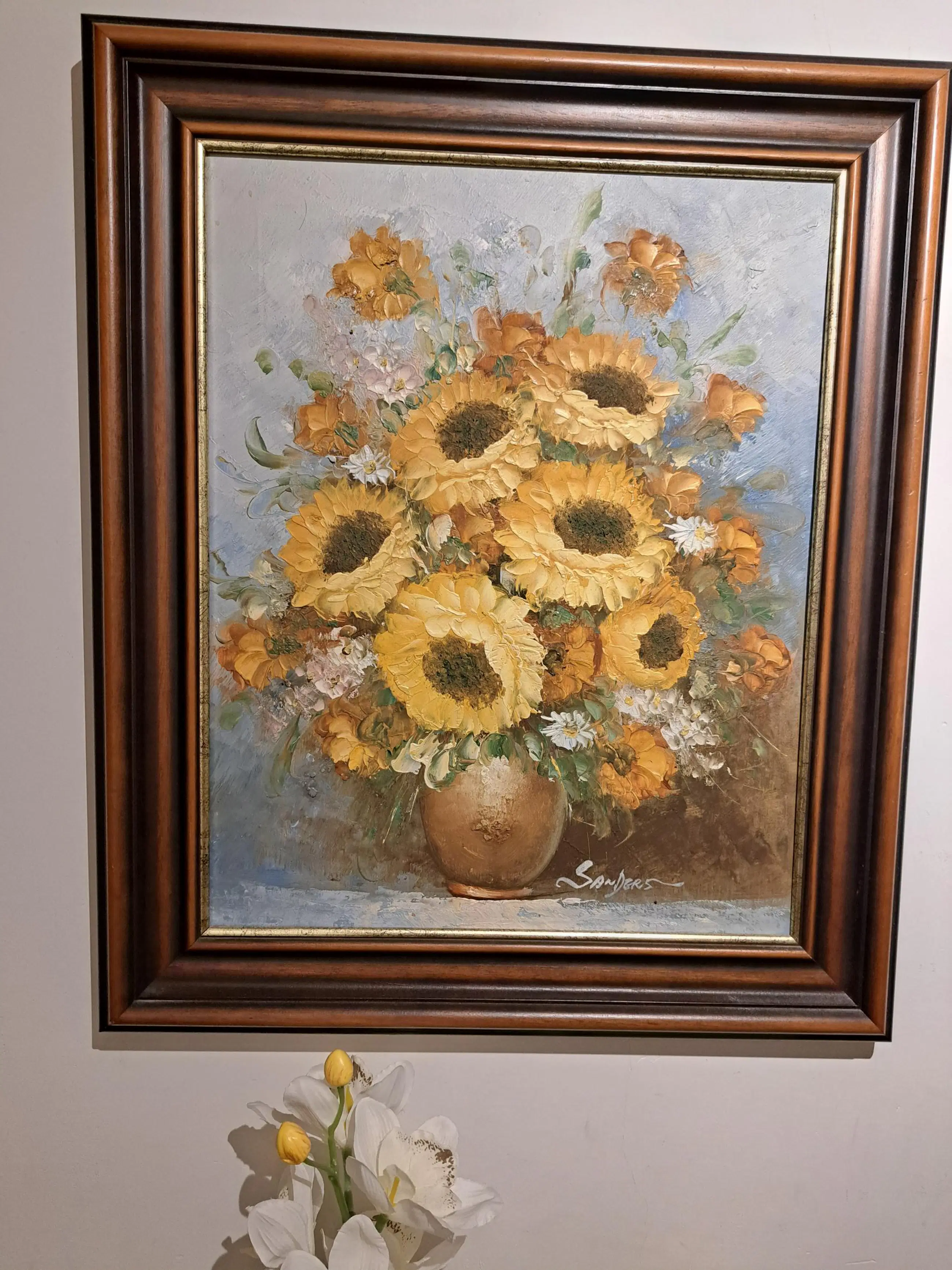 Fraai stilleven van boeket zonnebloemen in combinatie met wilde bloemen en takjes groen, in een bolvormige, goudkleurige vaas, hand gesigneerd zonder jaartal