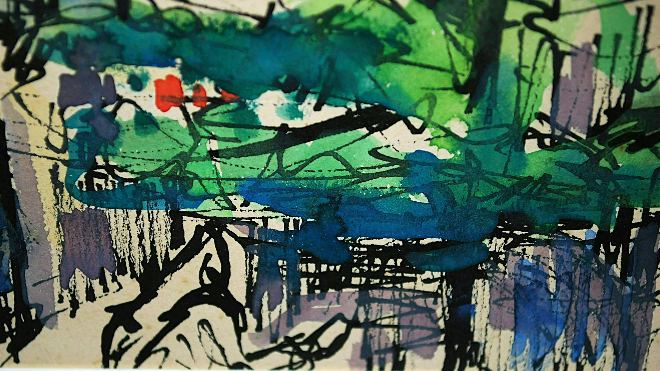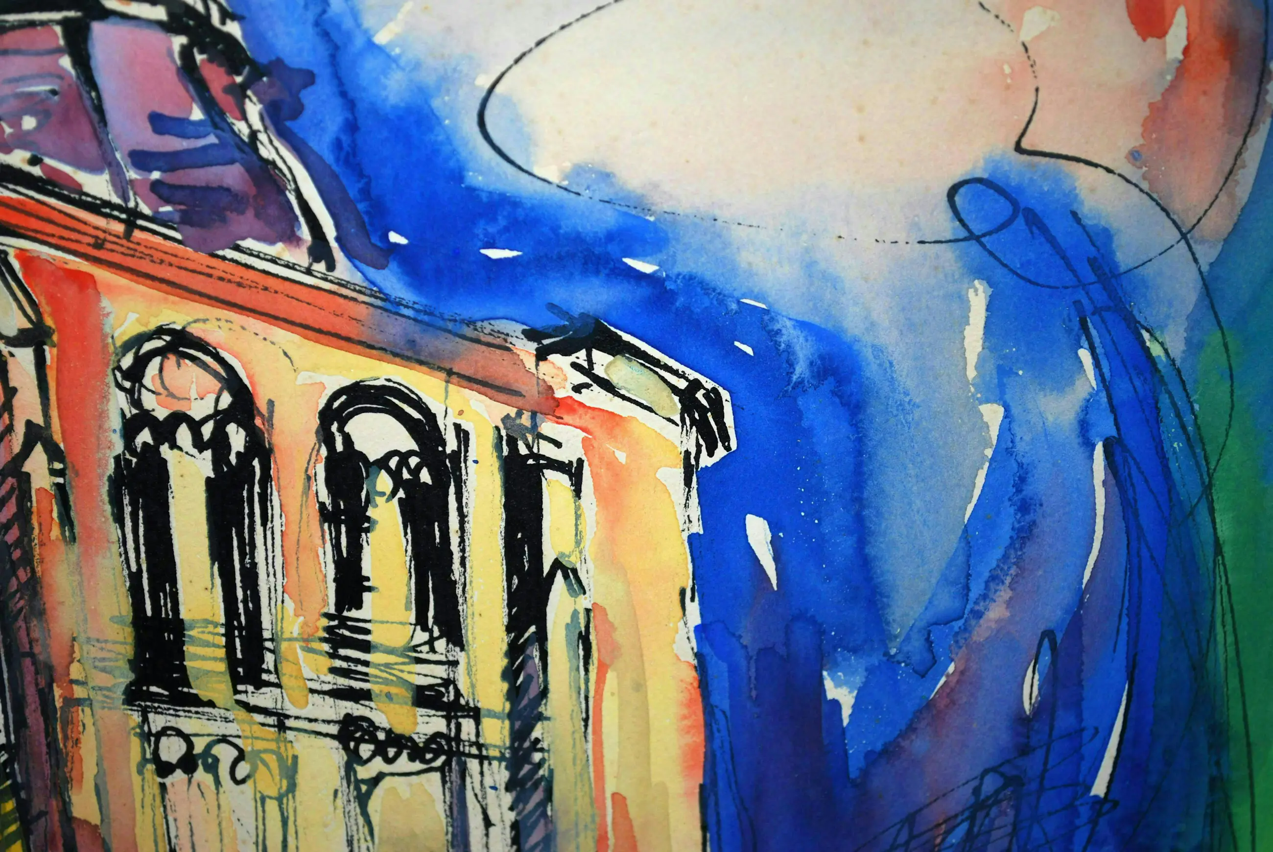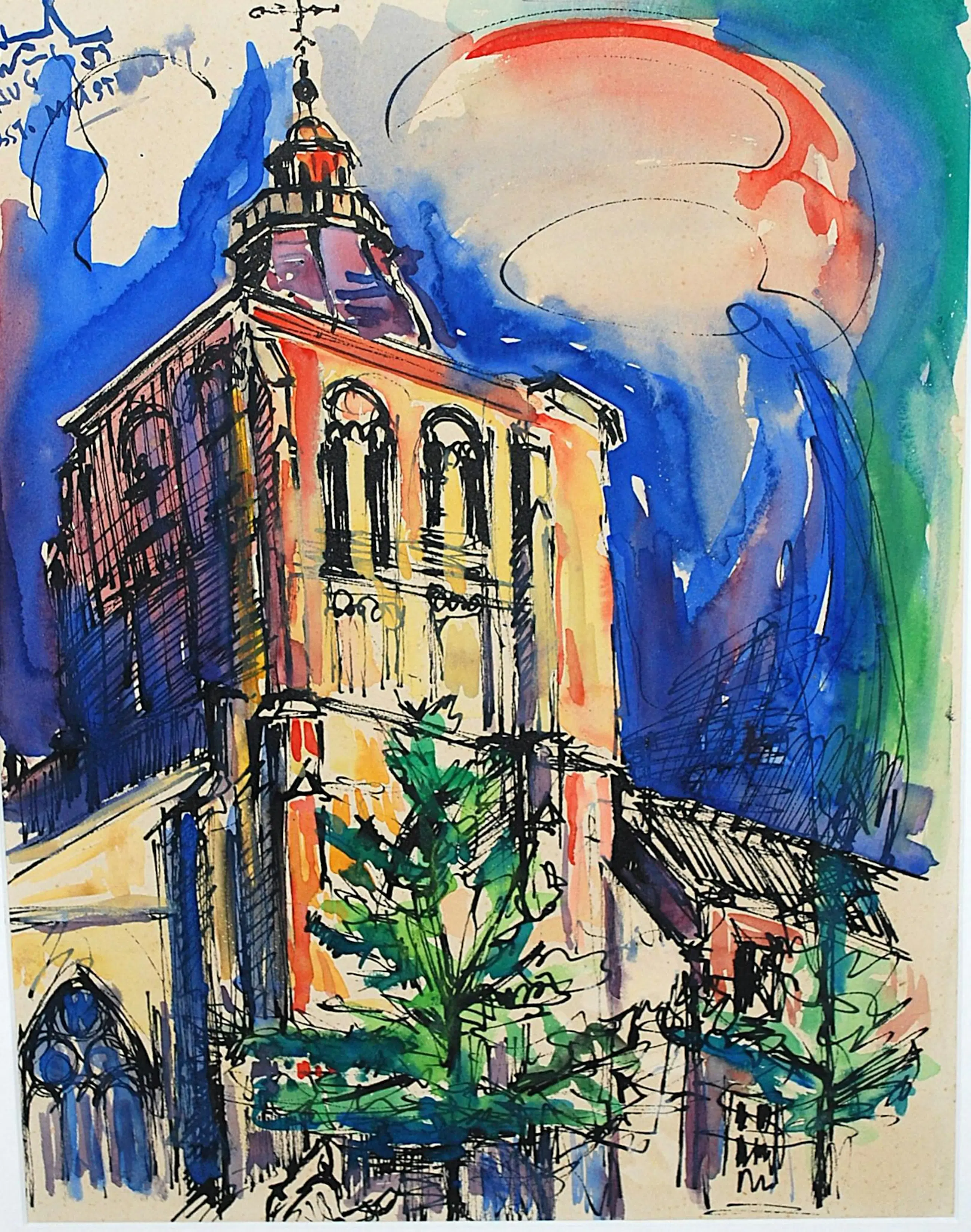 Een fraai kunstwerk van Edmond Wingen. Voorstelling: de Hervormde Matthiaskerk in de Boschstraat te Maastricht. Inkt en aquarel op papier, aug. 1955. Achter een helder passepartout en glas. In een mooie kwaliteit houten lijst.