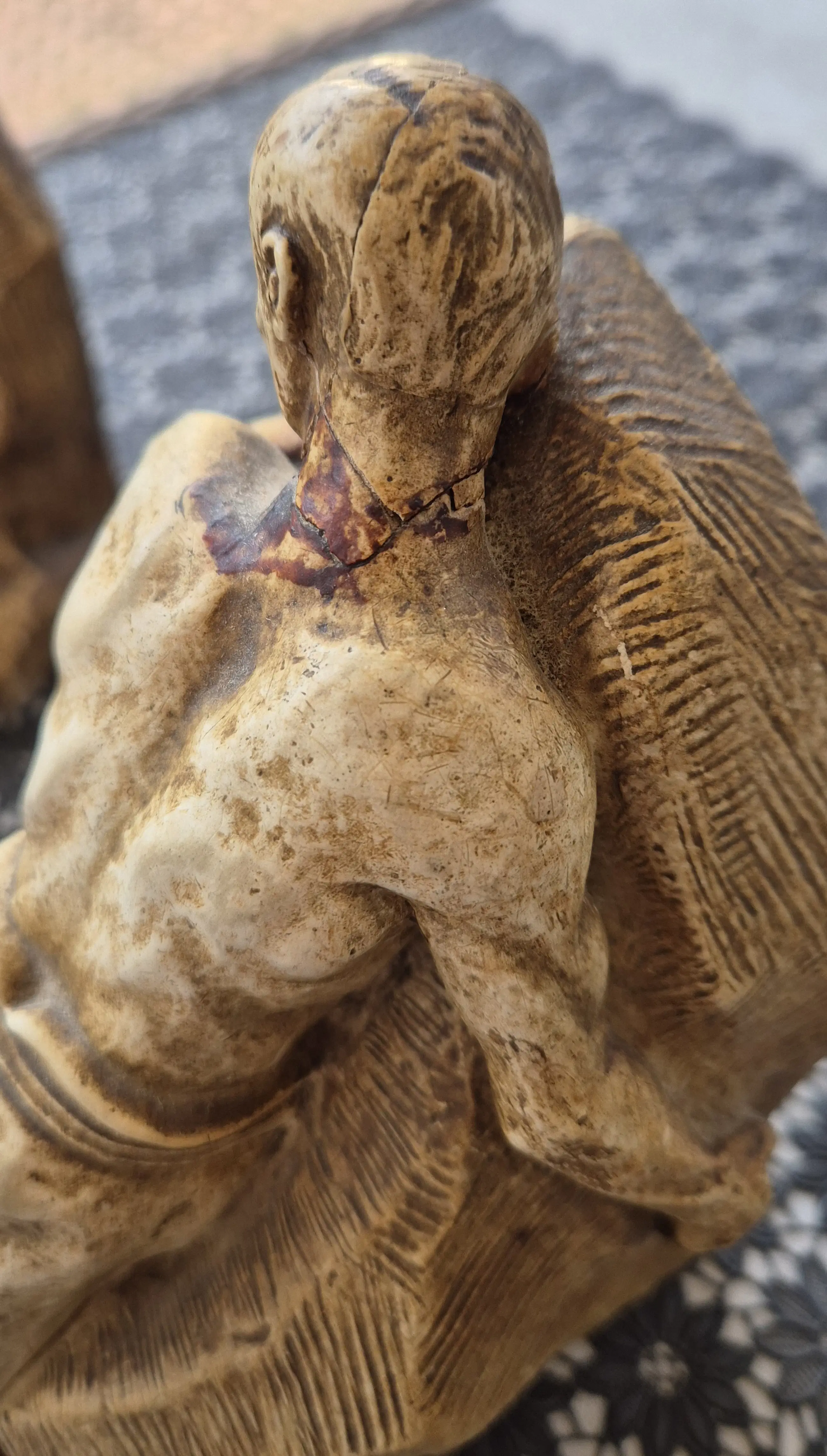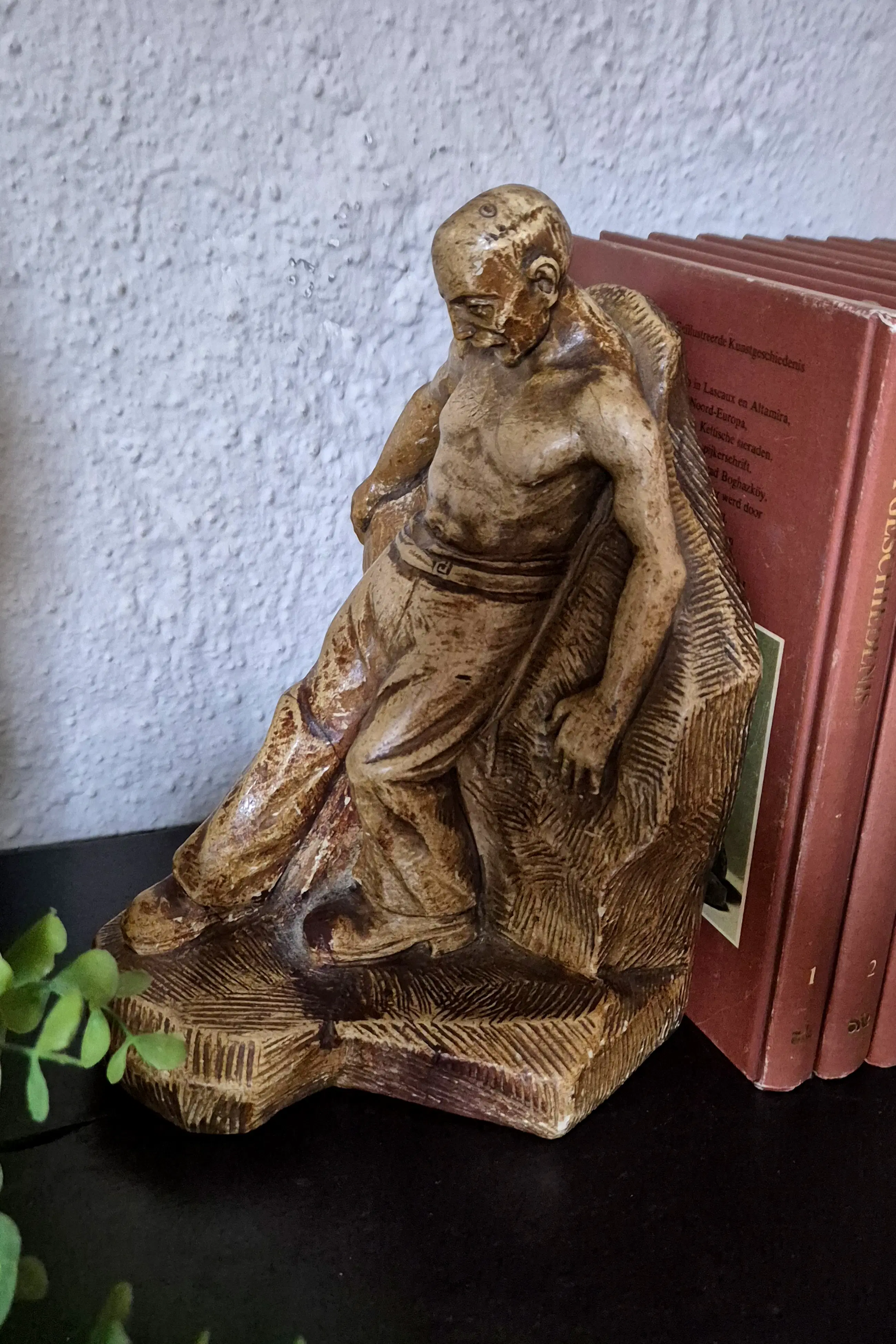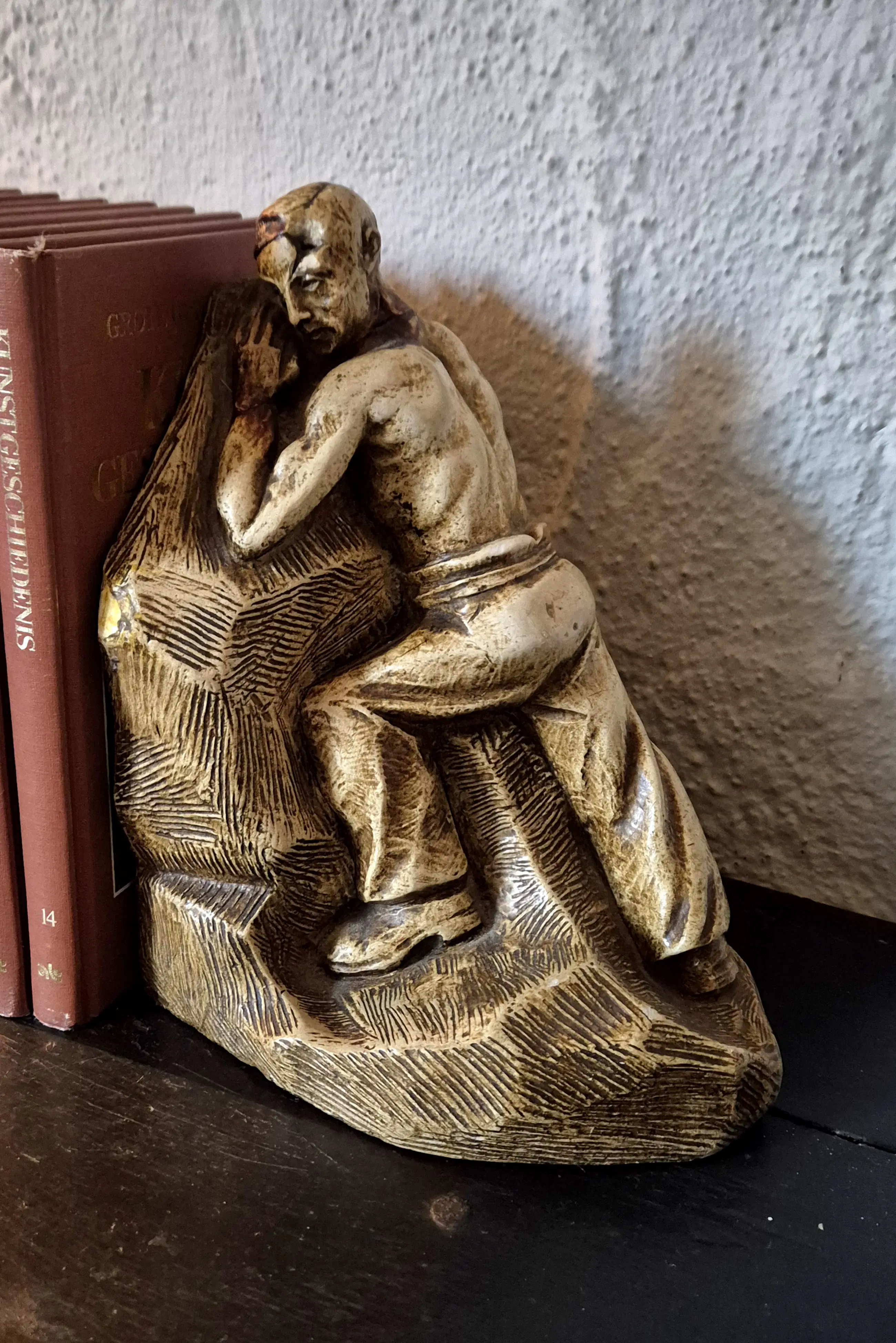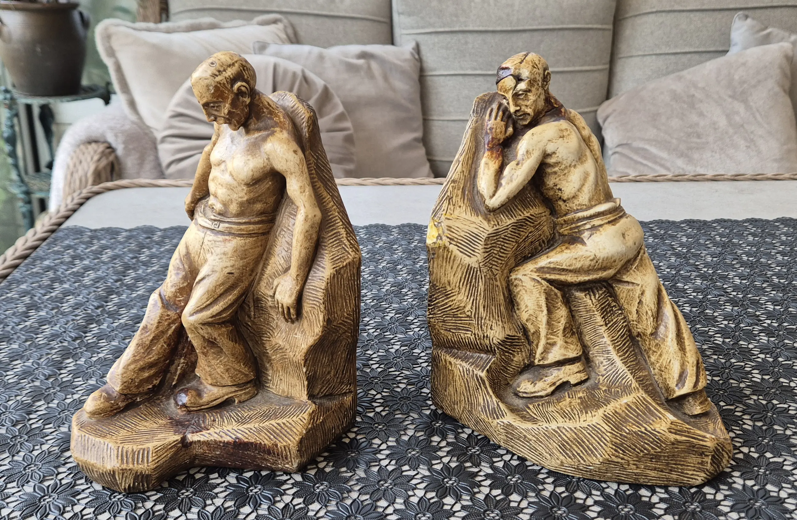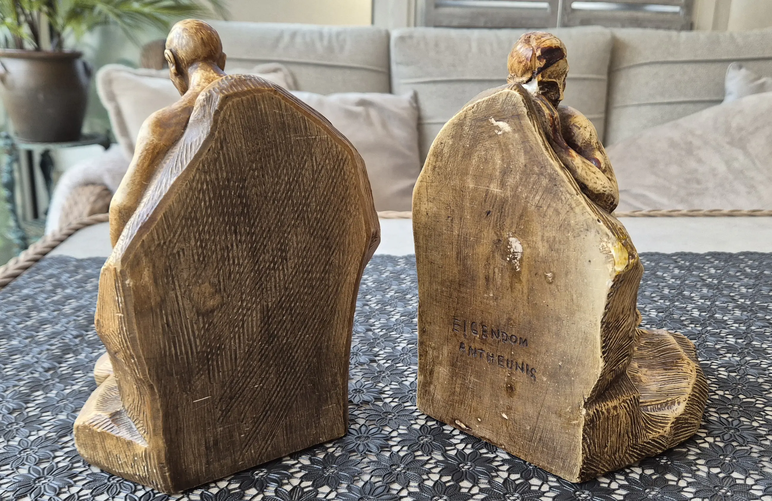 Twee prachtige boeksteunen. Mooie staat, maar de rechter steun heeft een duidelijke breuk bij het hoofd die matig gerepareerd is. Zie foto's. Op een afstandje valt het echter niet meteen op gezien de kleurstelling. Kan waarschijnlijk eenvoudig bijgewerkt worden door een restaurateur. De linker steun is onbeschadigd en in uitstekende staat. Mooie en zeldzame set van deze bijzondere kunstenaar.