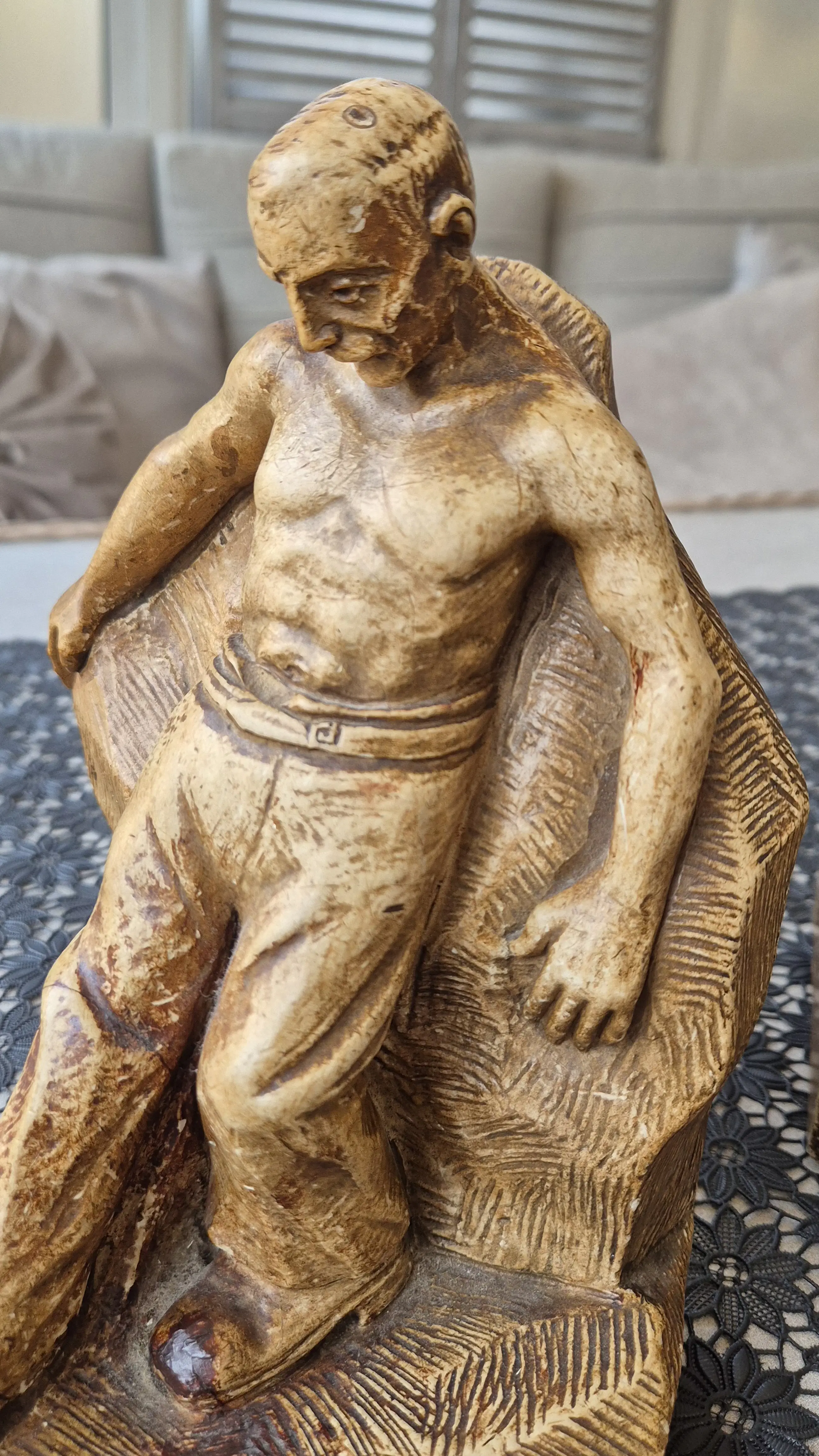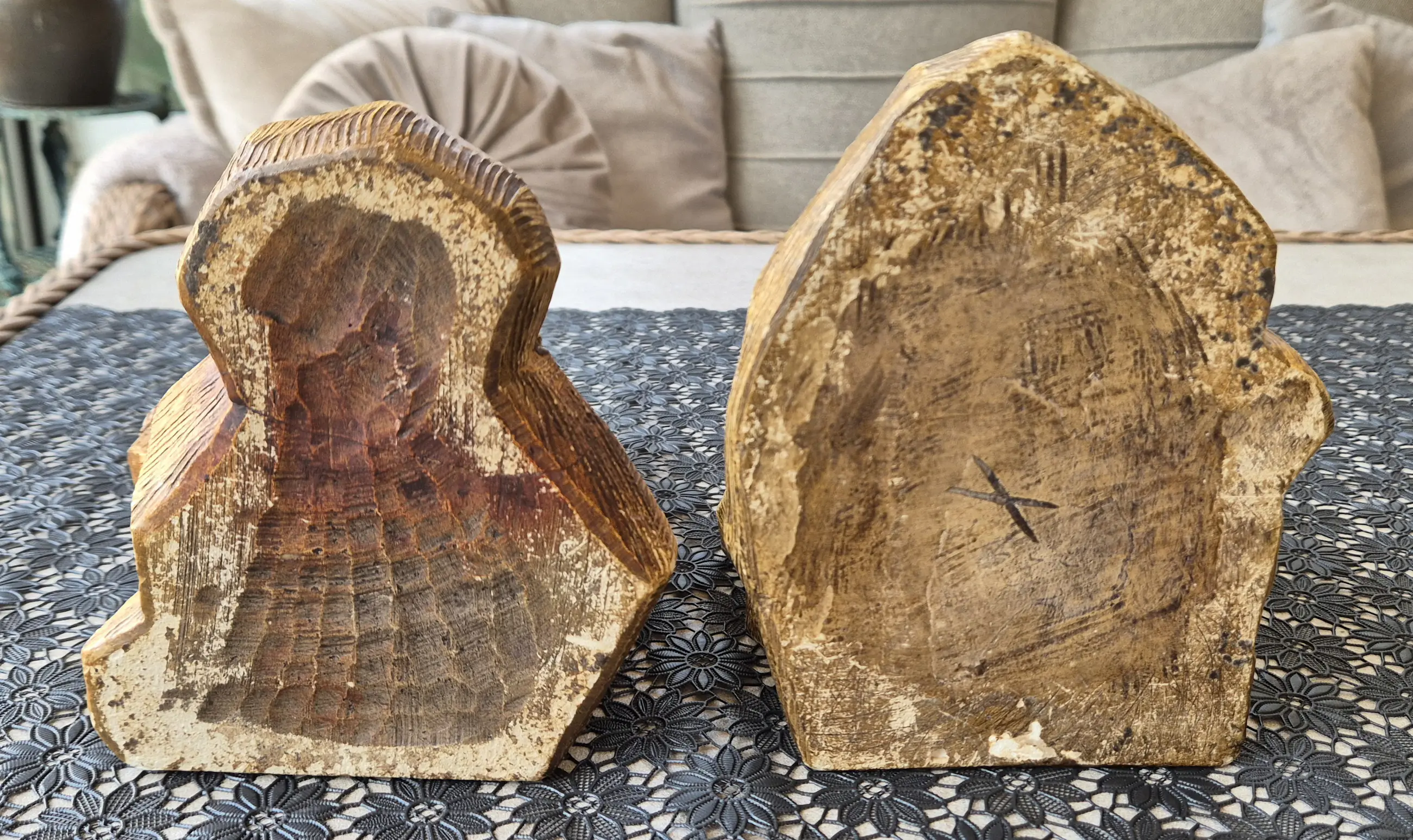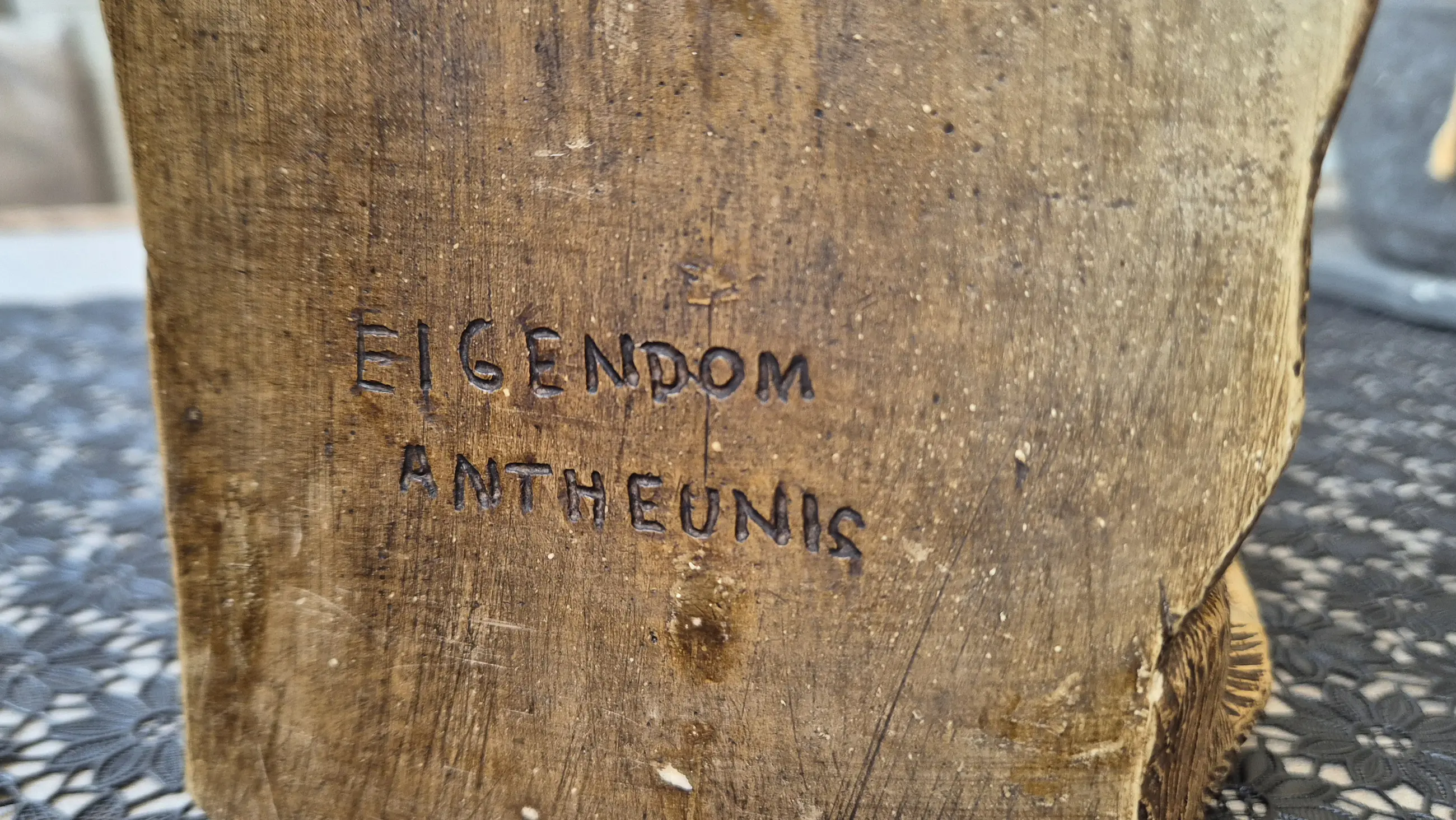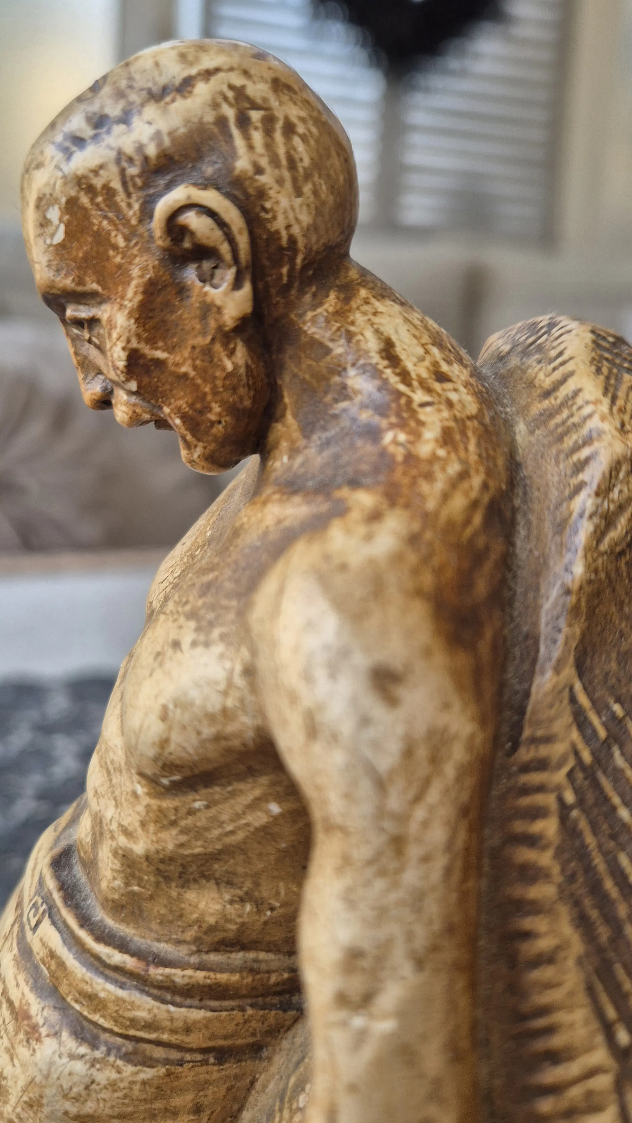 Twee prachtige boeksteunen. Mooie staat, maar de rechter steun heeft een duidelijke breuk bij het hoofd die matig gerepareerd is. Zie foto's. Op een afstandje valt het echter niet meteen op gezien de kleurstelling. Kan waarschijnlijk eenvoudig bijgewerkt worden door een restaurateur. De linker steun is onbeschadigd en in uitstekende staat. Mooie en zeldzame set van deze bijzondere kunstenaar.