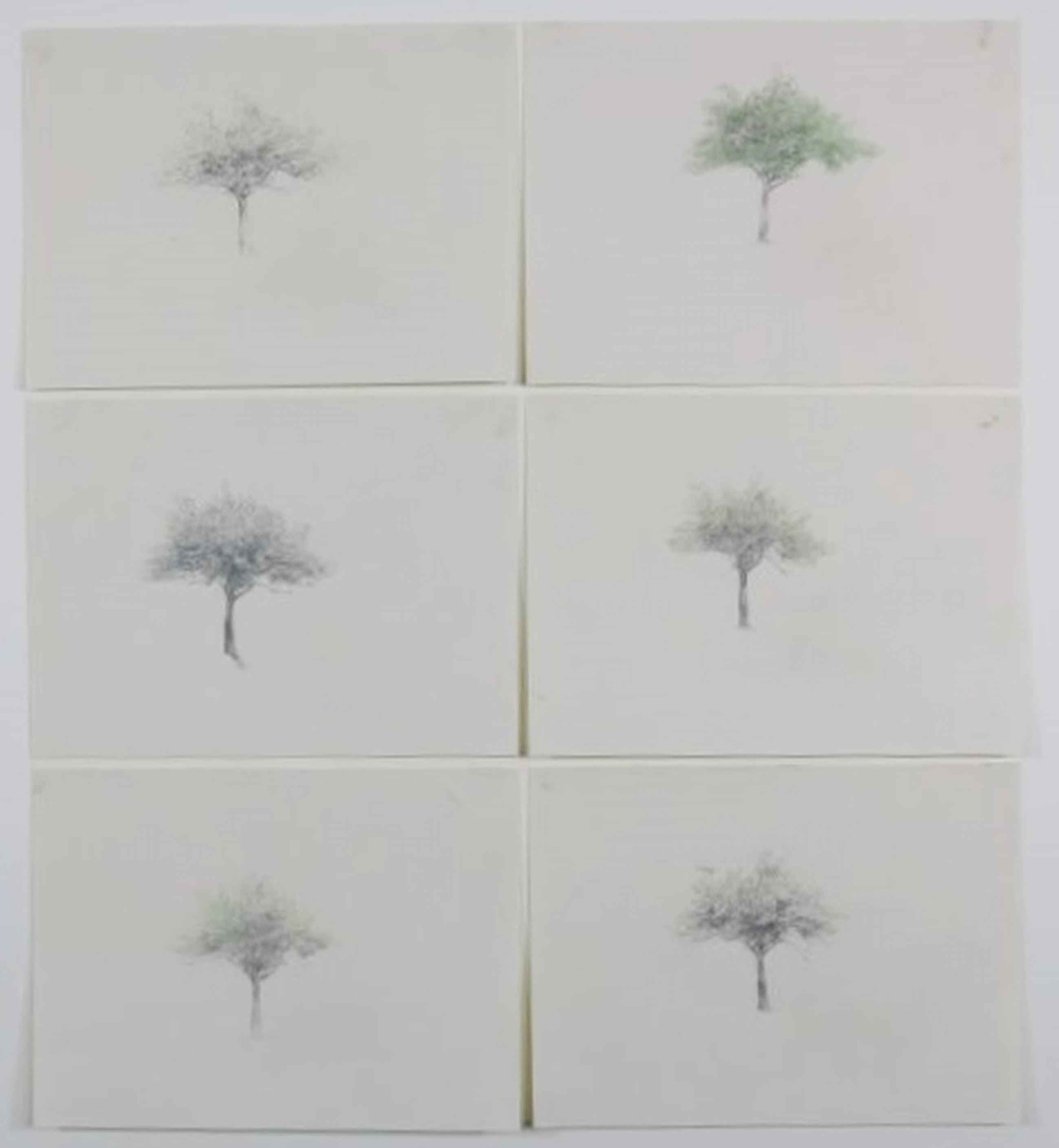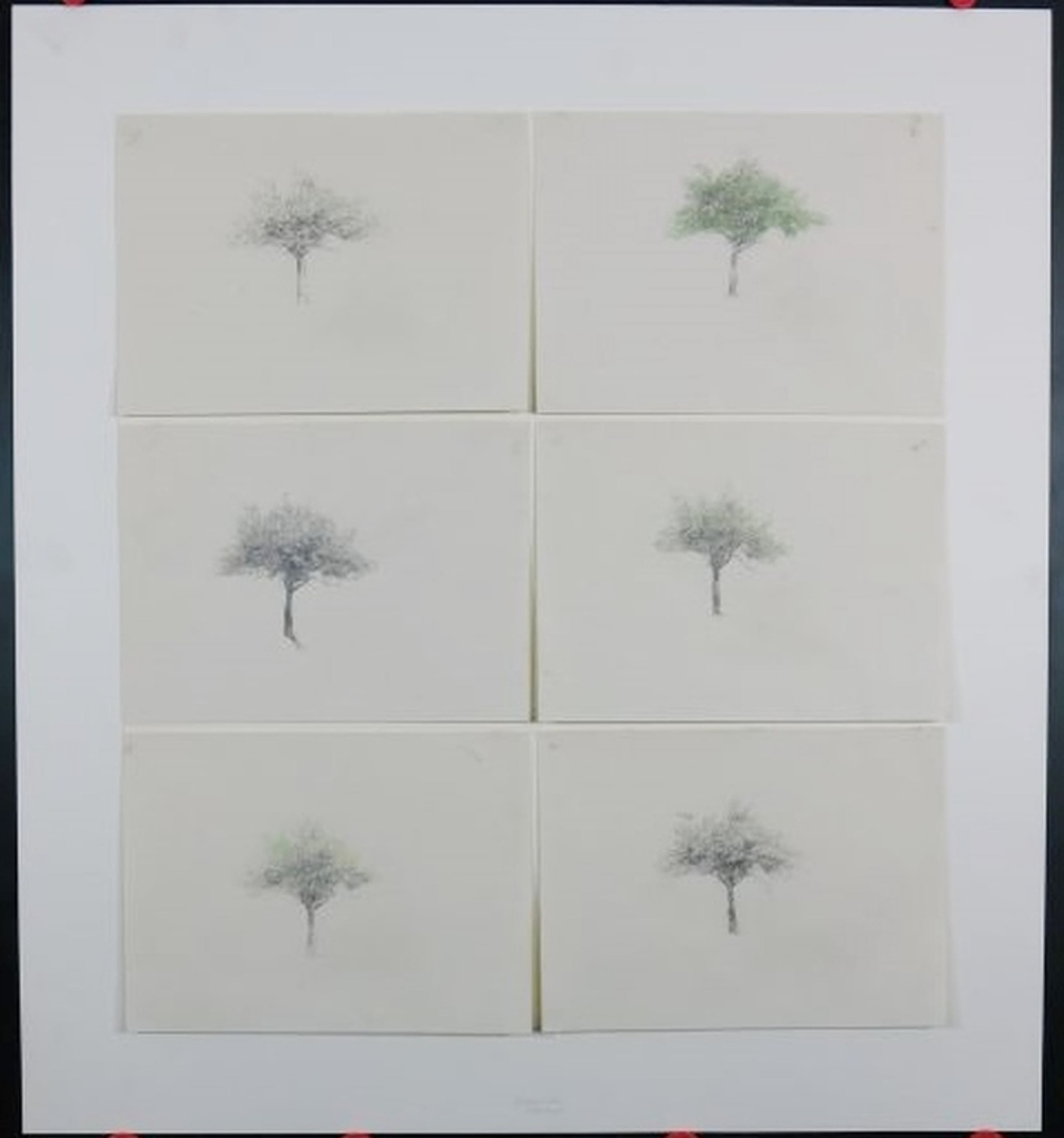 Materiaal: Zes tekeningen op geschept papier, bevestigd op board