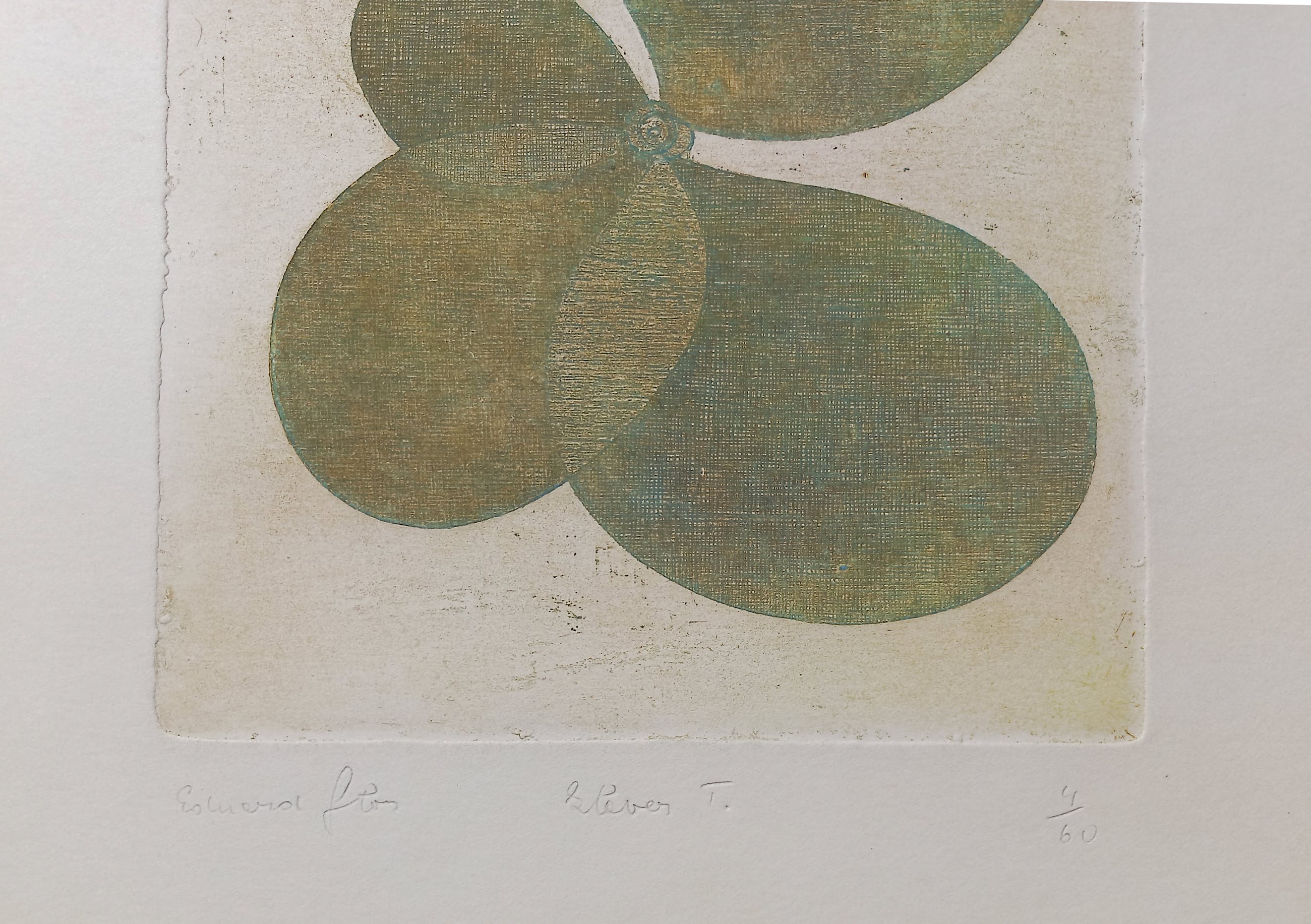 Karakteristiek, fijn werk van Eduard Flor. Aquatint ets op dik papier, met potlood gesigneerd, getiteld en genummerd (4/60). In goede conditie; blad heeft ingelijst gezeten en er is een verkleuring van een vorig passe-partout. Ingelijst met iets strakker passe-partout is het werk zeer goed.
