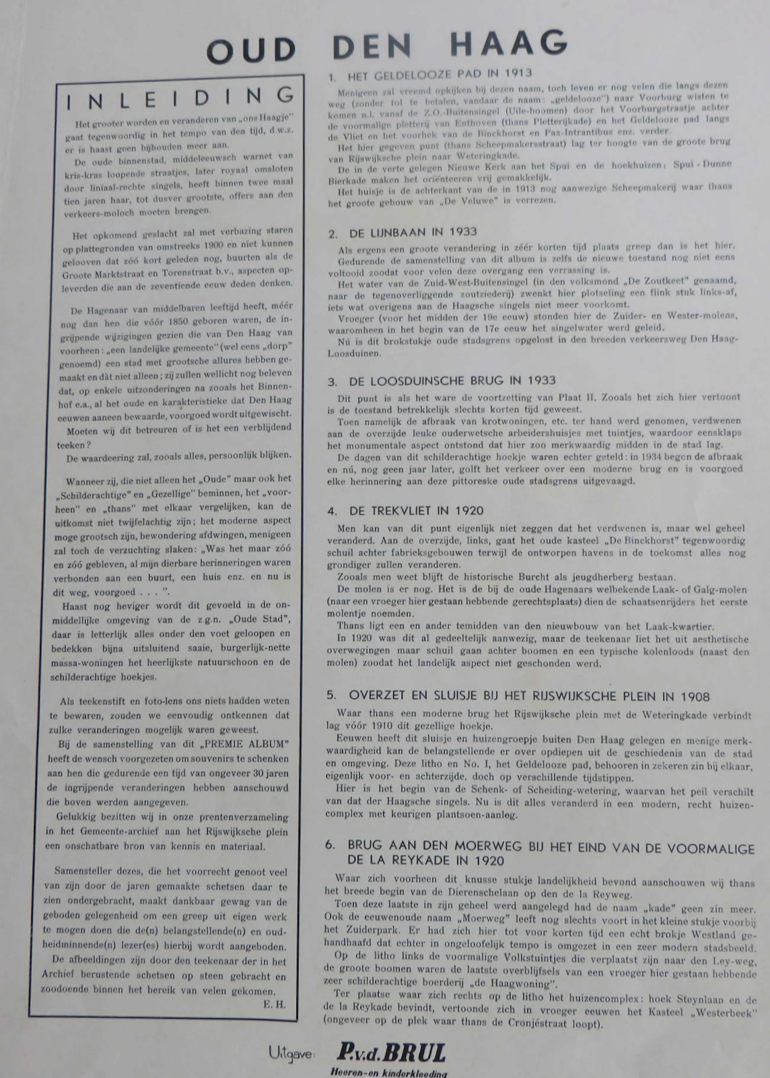 Historisch mapje met zes fraaie litho's met bijpassende tekst over de volgende locaties: Het Geldelooze pad in 1913,De Lijnbaan in 1933,De Loosduinsche Brug in 1933,De Trekvliet in 1920,Overzet en sluisje bij het Rijkswijksche Plein in 1908 en De brug aan de Moerweg bij het eind van de voormalige De La Reykade in 1920.De map heeft aan de randen wat slijtage.De litho's zijn in goede conditie.Twee (veiling ? ) nummers op de voorkant van de map.
