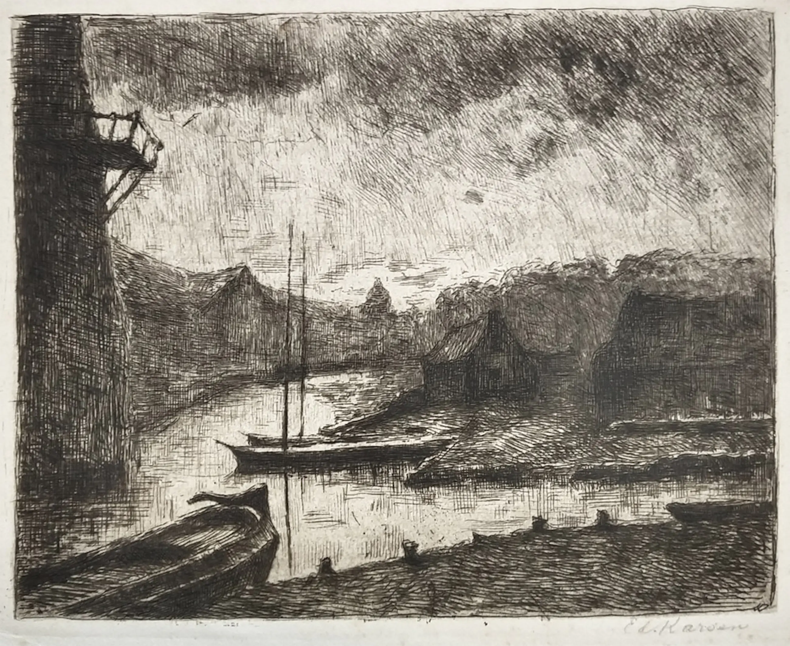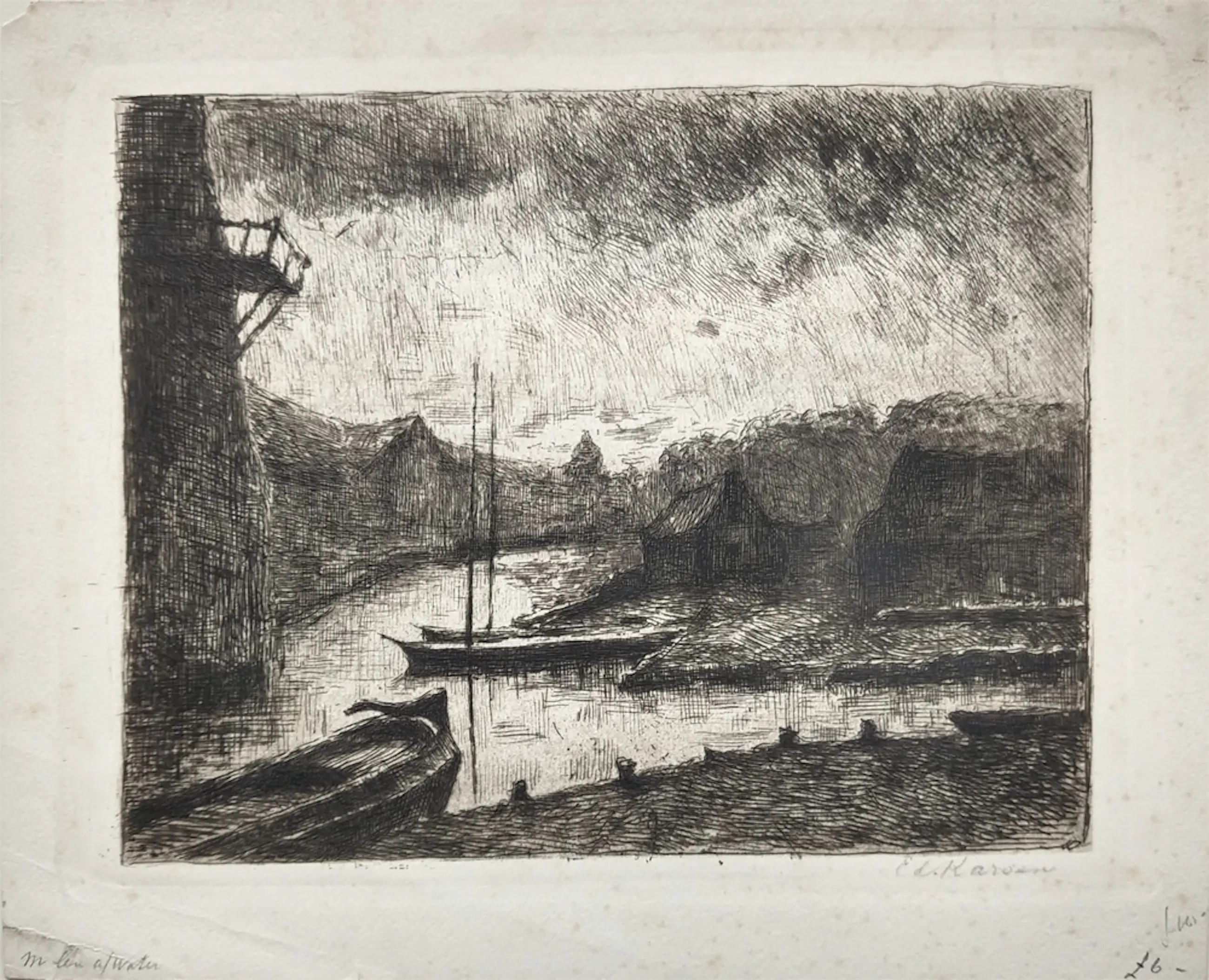 Ets van Eduard Karsen, getiteld ‘Molen aan water’. De ets is rechtsonder gesigneerd met ‘Ed. Karsen’. Het blad meet 22 centimeter hoog en 27 centimeter breed.