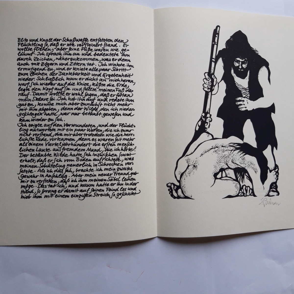 FALTBLATT MIT SIGNIERTEM ORIGINAL-LINOLSCHNITT VON EDUARD PRÜSSEN ZU DANIEL DEFOE . TEXT (KLISCHIERT) IN DER HANDSCHRIFT DES KÜNSTLERS.