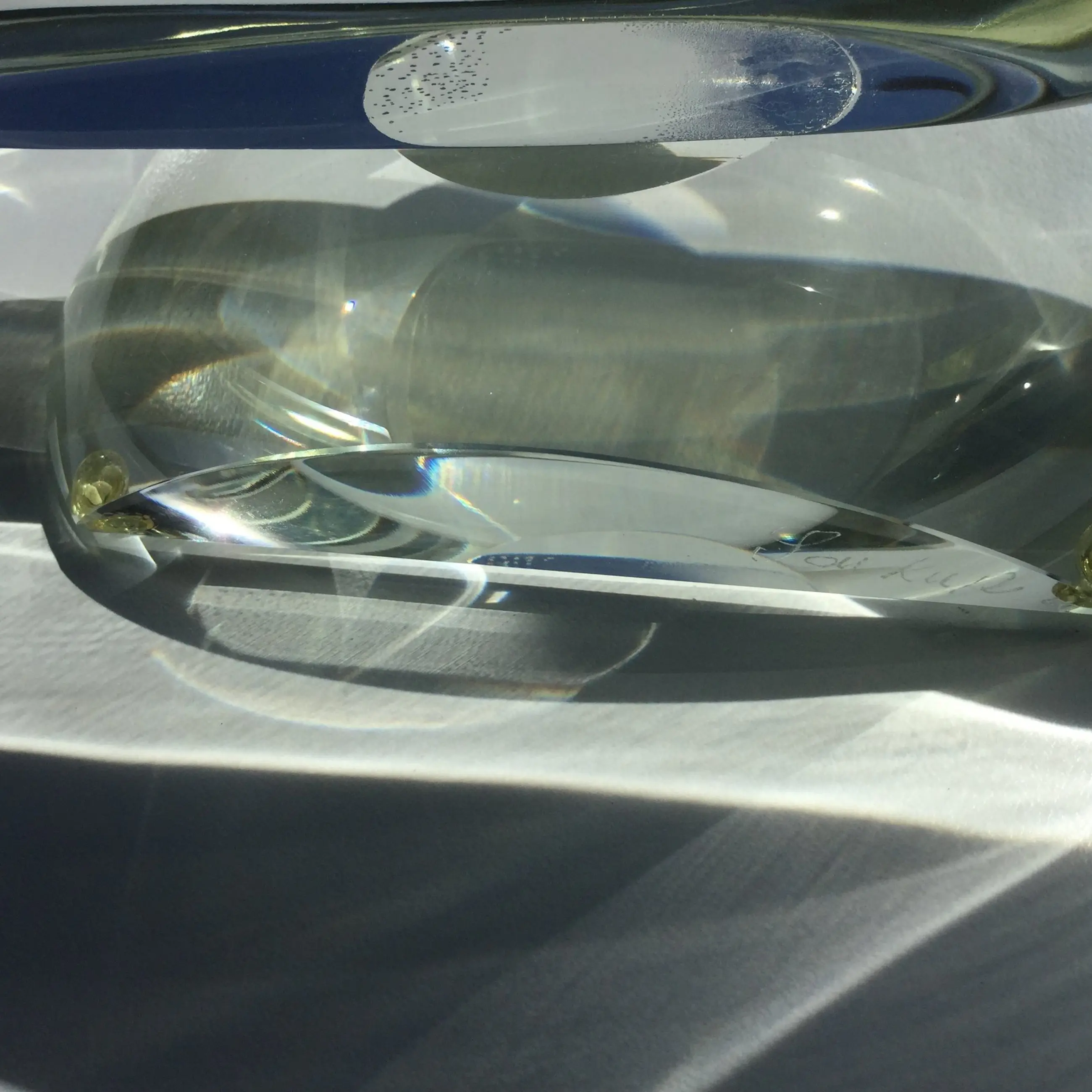 Unique glasobject “ SHARK” van de Tsjechische glaskunstenaar Eduard Soukup. Mondgeblazen, handgevormd, gepolijst en geslepen. Uitgevoerd in een licht champagne kleur. Gesigneerd met een diamantpen op de voet. Hoog 16 cm. Breed 31 cm. Gefotografeerd met daglicht en kunstlicht.