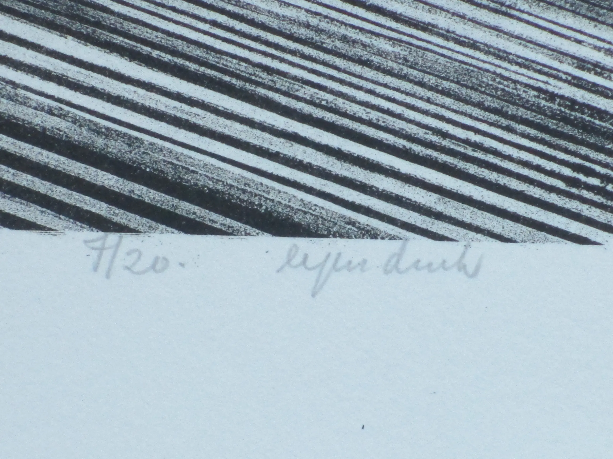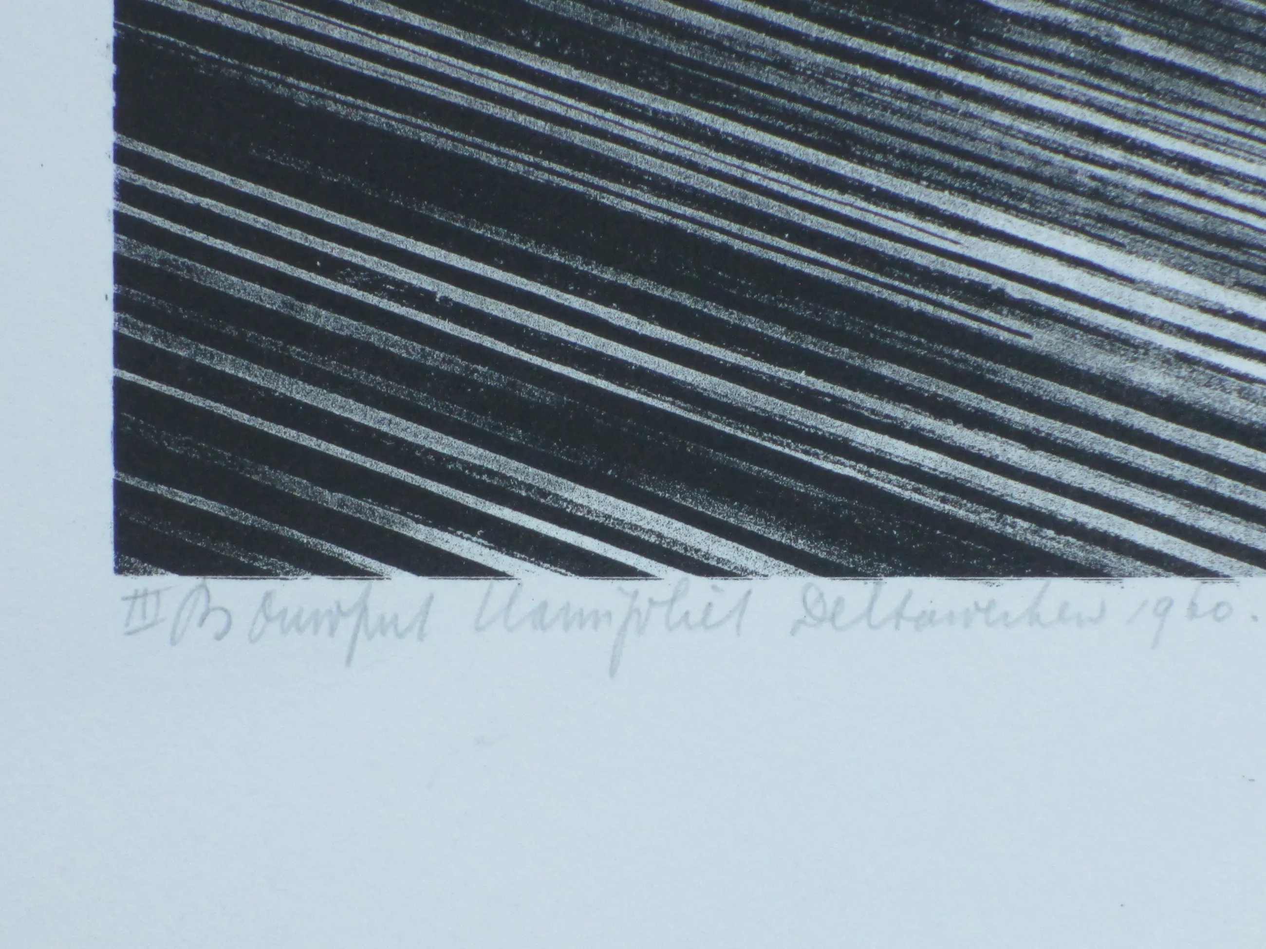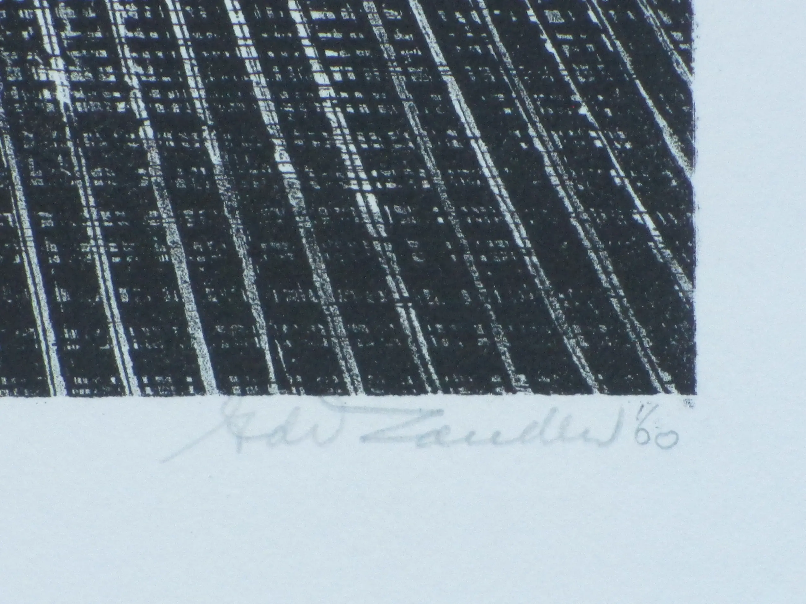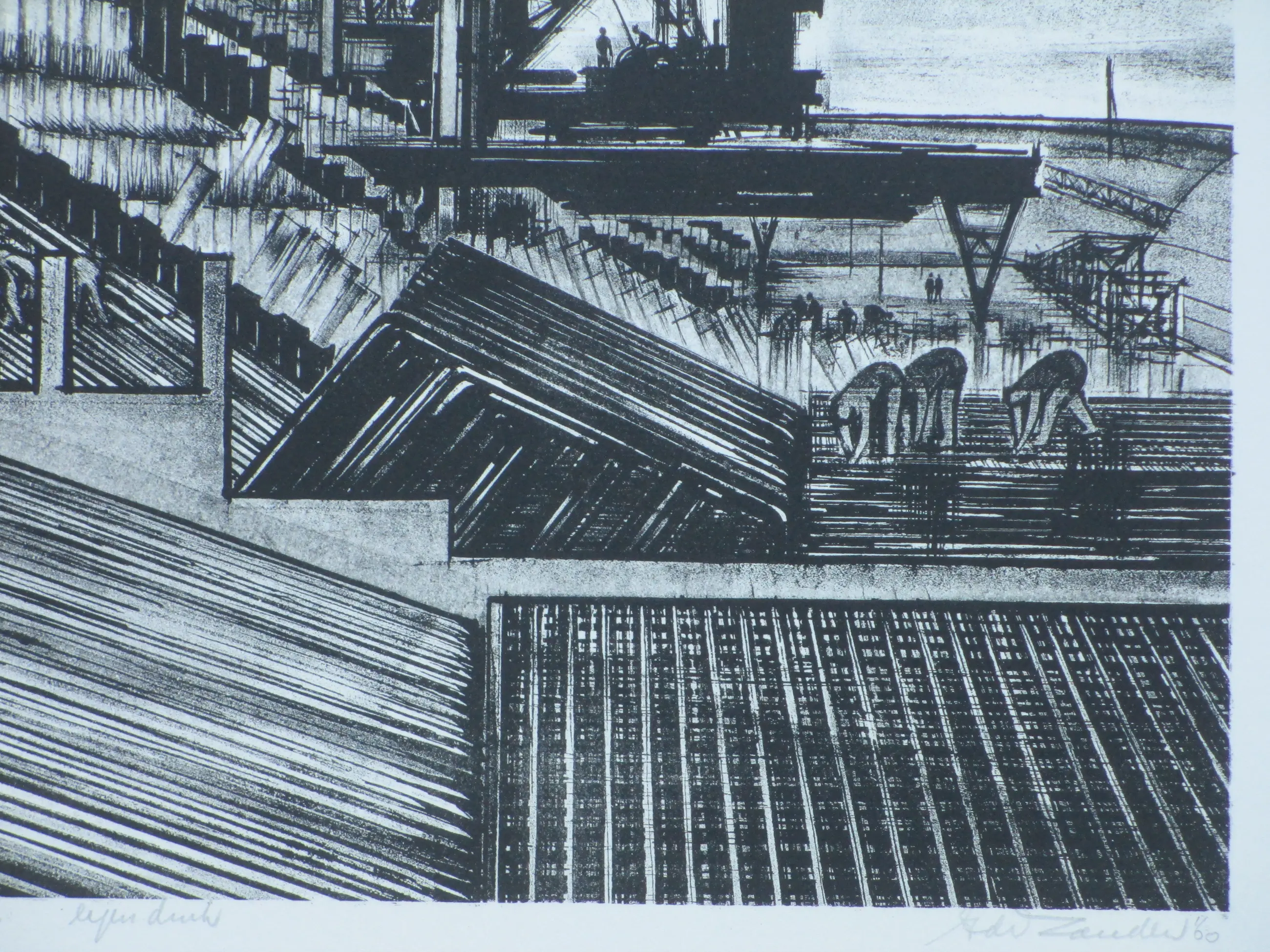 Litho door Eduard van Zanden Voorstelling van een bouwput bij de Deltawerken Losbladig, beeldmaat 28x42, bladmaat 48x63 Gesigneerd en gedateerd in potlood r.o.; 'Ed v Zanden '60' Getiteld en gedateerd in potlood l.o.: 'III Bouwput Haringvliet Deltawerken 1960' Zeer kleine oplage, m.o. in potlood '7/20' en annotatie 'eigen druk'