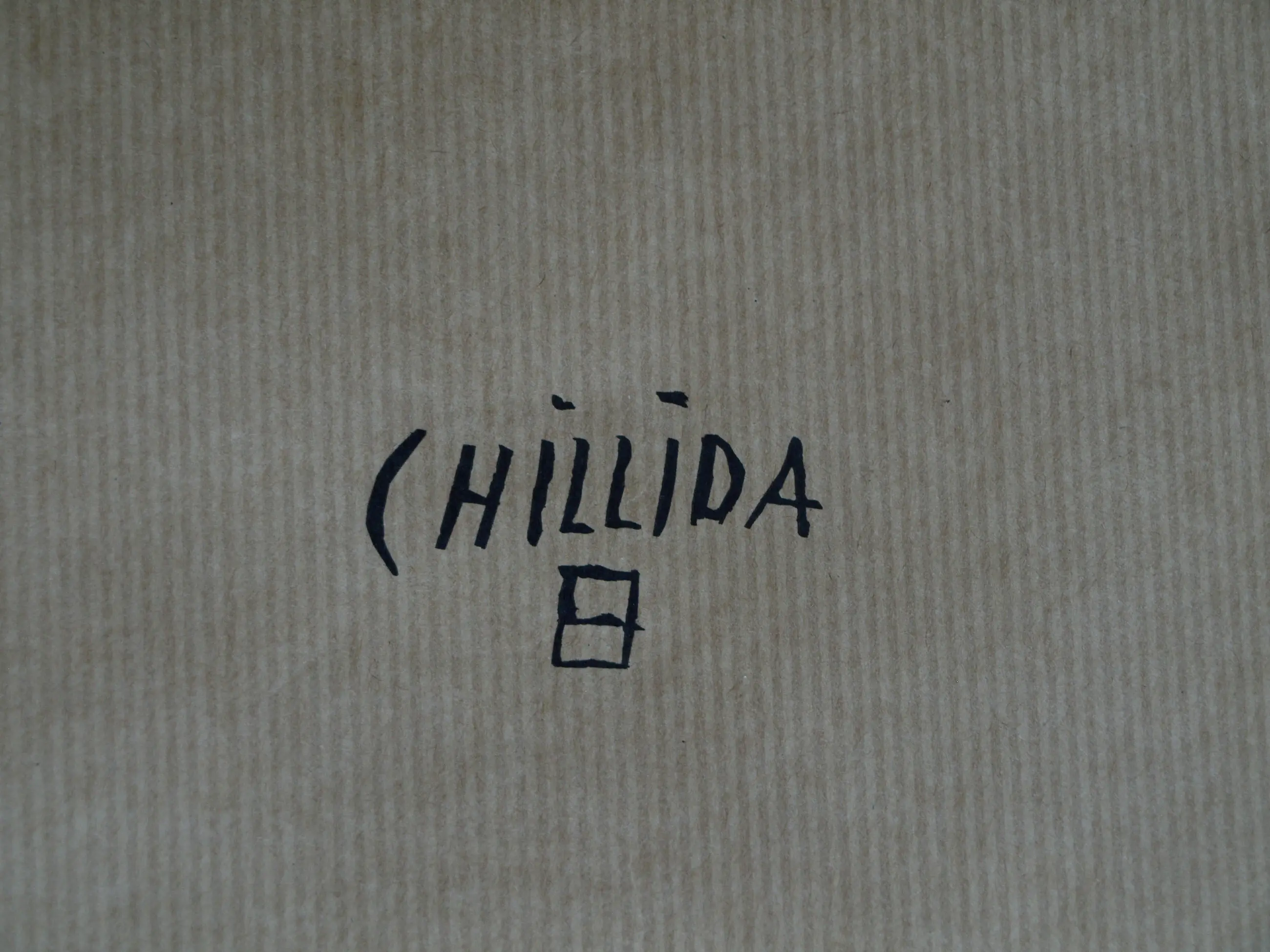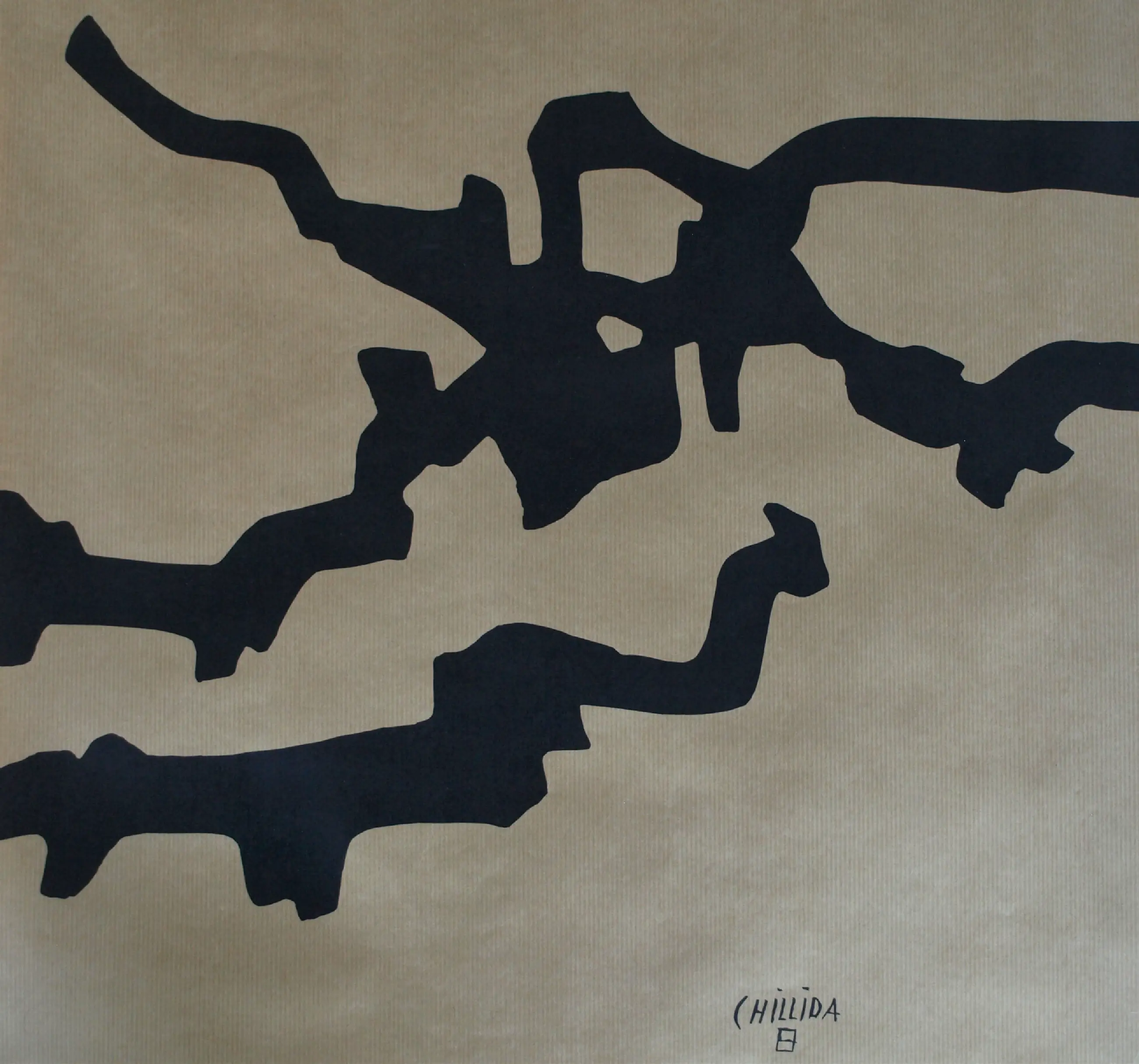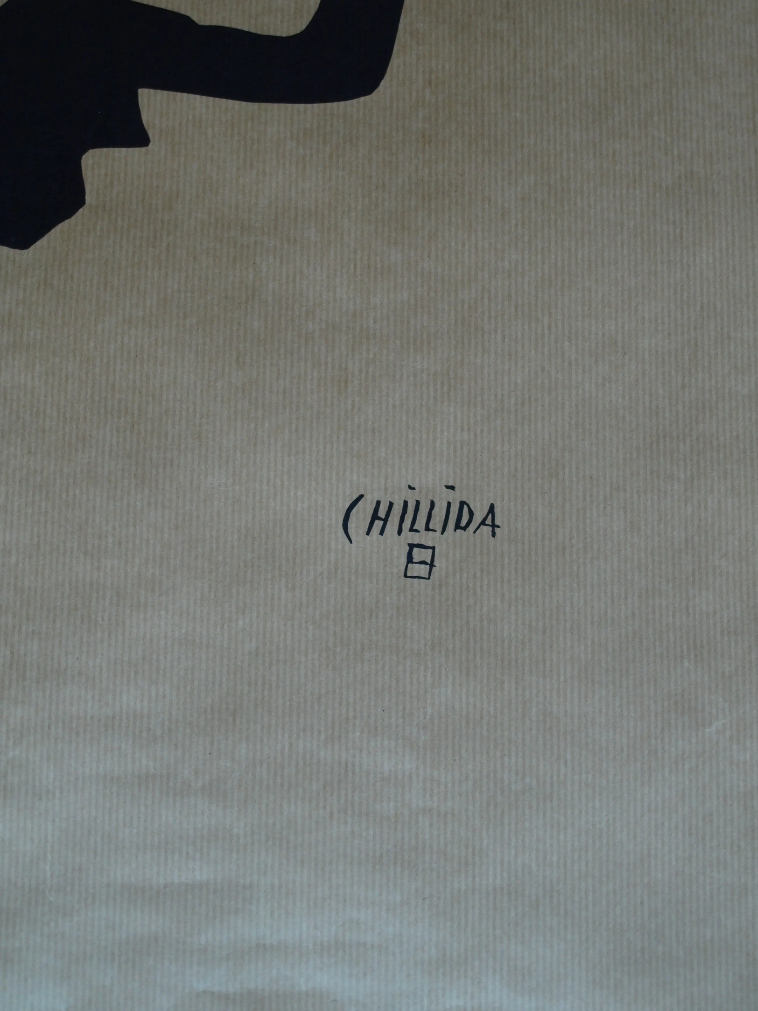 Een lithografie op bruin pakpapier van de Spaanse kunstenaar Eduardo Chillida (1924-2002), uitgegeven ter gelegenheid van de tentoonstelling in Museo de Arte Abstracto Español, Cuenca, in 1974 in Spanje.