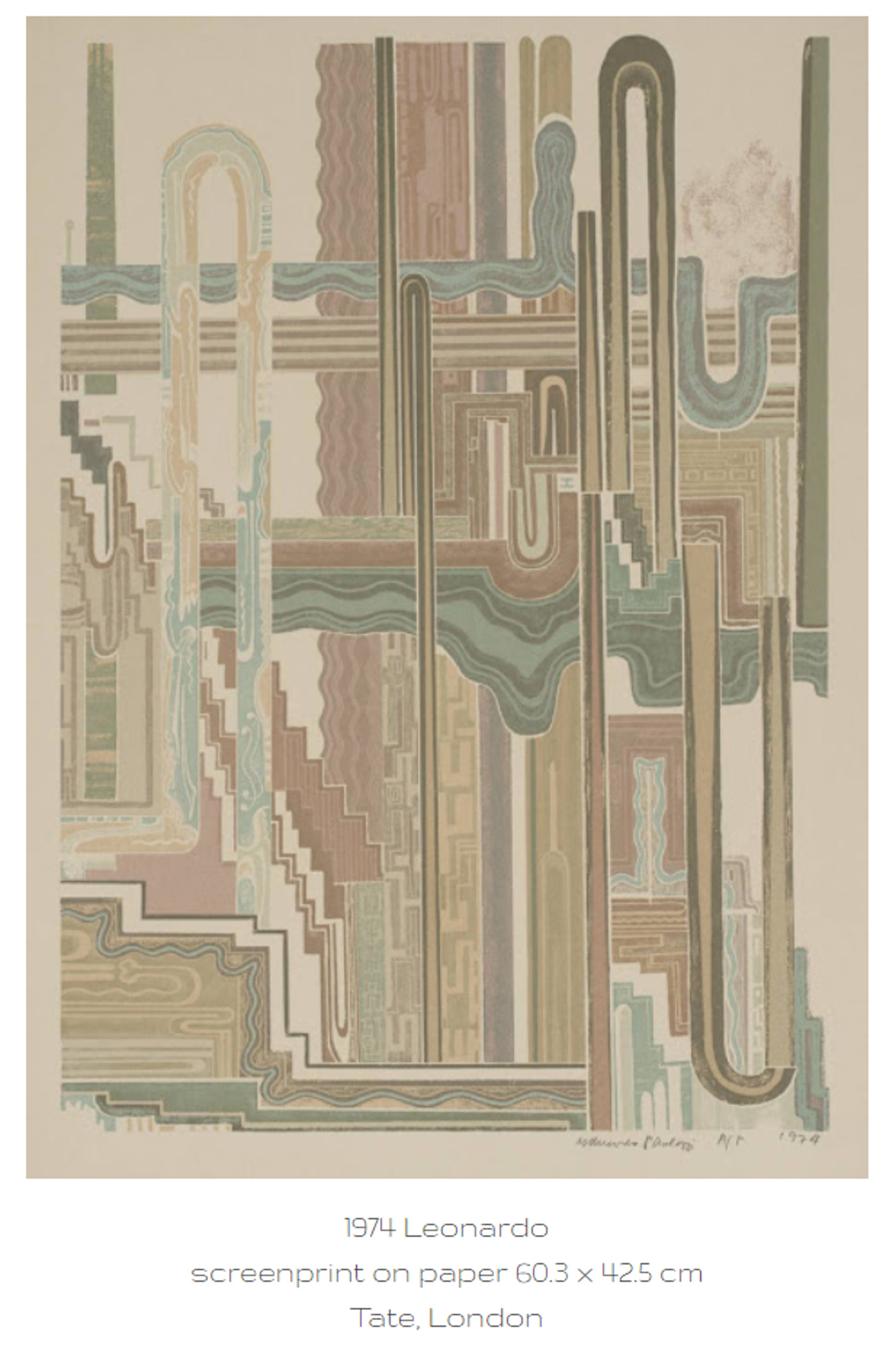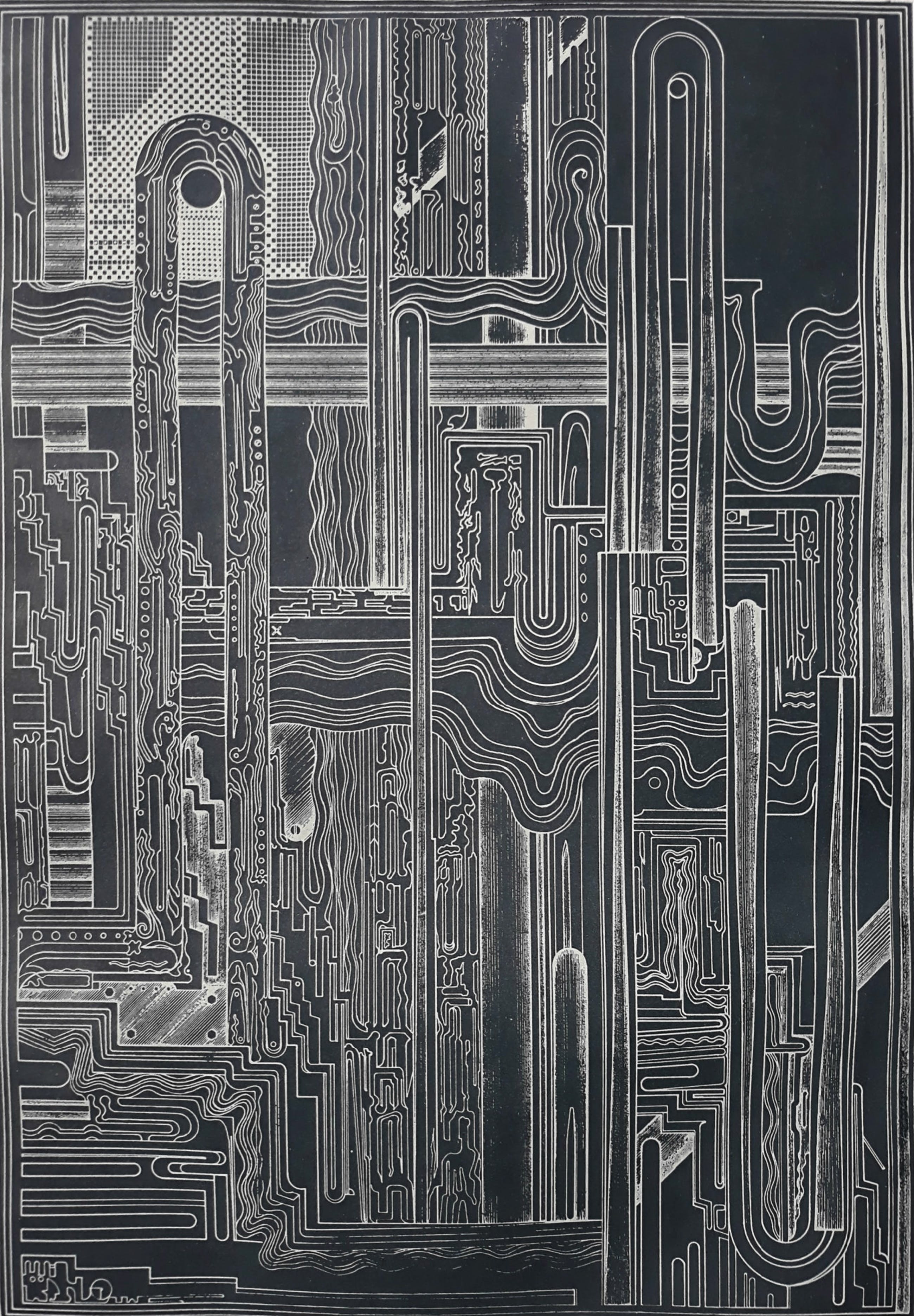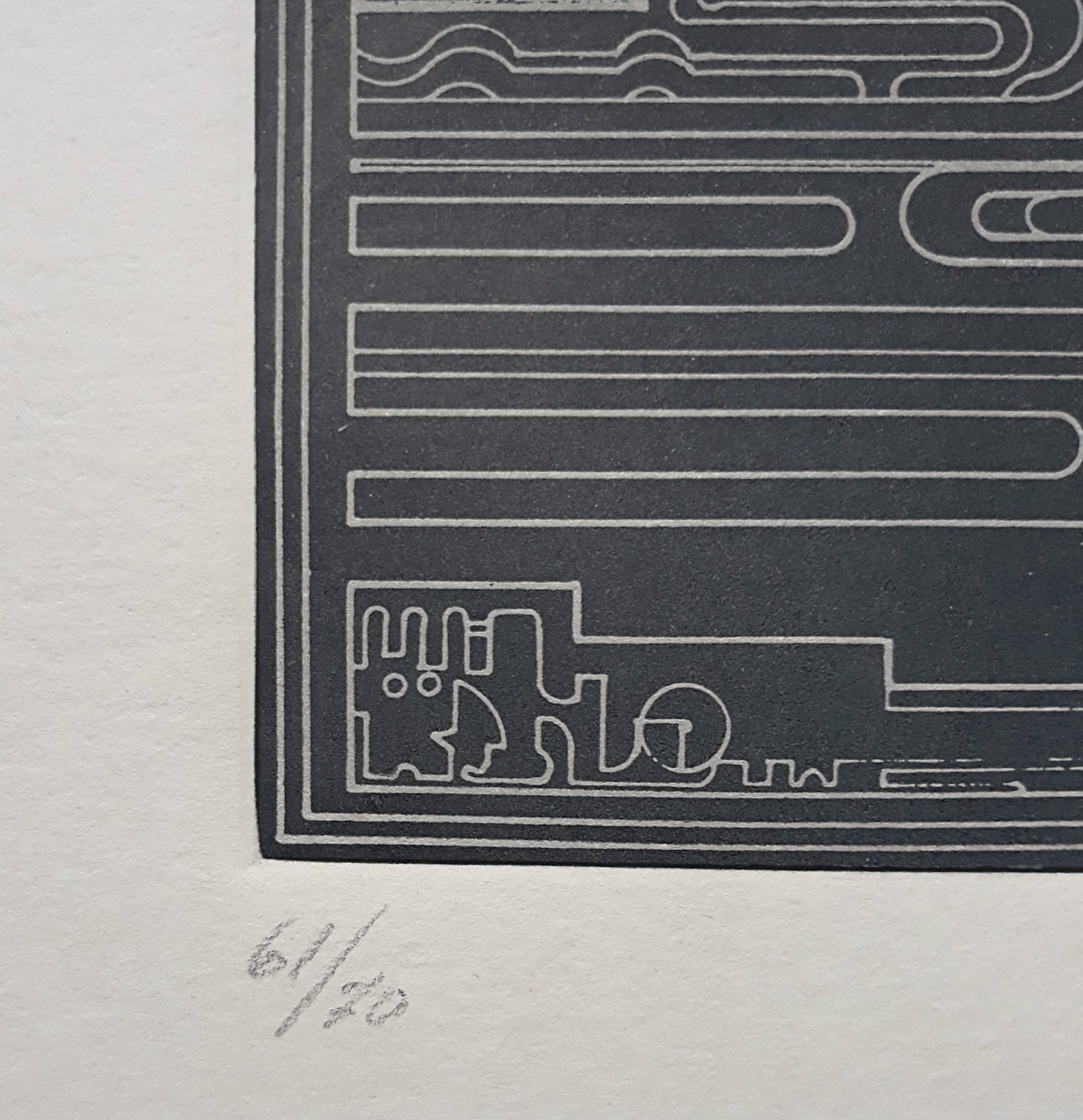Prachtige, strakke compositie van de bekende Britse (Schotse) kunstenaar Eduardo Paolozzi, te dateren rond 1974. In de stijl van “Arts-and-Crafts” icoon Charles “Rennie” Mackintosh aan wie hij in dat jaar als hommage ook een serie houtsnedes wijdde.