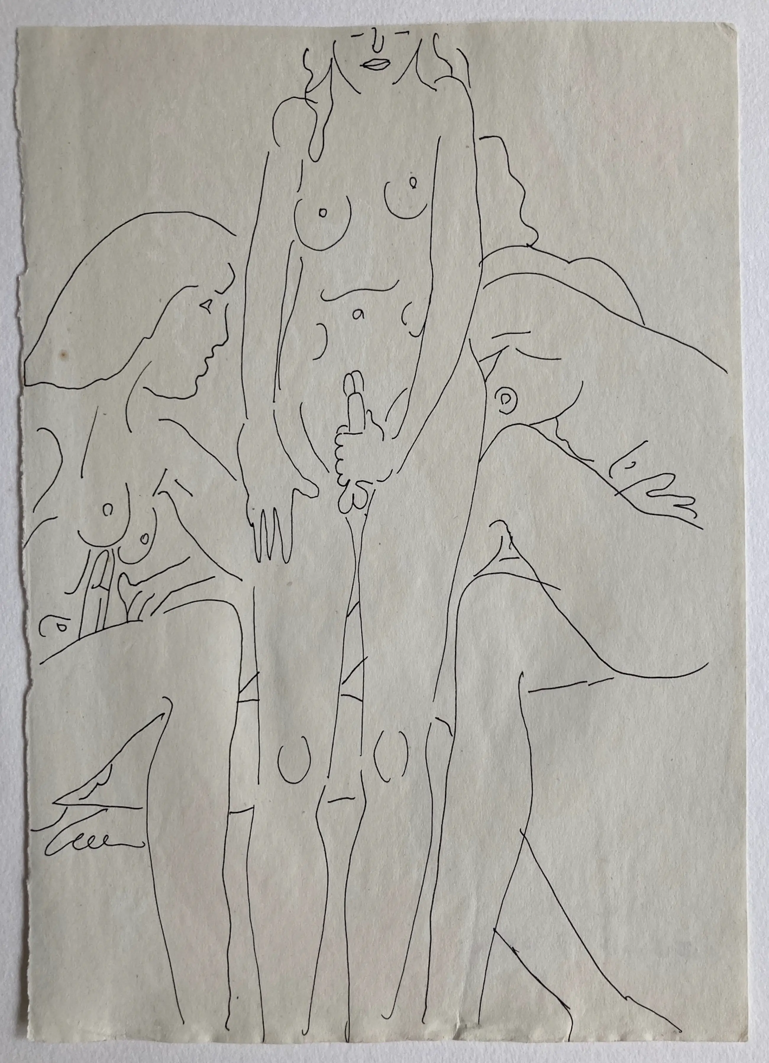 | Linkerrand onregelmatig, waarschijnlijk gescheurd uit een van zijn tekenboeken, een heel klein puntje in het haar van de vrouw aan de linkerkant, onderrand iets rafelig (zie foto's) | |||||