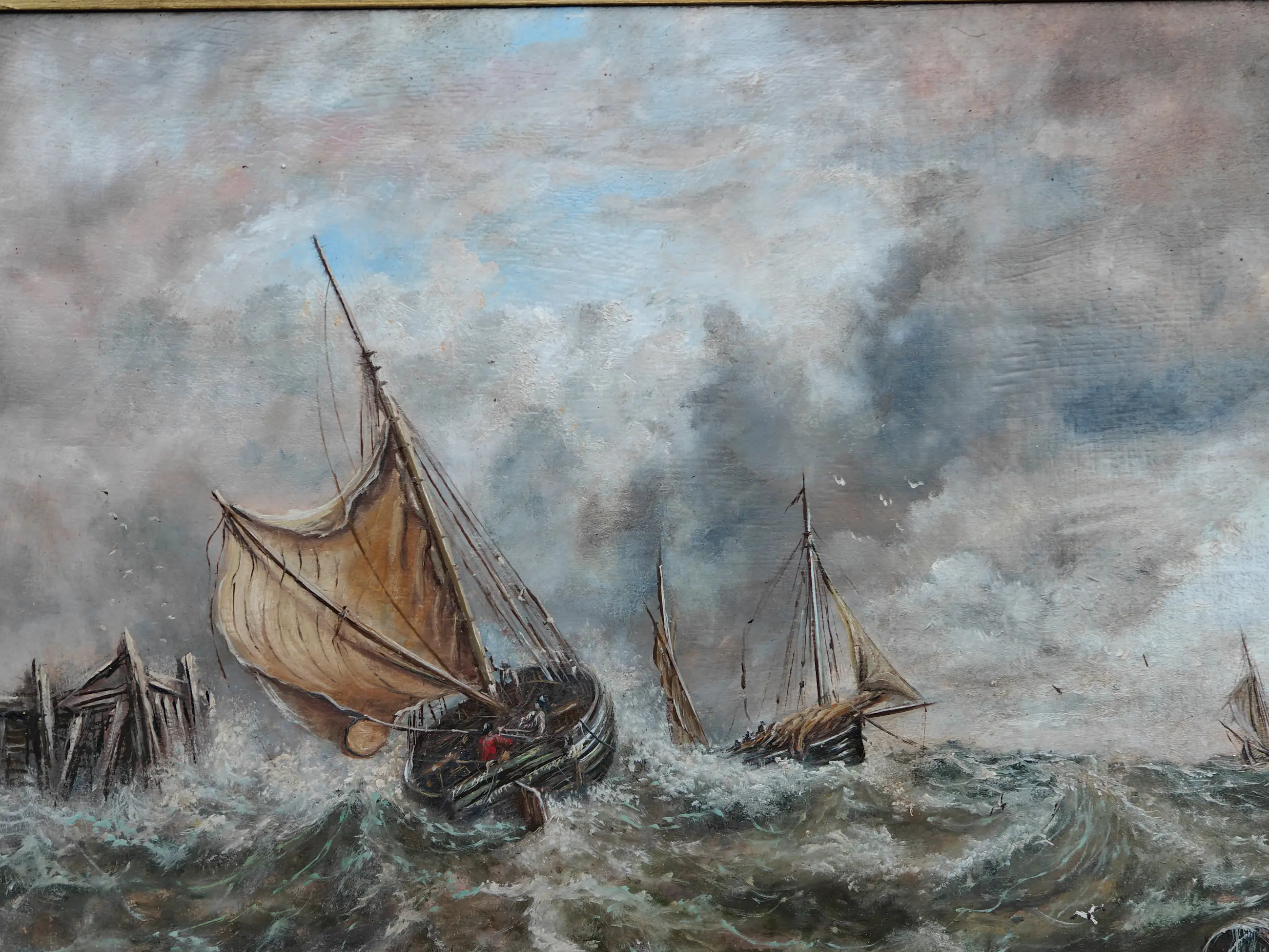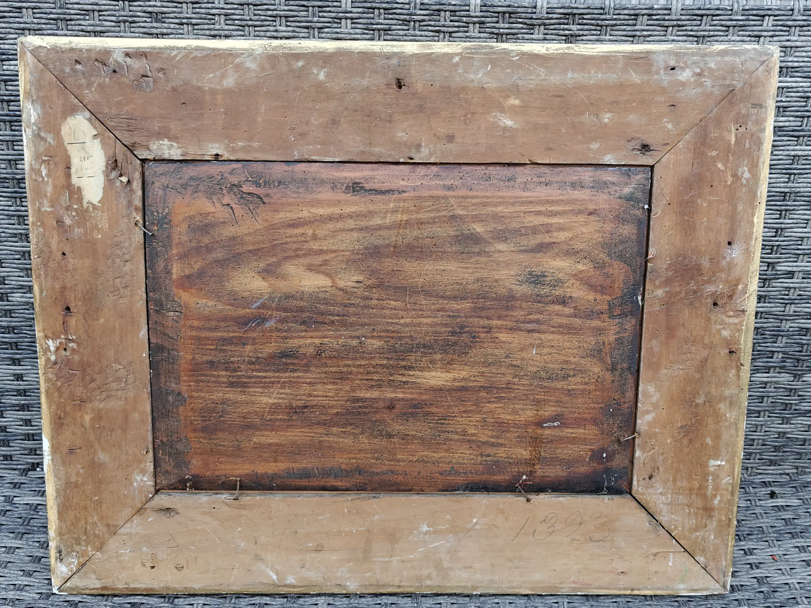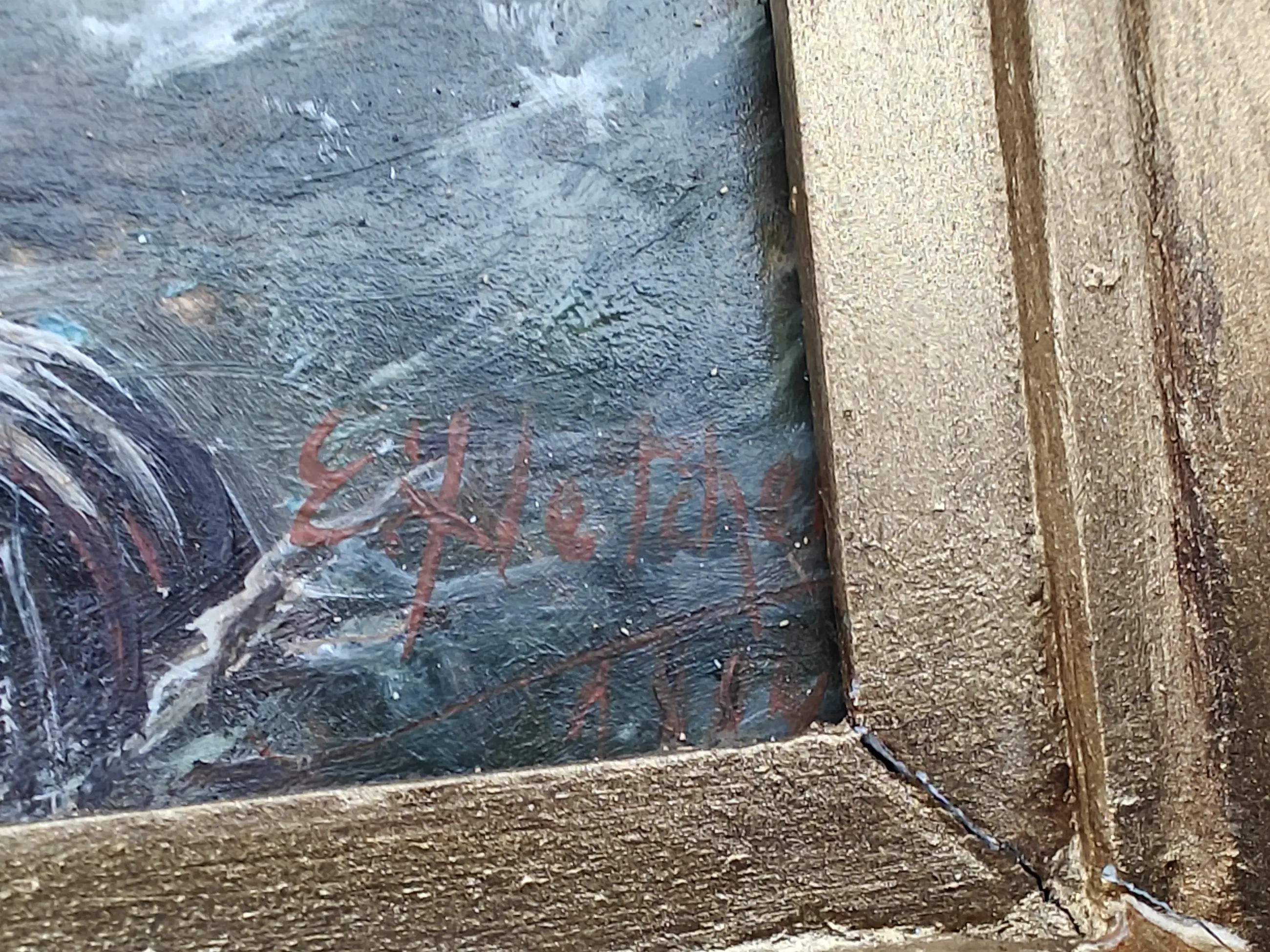 | Schilderij is in goede staat, lijst heeft sporen, wat plekjes afgebroken. Vooraanzicht grotendeels intact | |||||||||