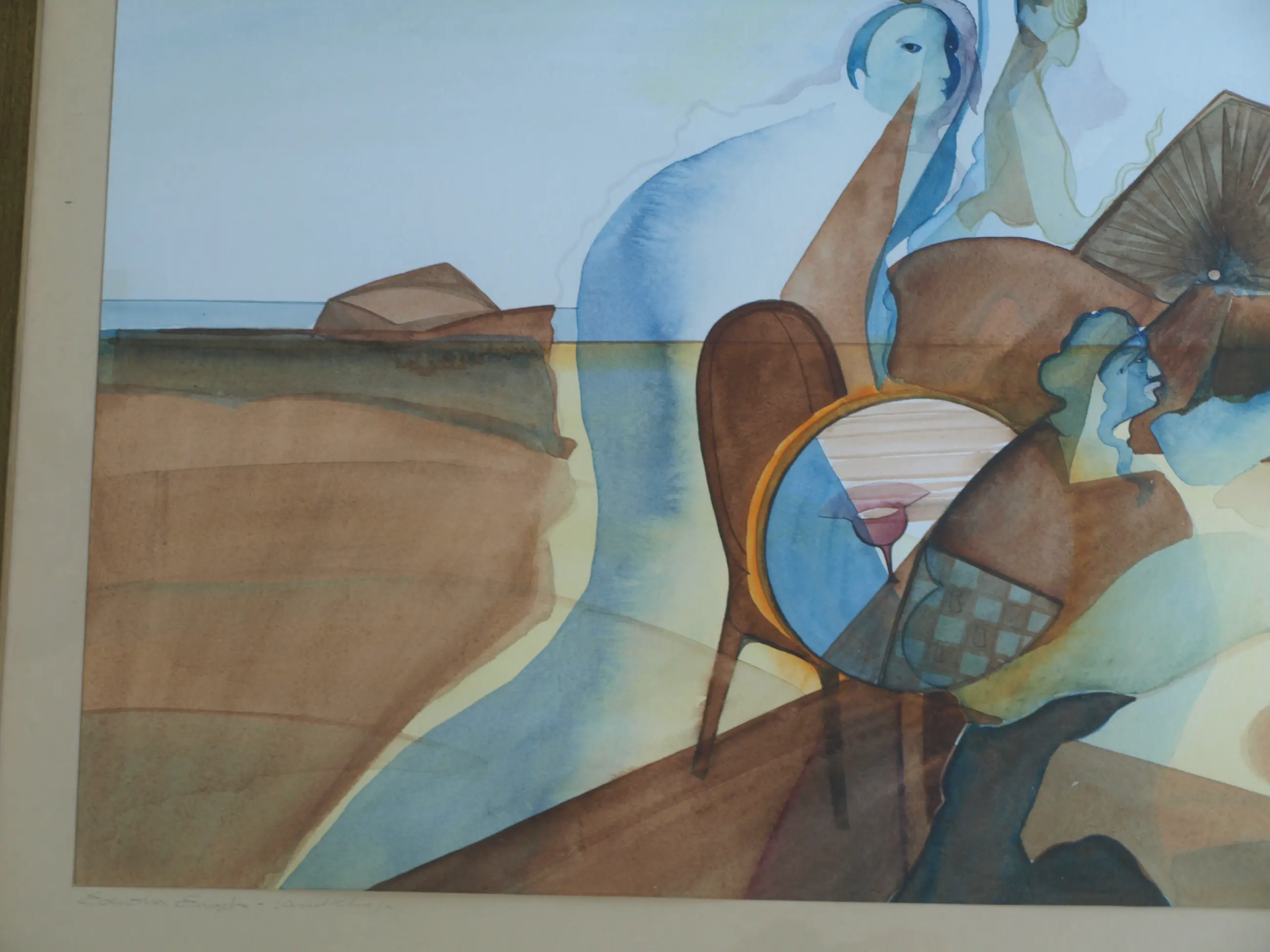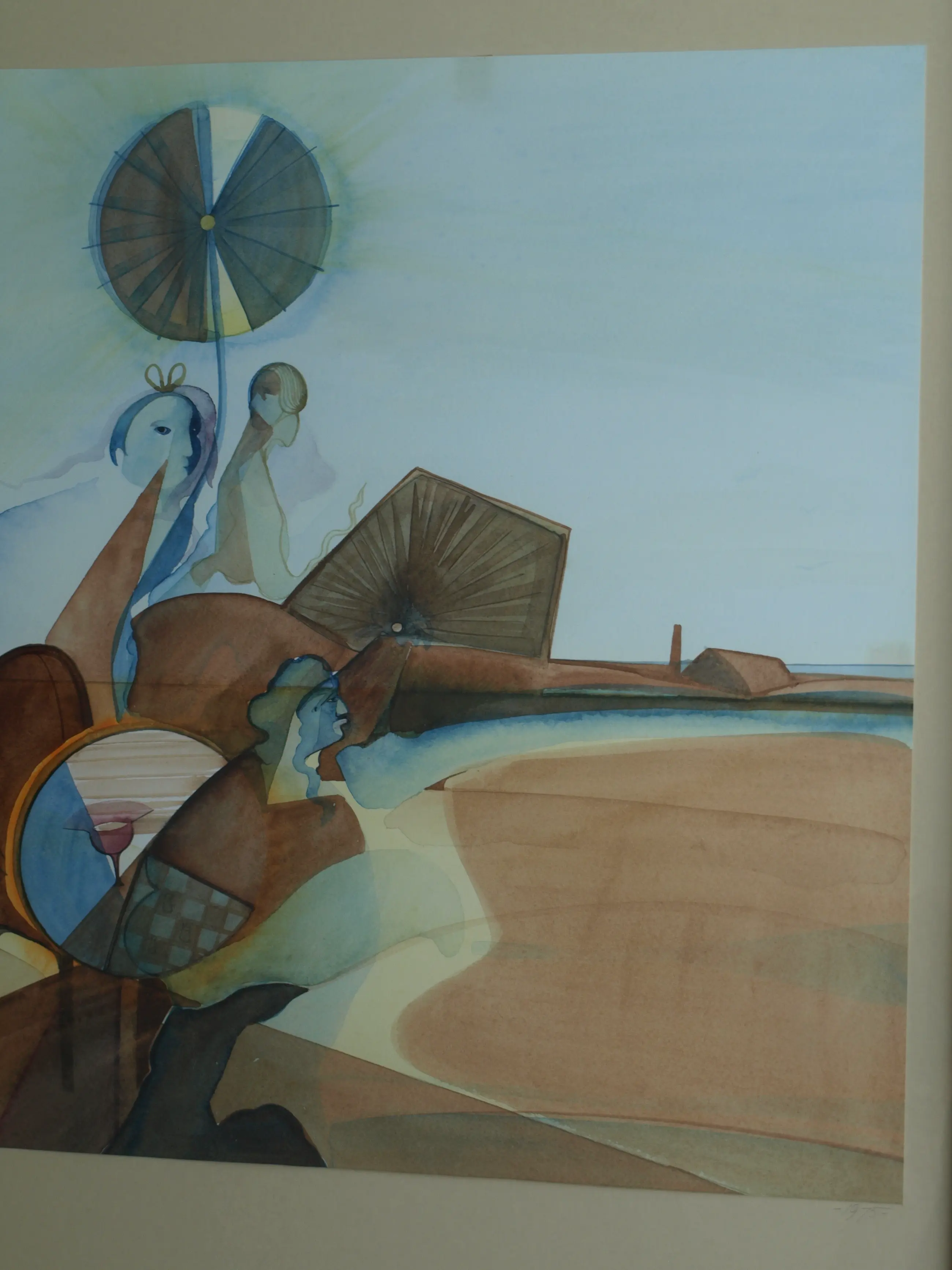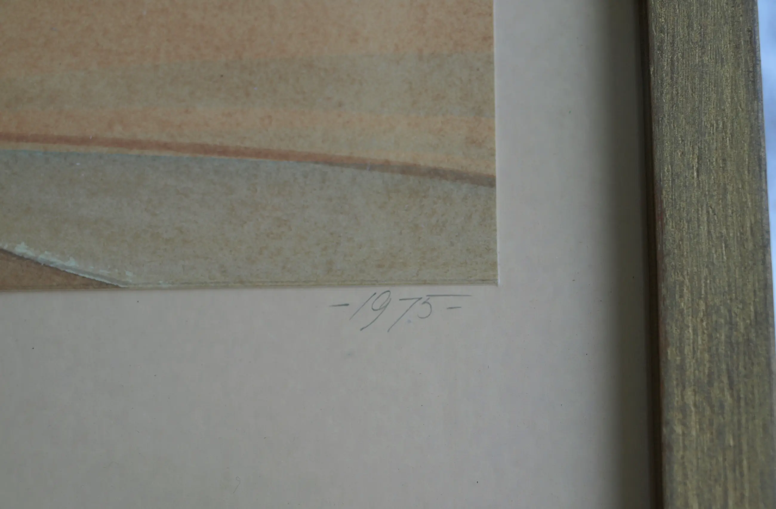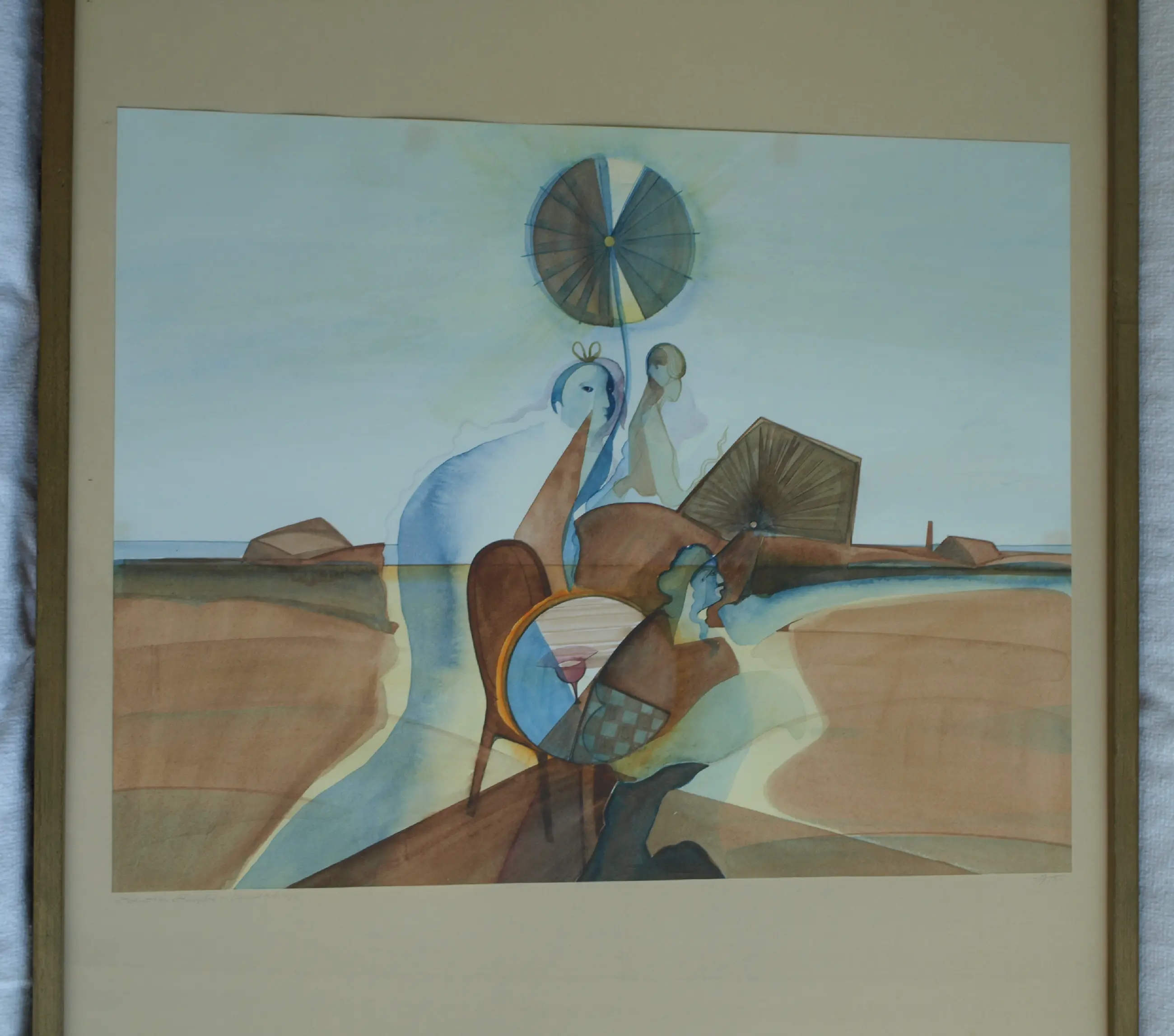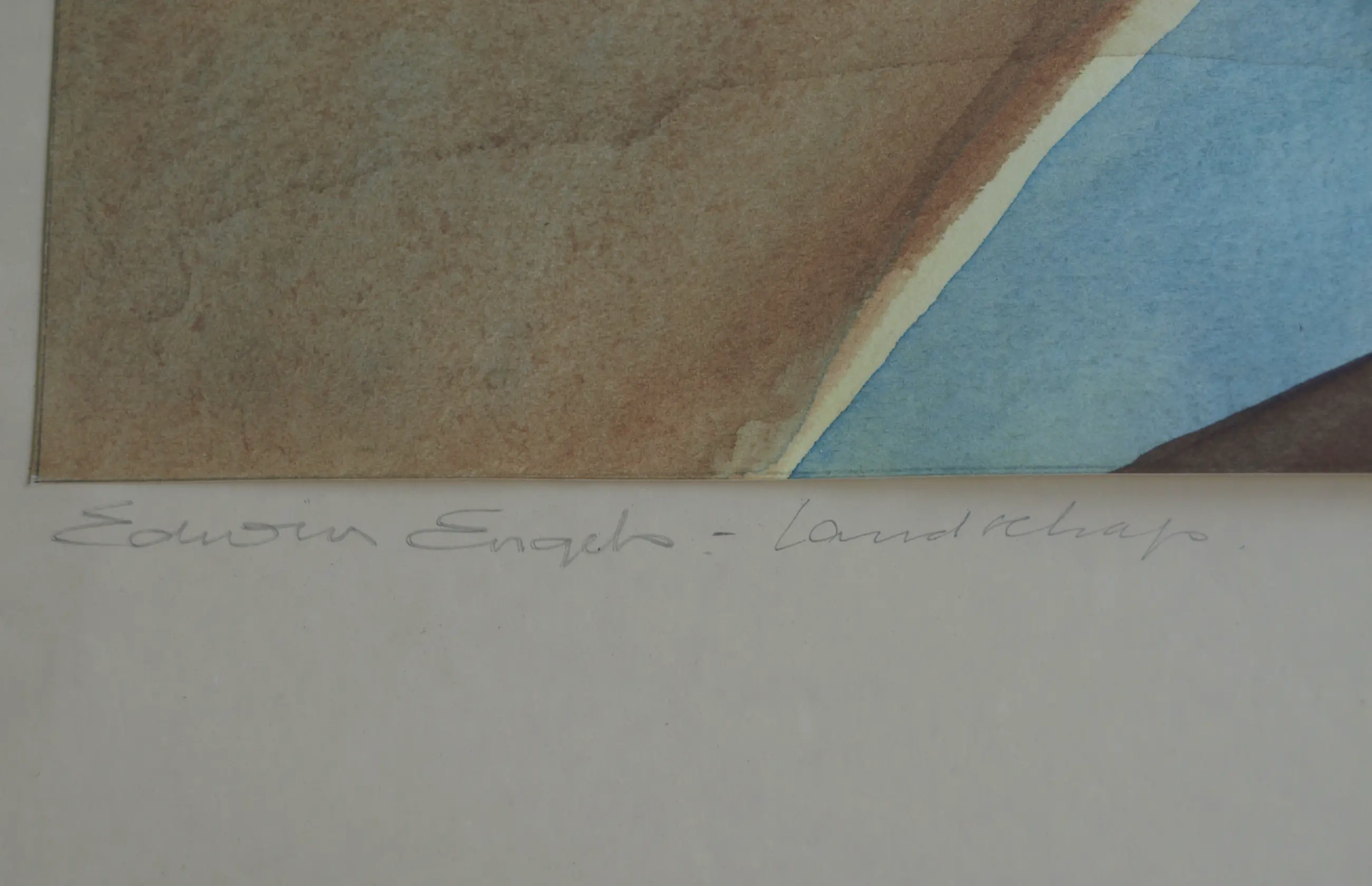 Een grote ingelijste aquarel (gouache?) uit 1975 van de Nederlandse kunstenaar Edwin Engels (1932-2015), getiteld “Landschap”. -Gesigneerd, getiteld en gedateerd. -Ingelijst in de originele houten lijst met glasplaat. -Afmetingen: Lijst, 97 x 68 cm. Blad / beeld, 45,5 x 59 cm. -Herkomst: Uit een inboedel. -Conditie: Het werk is in zeer goede staat. De houten lijst heeft slijtplekjes. Zie ook de foto’s voor een eigen indruk. Kan zo aan de muur.