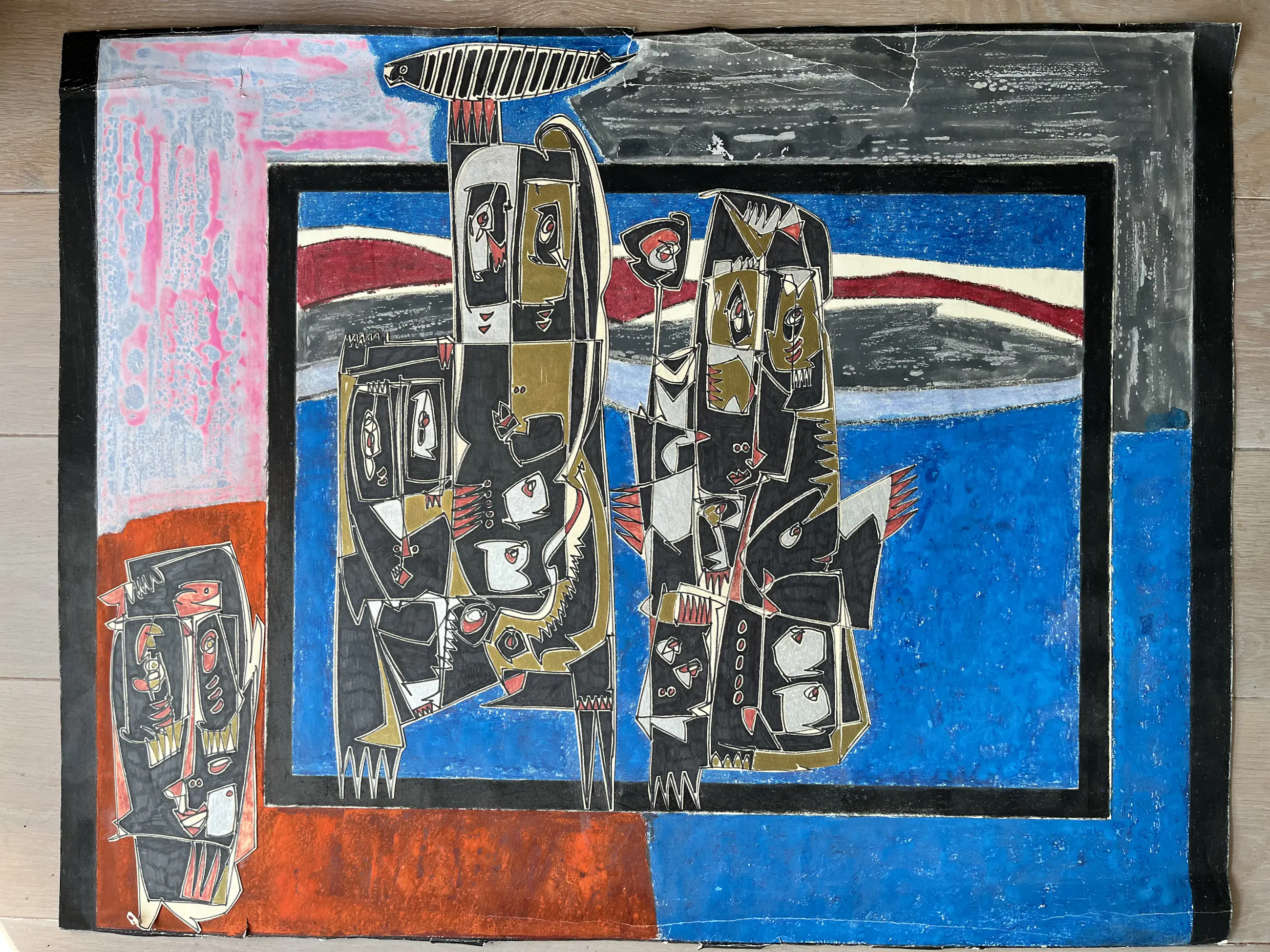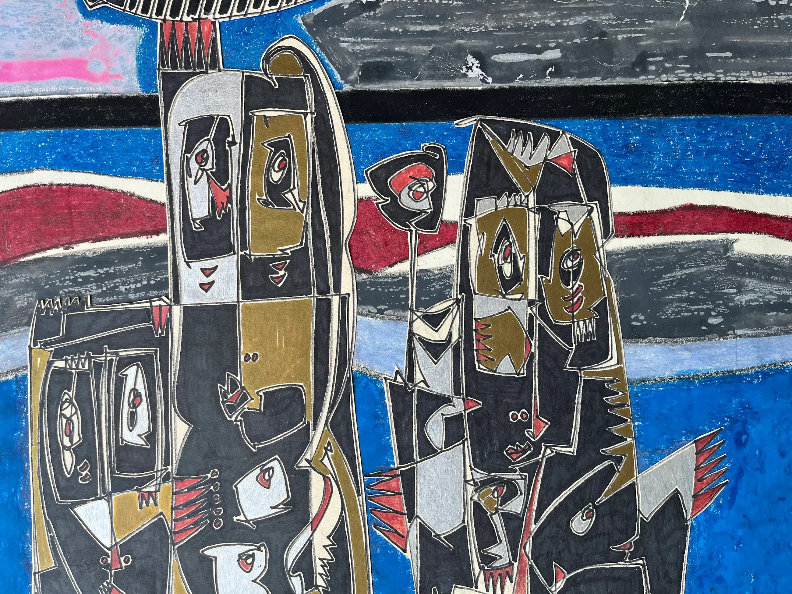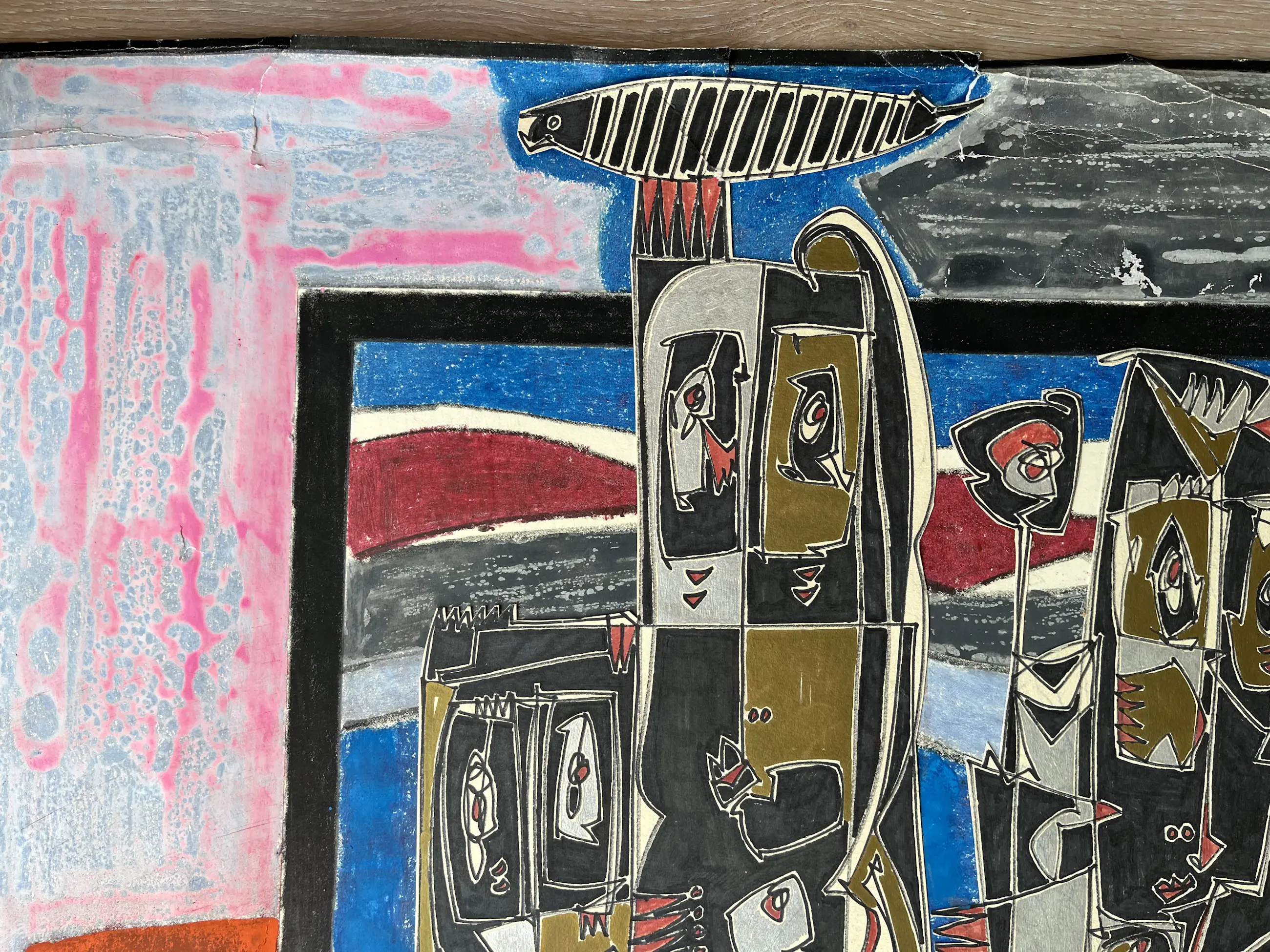 Het werk is een mixed media van krijgt, inkt, verf en opgeplakte figuren. Foto's geven een goed beeld van het geheel.