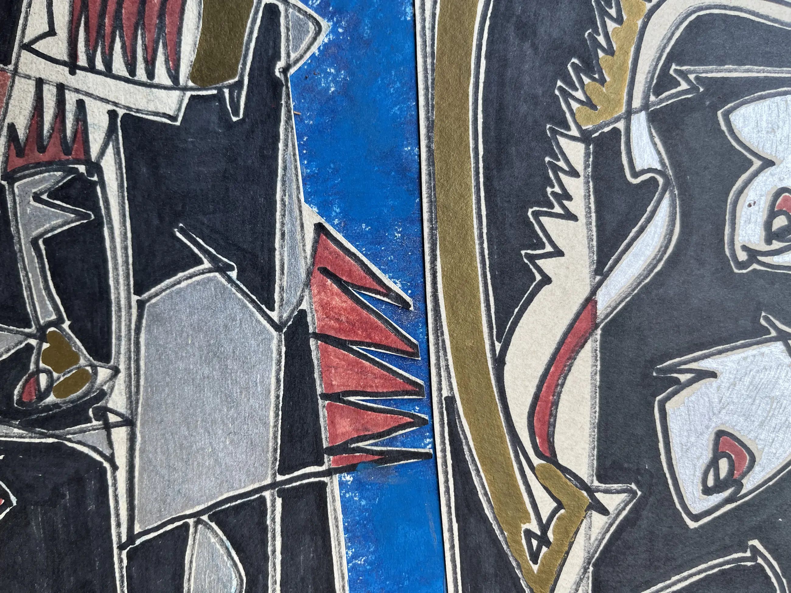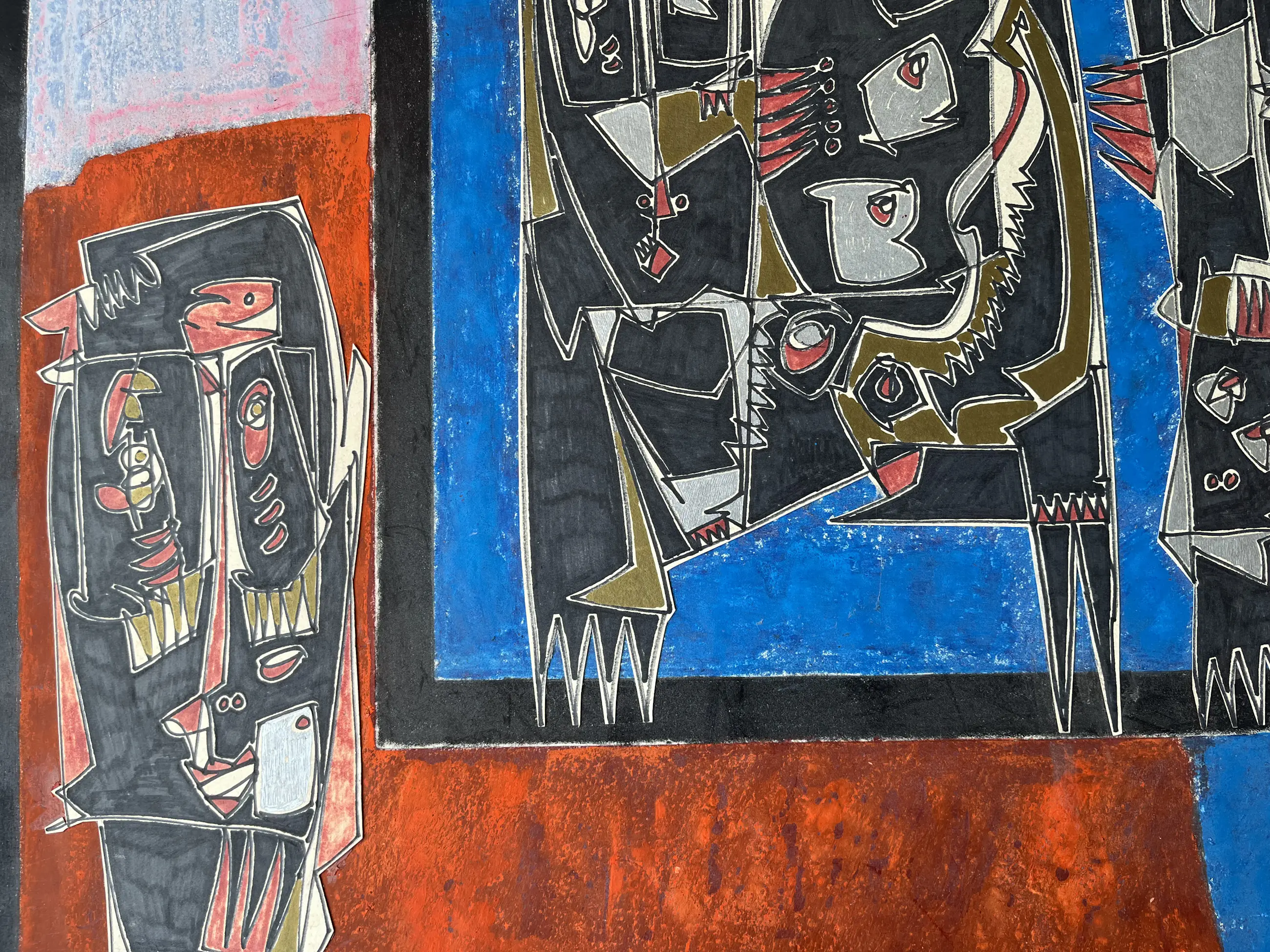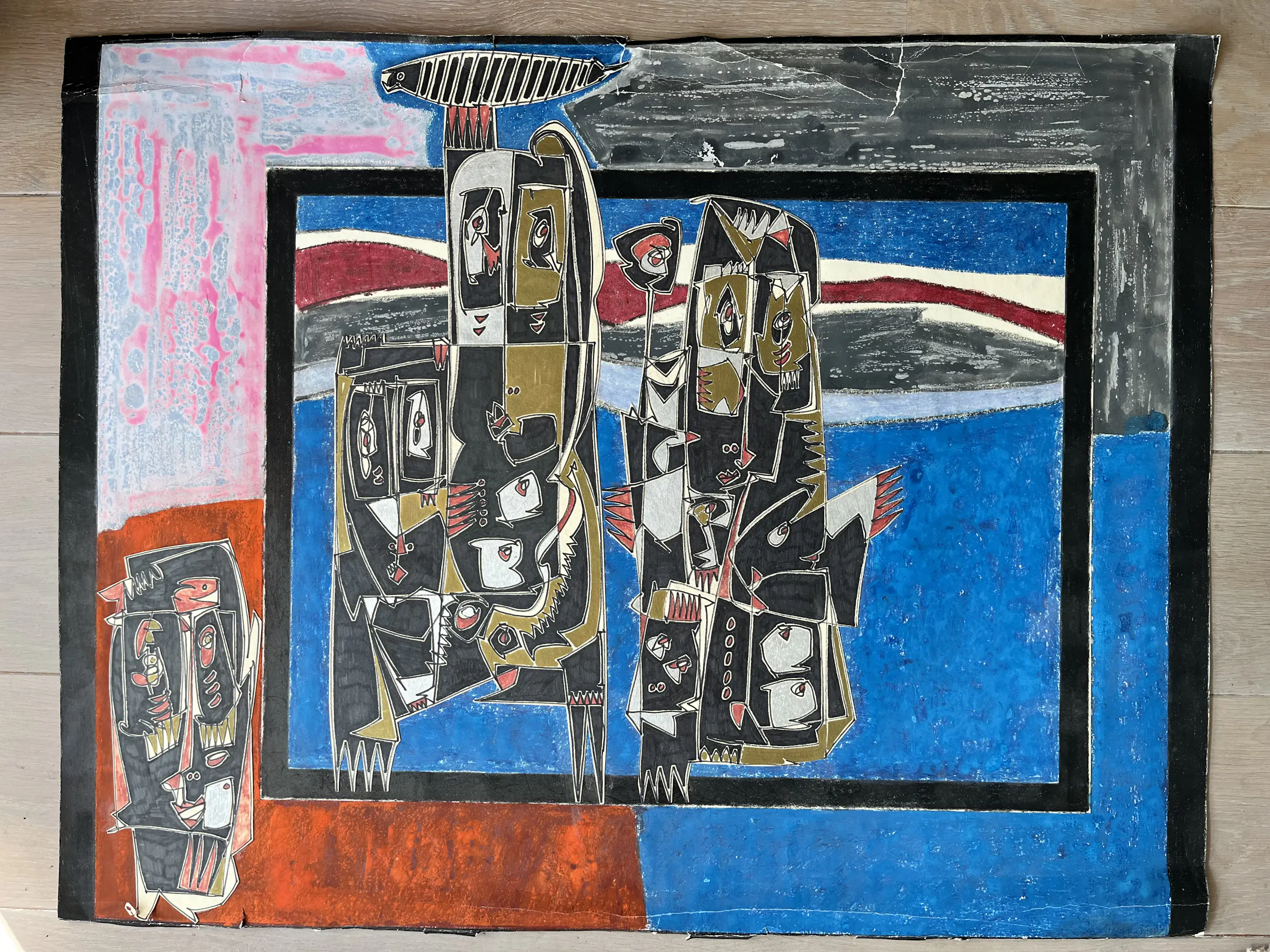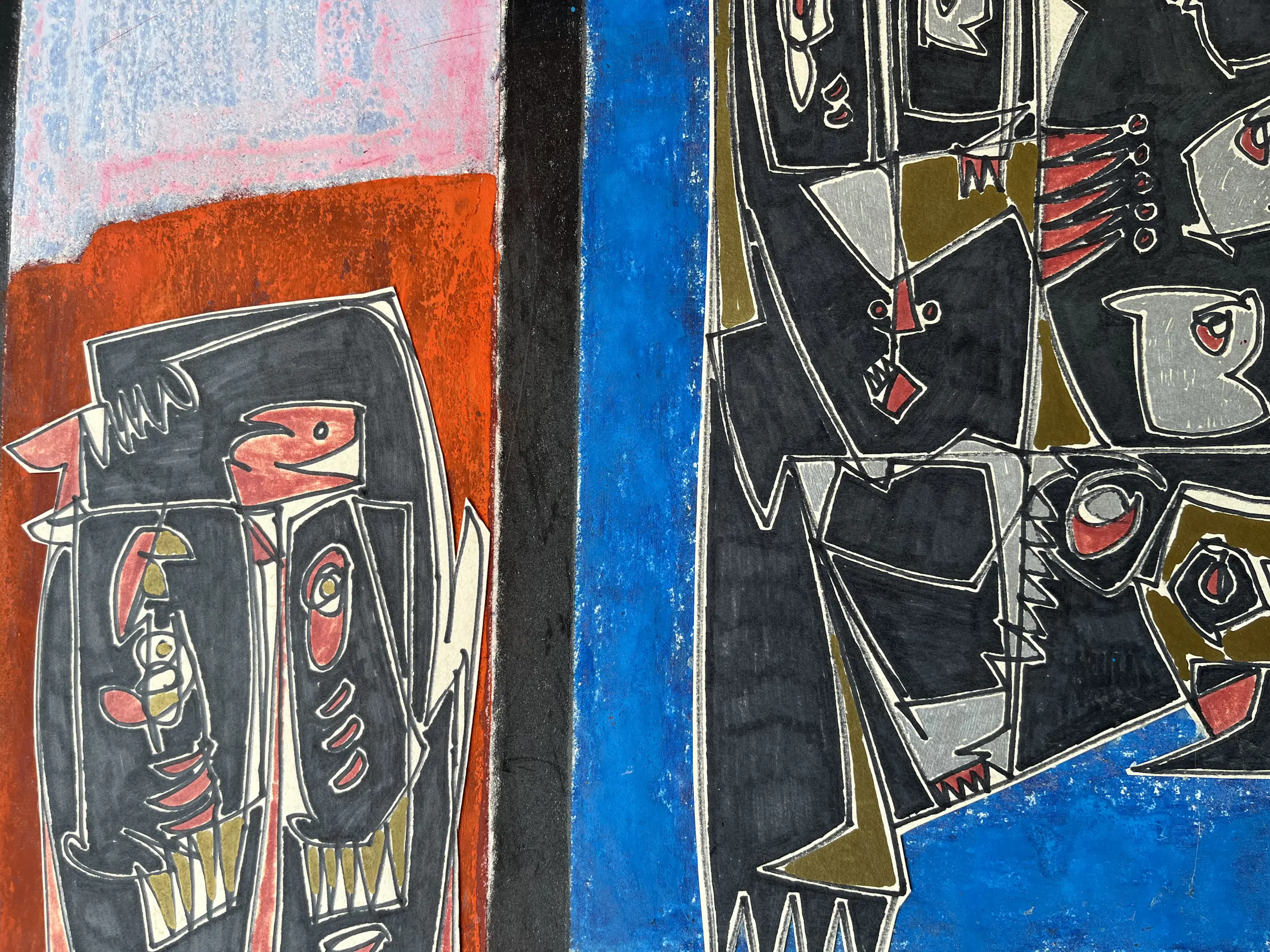 Het werk is een mixed media van krijgt, inkt, verf en opgeplakte figuren. Foto's geven een goed beeld van het geheel.