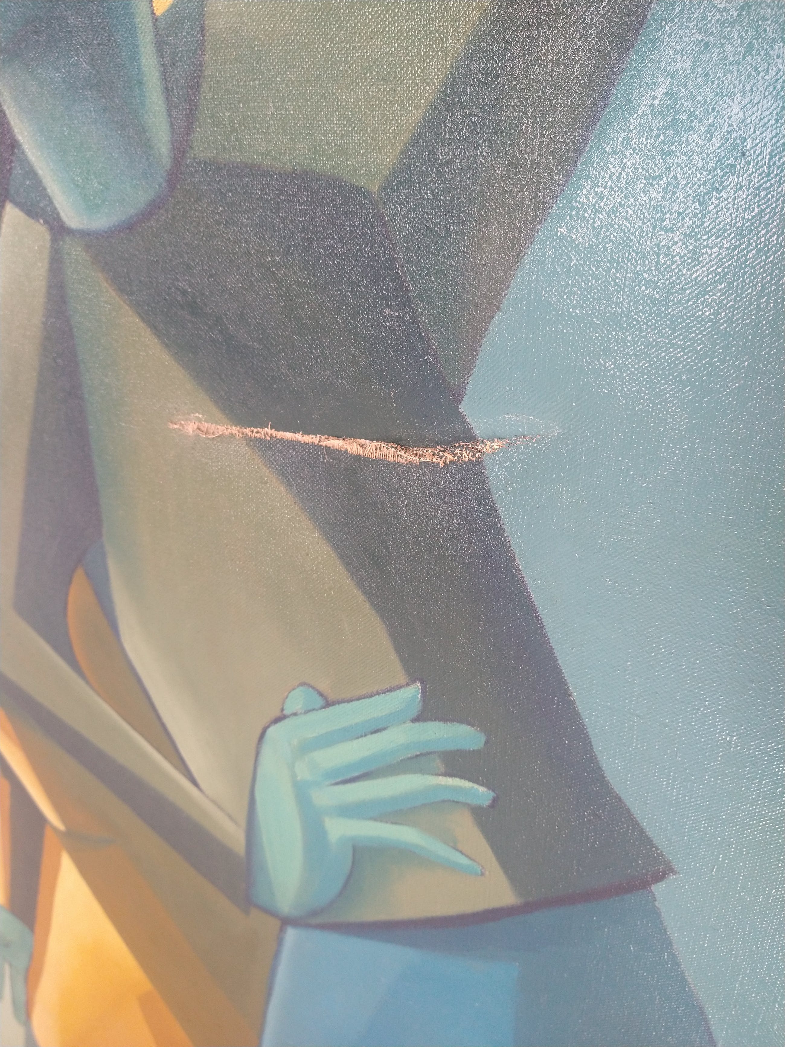 Het werk heeft 1 grote scheur in het midden van het canvas zitten over een kleine 20 cm. Verder is het werk in zeer goede staat qua verfhechting. Het heeft absoluut geen craquelé en de verf ziet er als nieuw uit