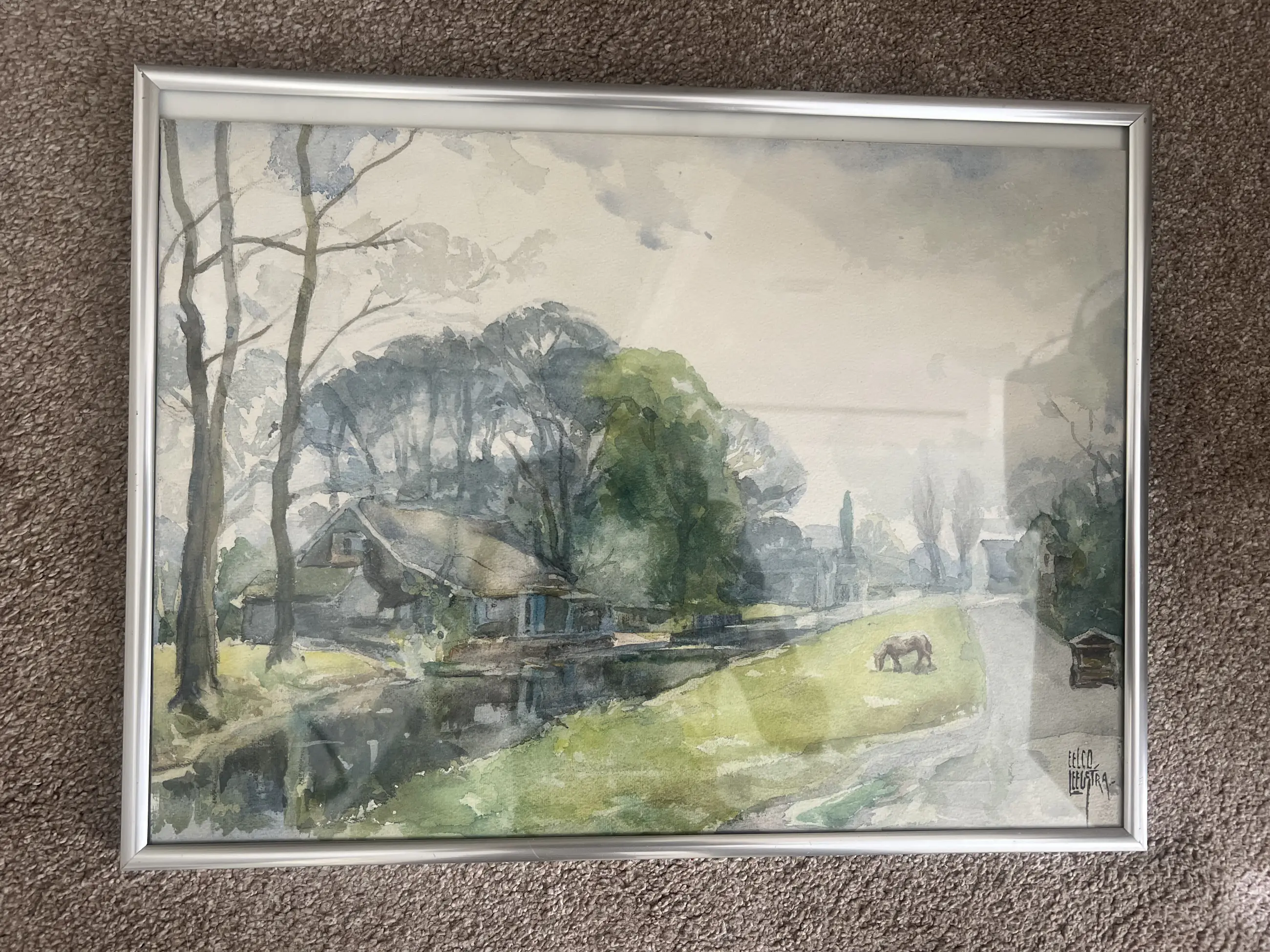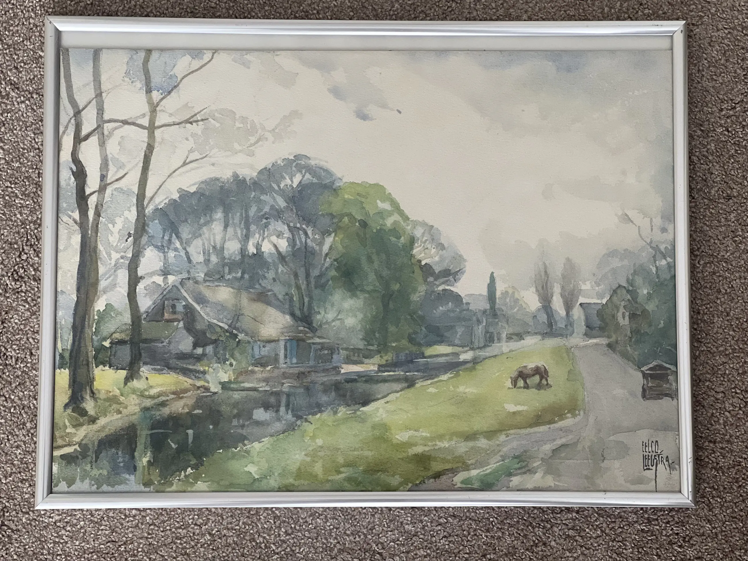 Eelco Leegstra is een oudoom van mij. Hij was de zwager van mijn overleden opa (Vogelsang). De zus van mijn opa was dus getrouwd met Eelco Leegstra. Ik heb meerdere aquarellen en 1 schilderij geërfd. Deze komen uit de nalatenschap van mijn moeder (zij was getrouwd met Hans Vogelsang. Ik ben geen kunstkenner. Wel zijn de aquarellen mij dierbaar, zie hingen in het ouderlijk huis aan de wand. Eén olieverfschilderij hangt nu bij mij aan de wand in mijn werkkamer. De hiervoor genoemde titel heb ik zelf verzonnen. De lijst (zilverkleurig) is op meerder plaatsen beschadigd. De aquarel, mogelijk gemaakt Aan de Vegt, is van uitstekende staat. Het kan ook zonder lijst verzonden worden.