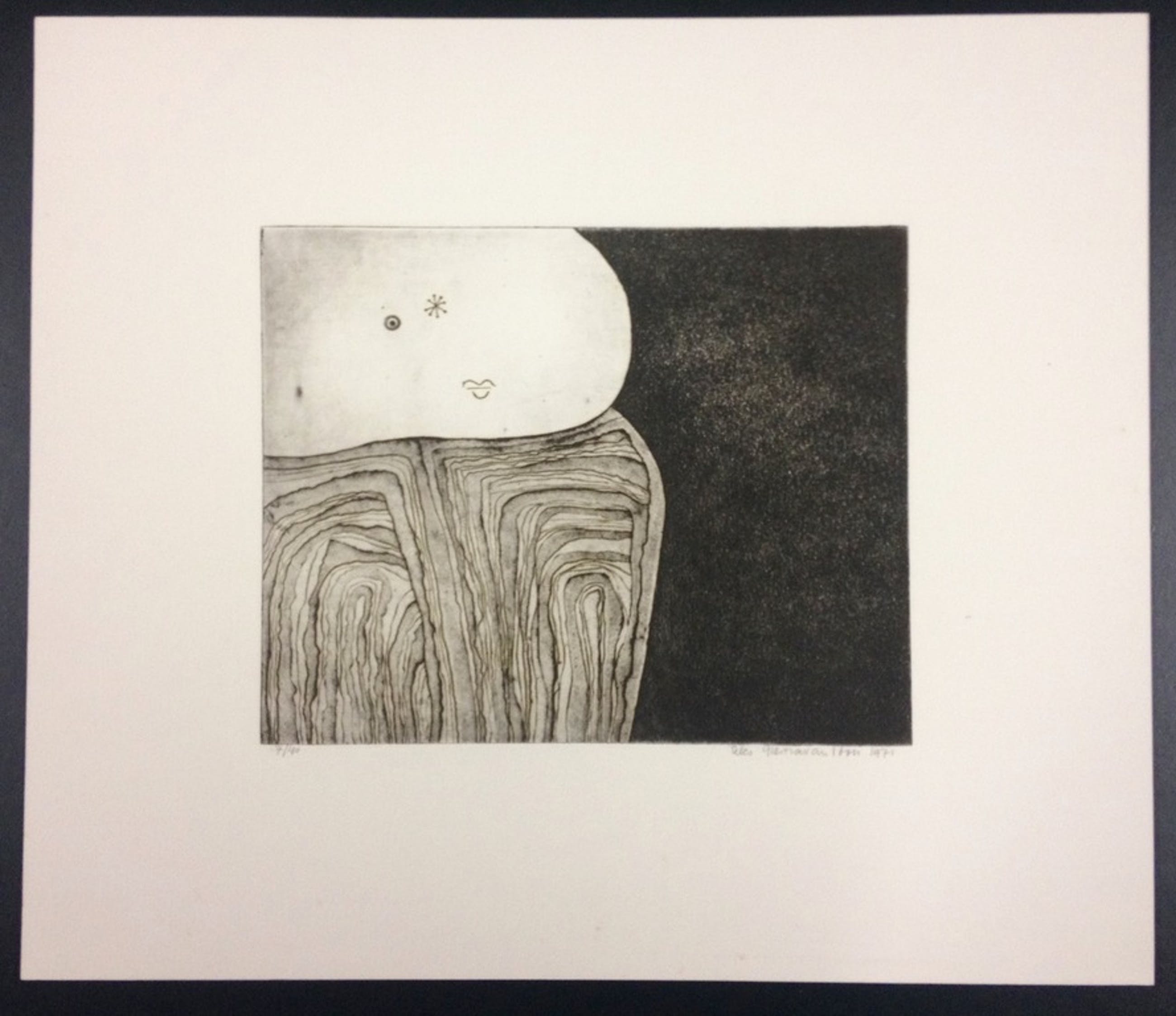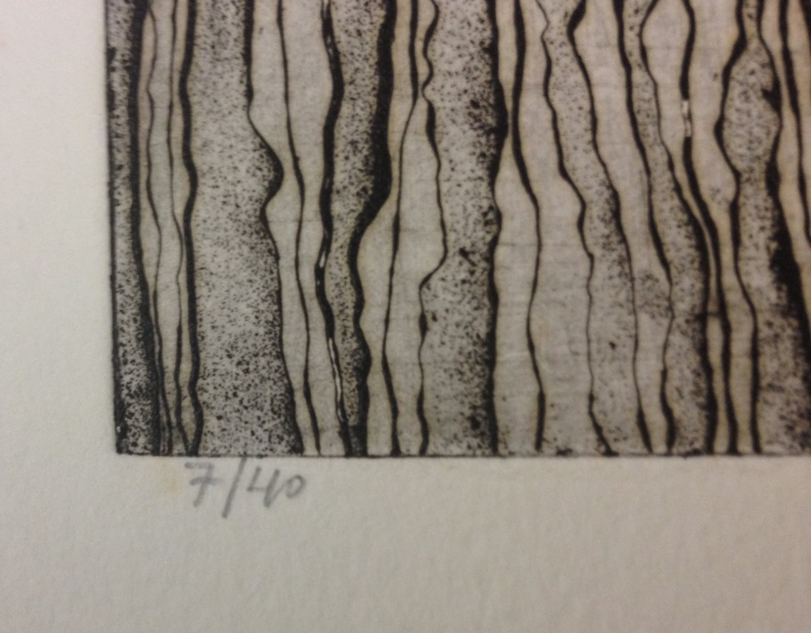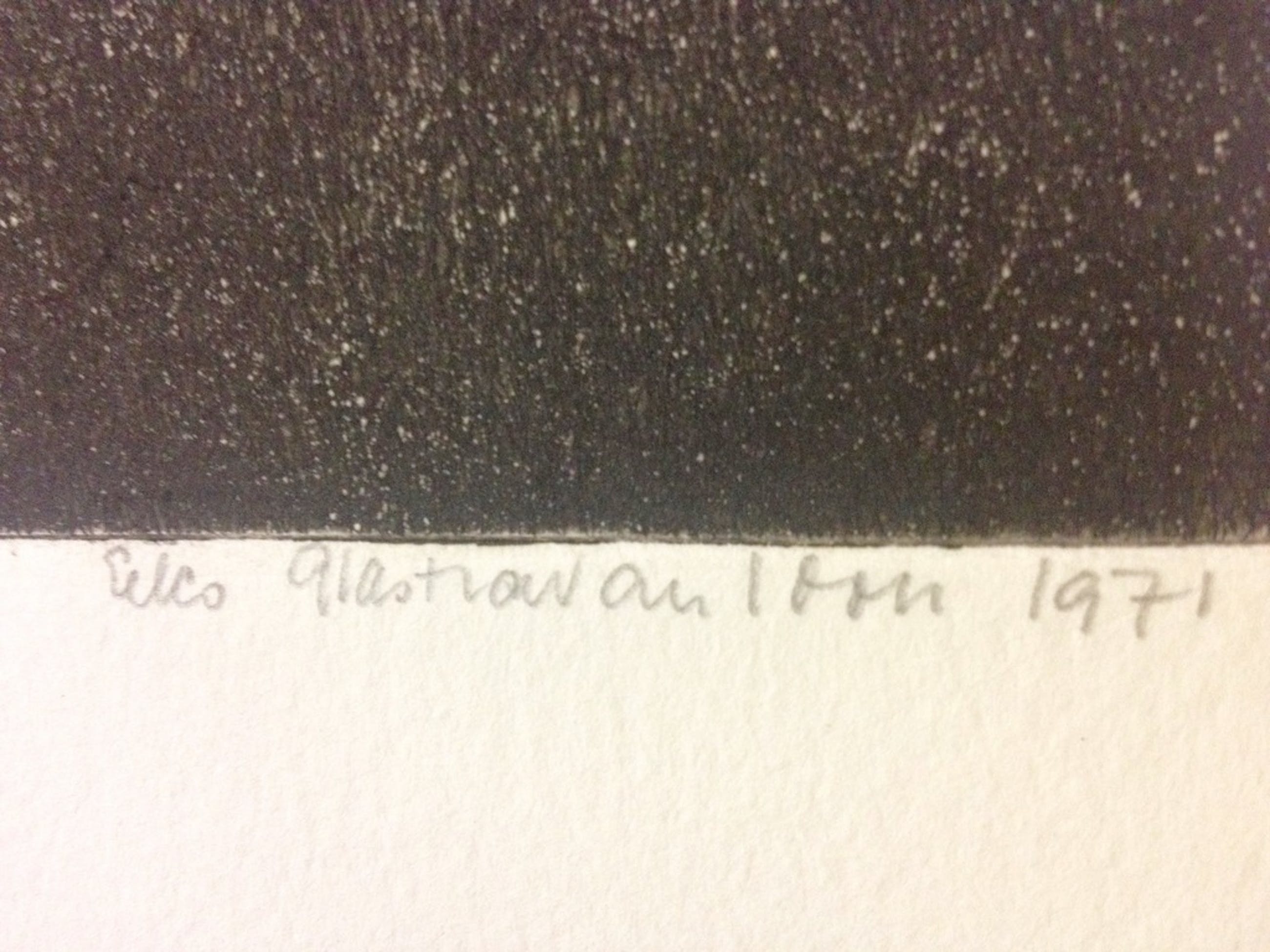 Een redelijk vroege ets van Glastra van Loon uit 1971, "Onschuld. Technisch ook mooi uitgevoerde ets van 25x20 (cm)2 op geschept papier, 43x37 (cm)2. handgesigneerd, -gedateerd rechtsonder, handgenummerd 7/40 linksonder.