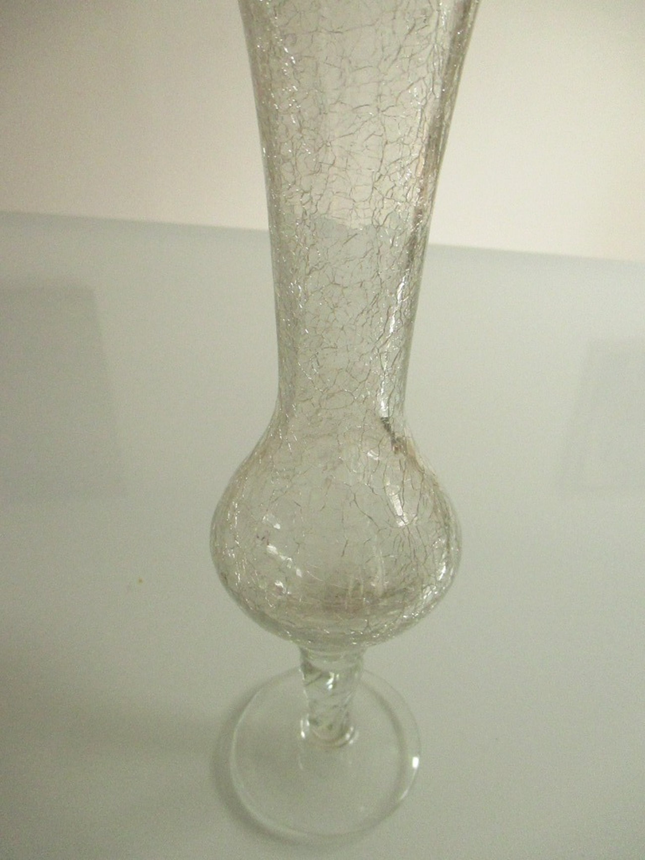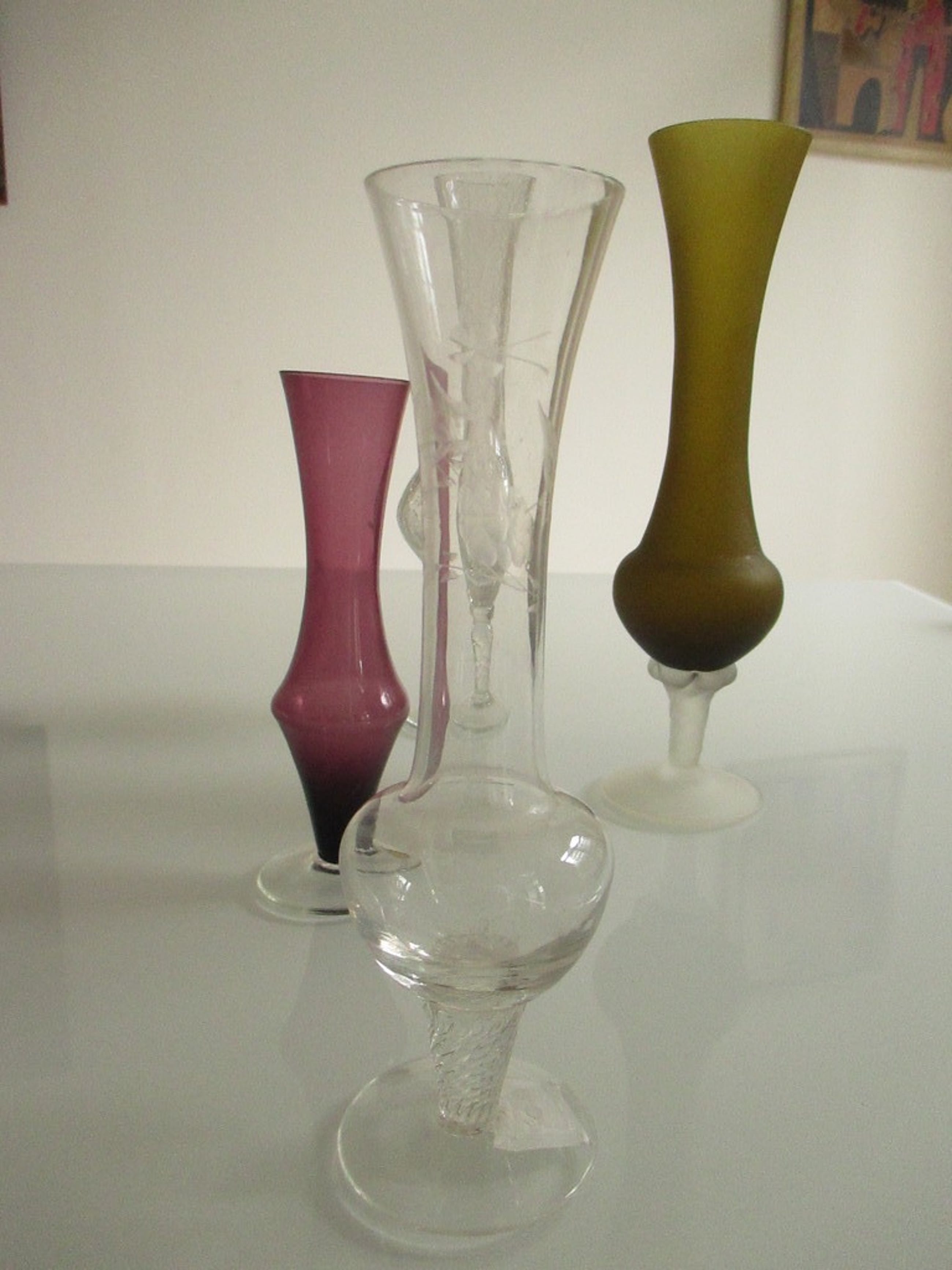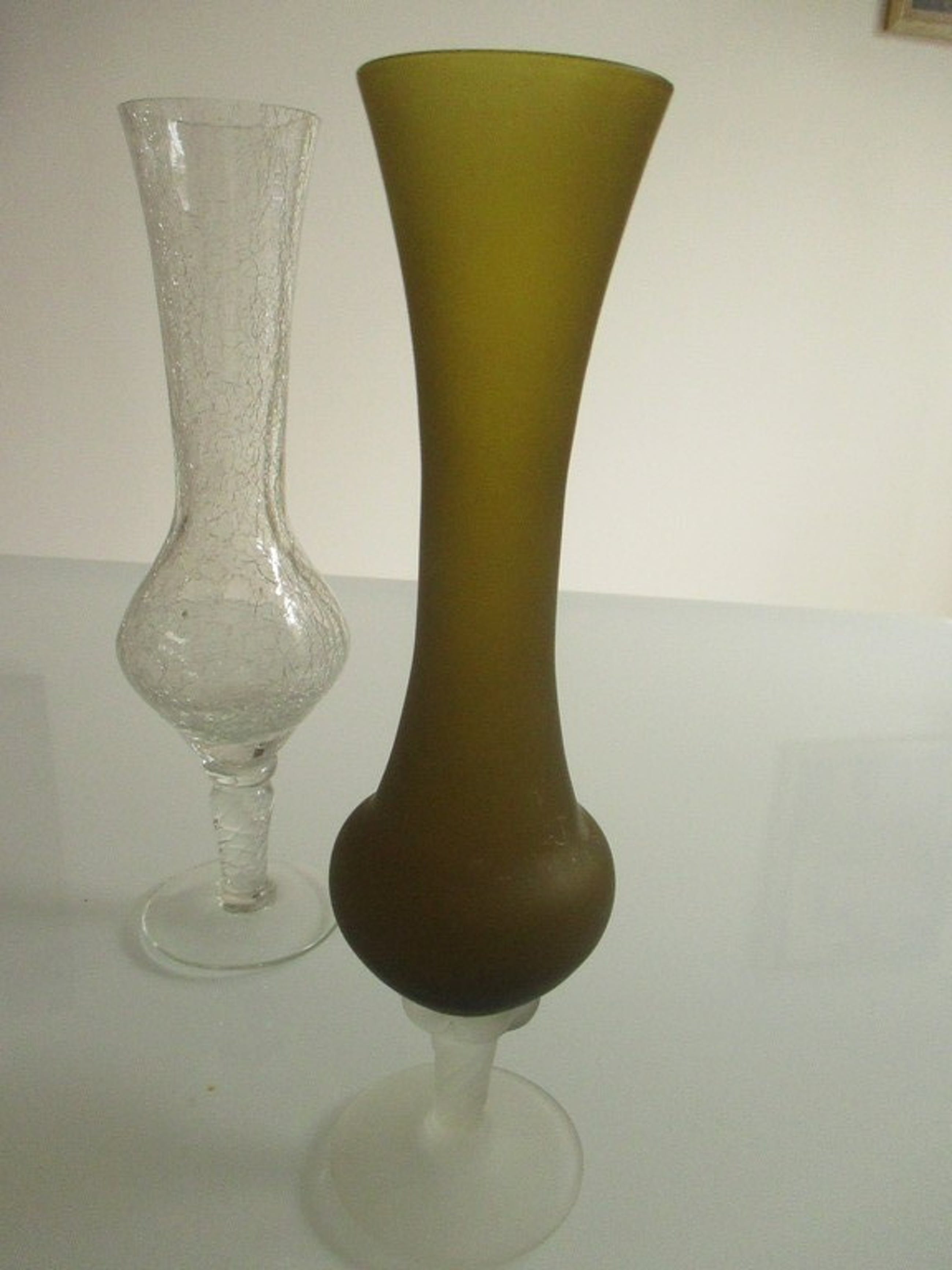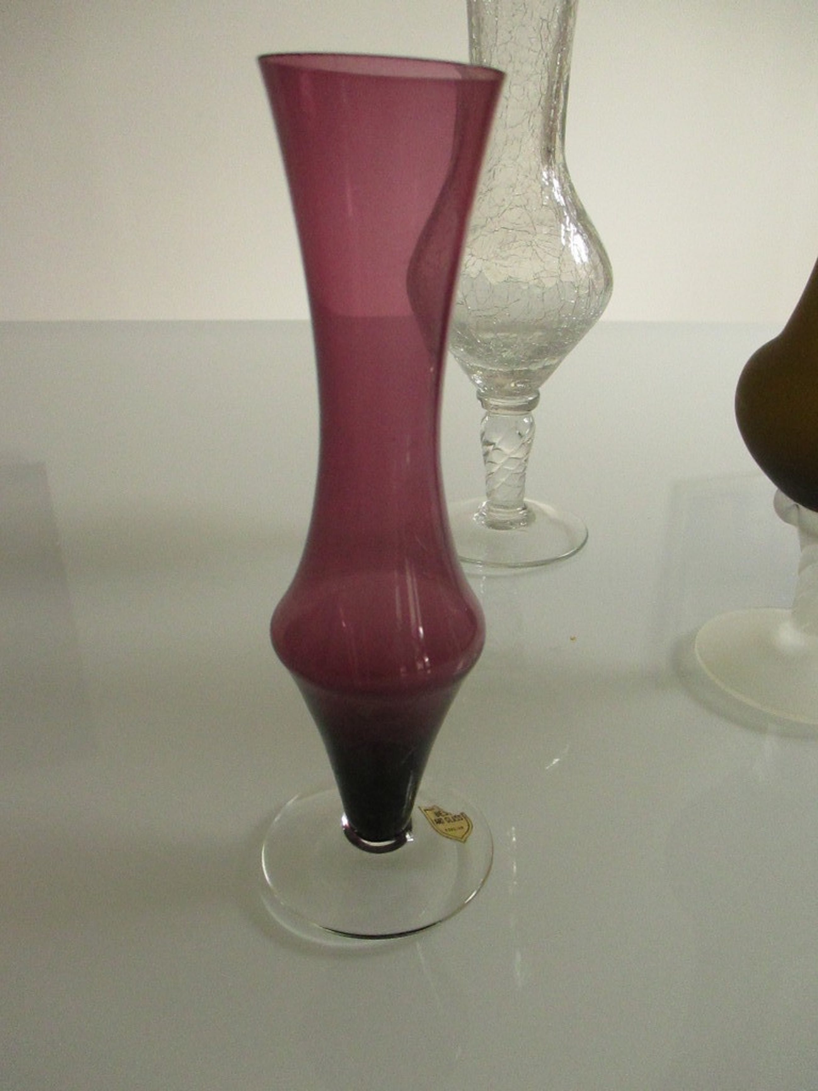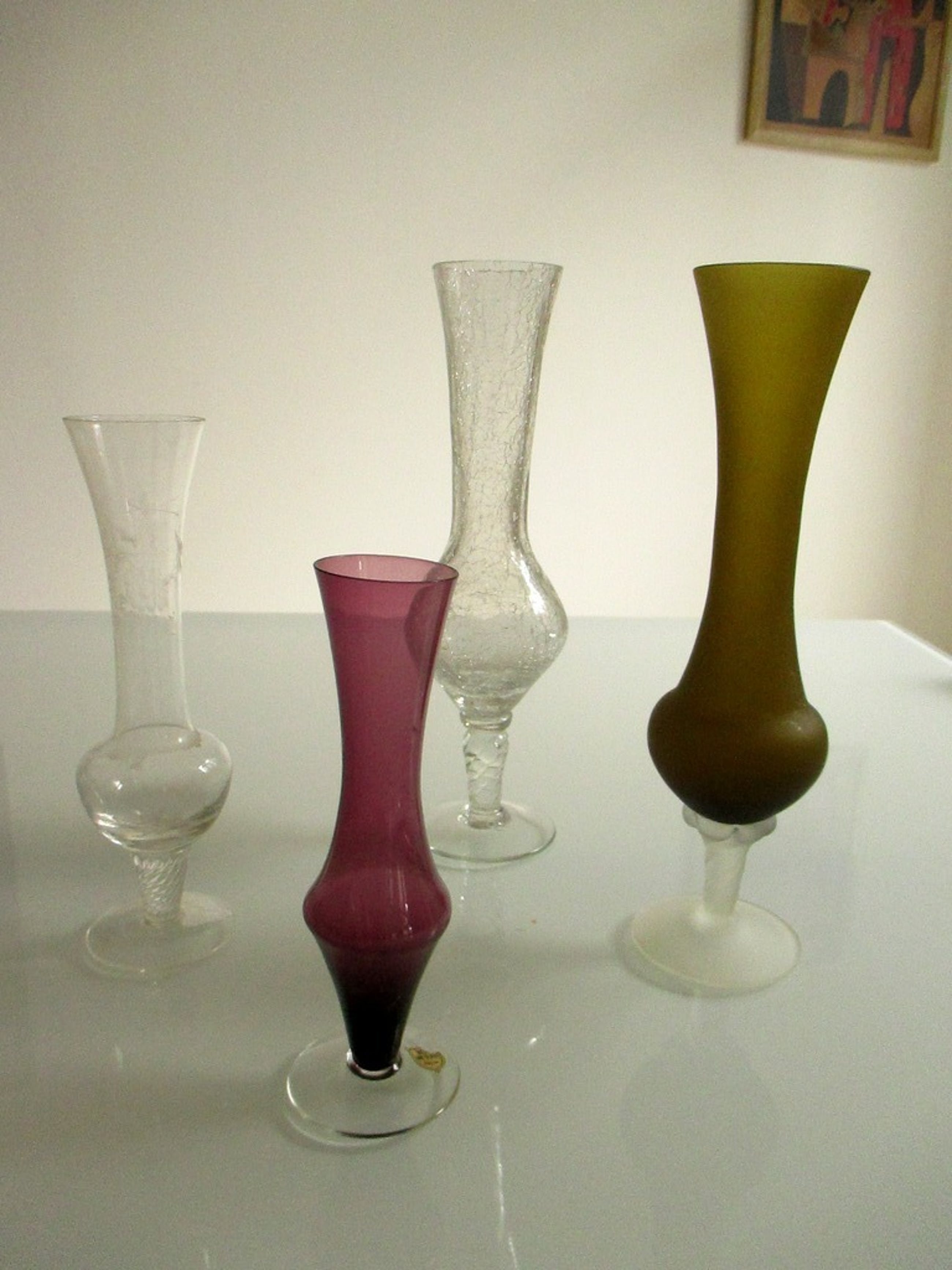 Twee narcissenvaasjes van helder glas waarvan een vaasje met krakuleeglas. Een vaasje in een roodbruine kleur en een vaasje in een groene kleur.