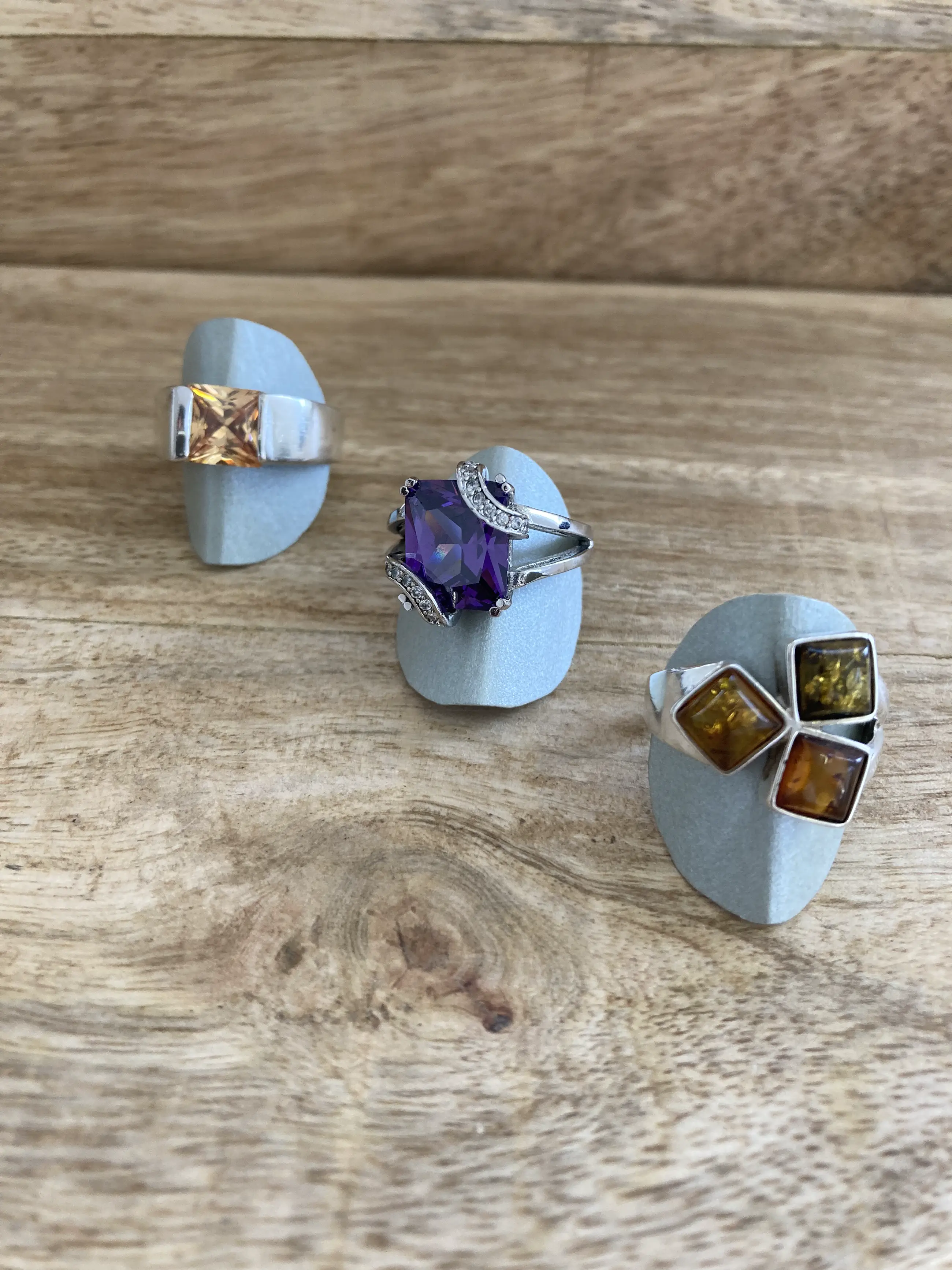Een Lotje van drie zilveren ringen met kleursteen, zirkonia en barnsteen.