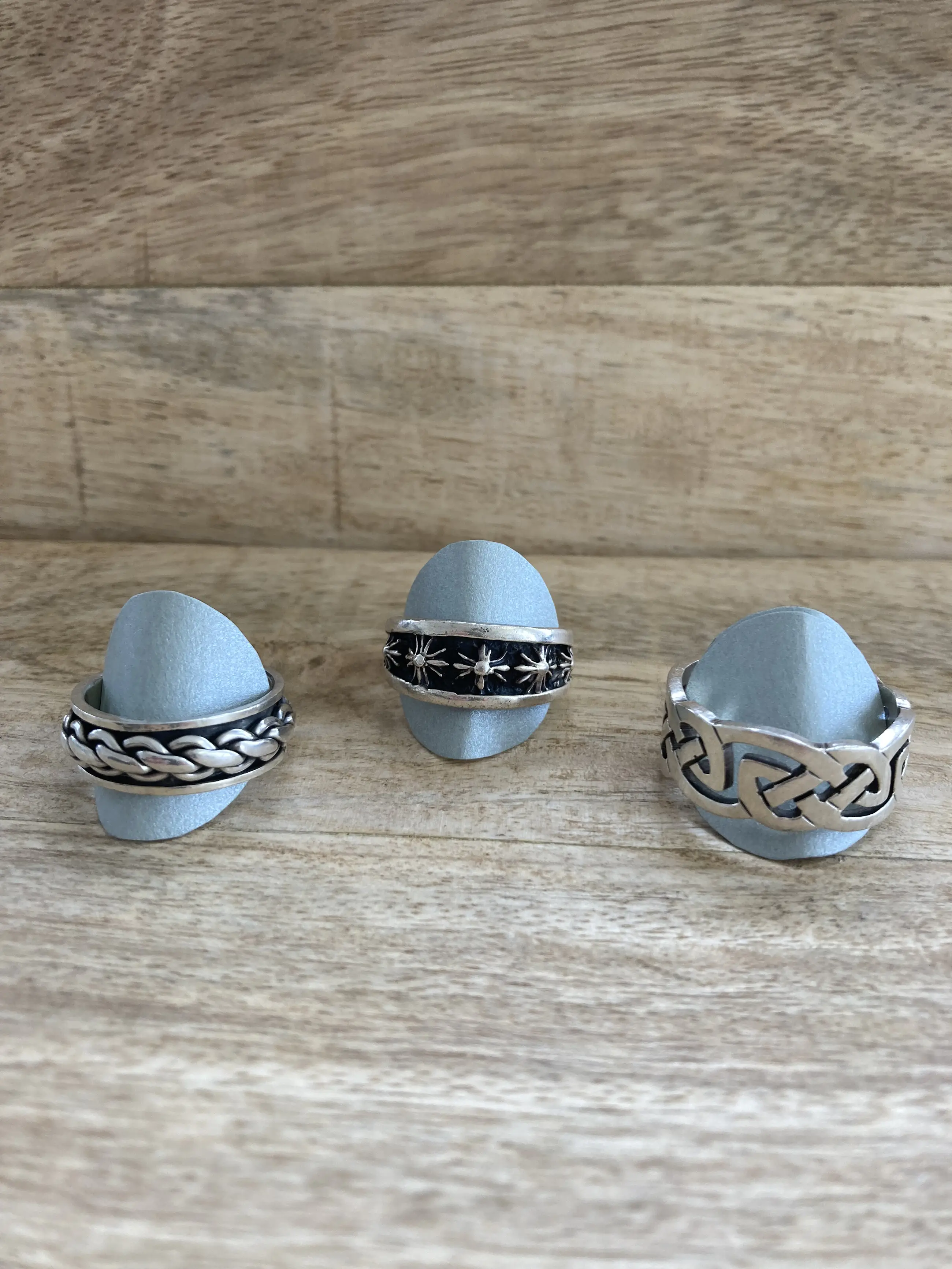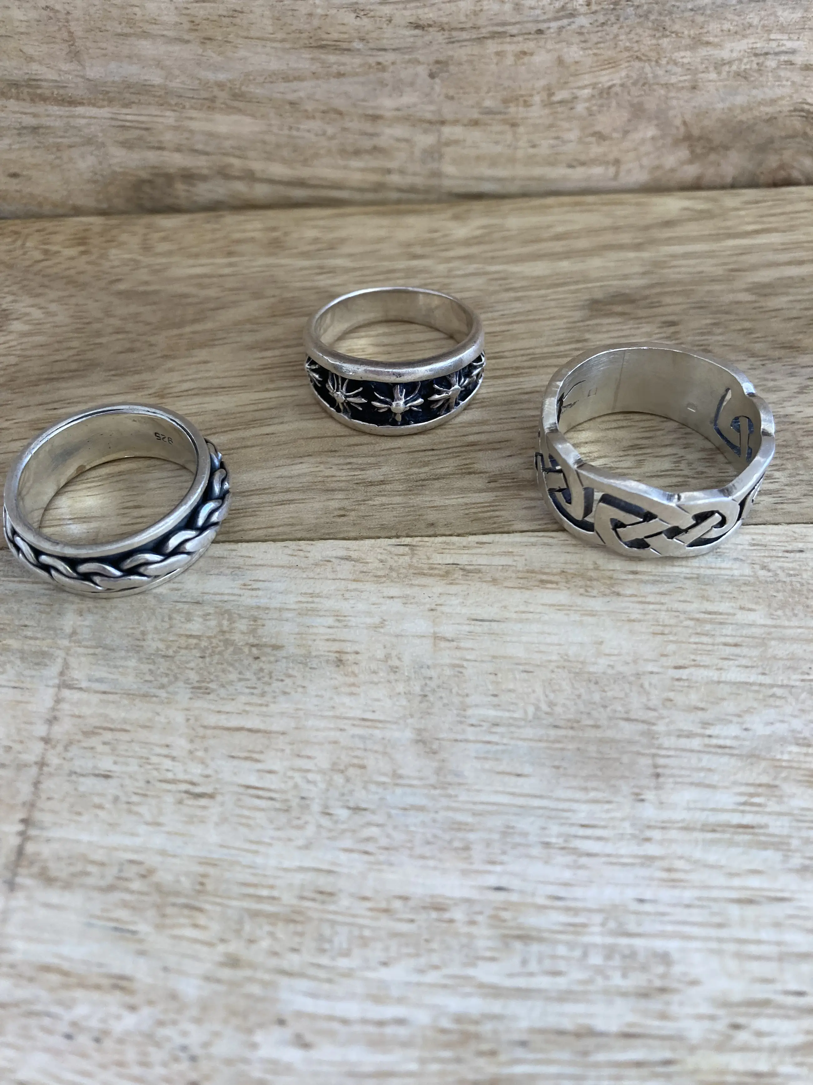Een lotje van drie zilveren (heren)ringen met verschillende bewerking, waaronder één ring met roterende gourmetschakel.