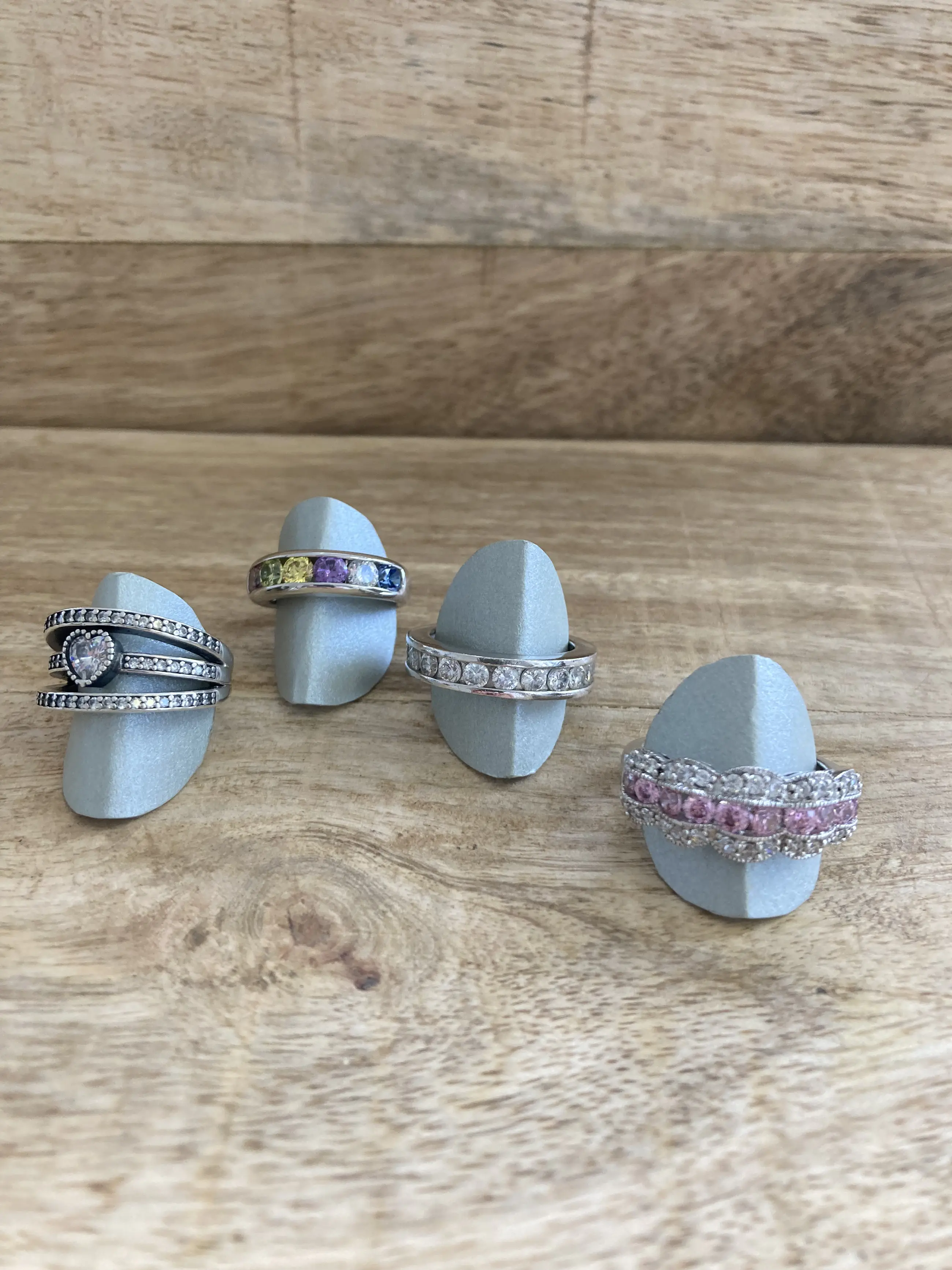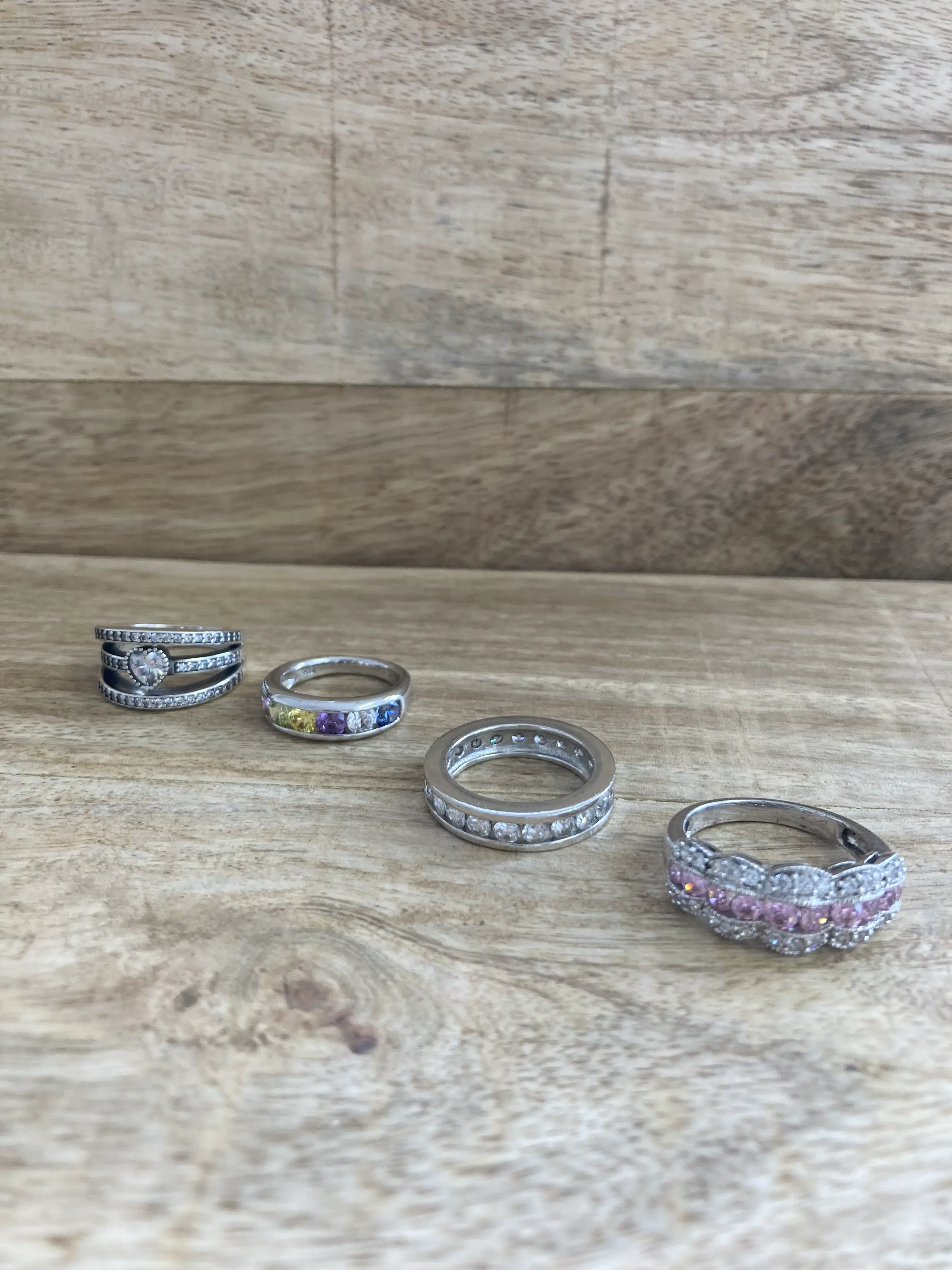 Een Lotje van vier zilverenringen met kleurstenen en zirkonia.