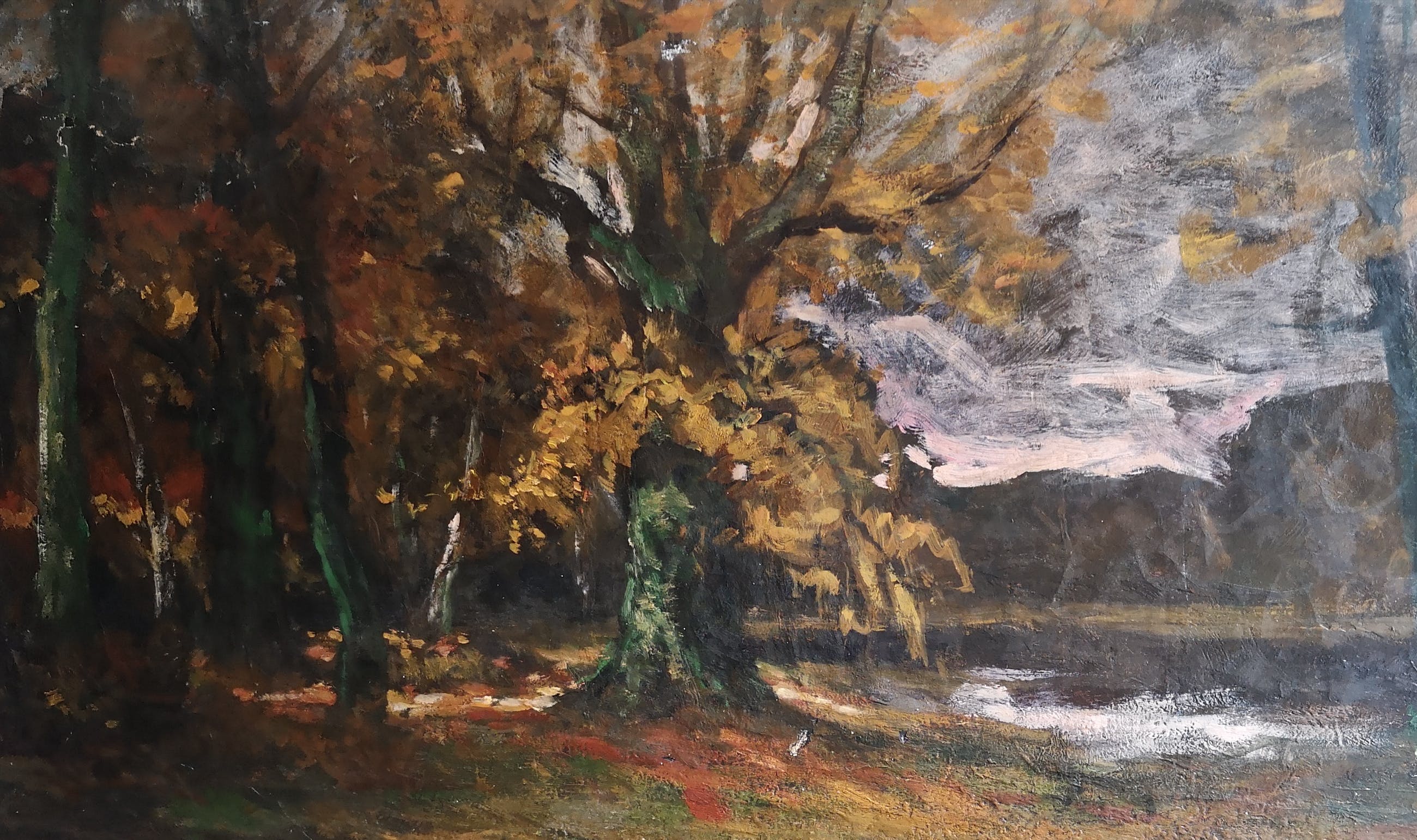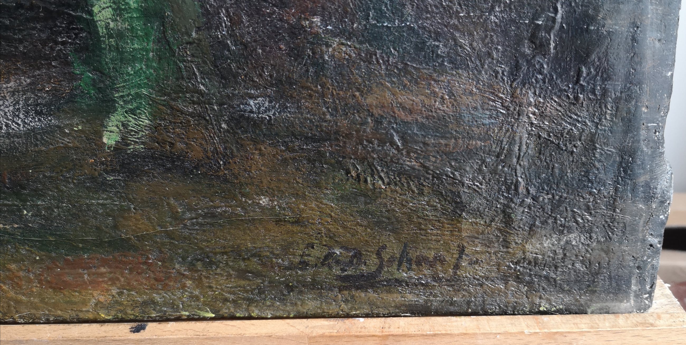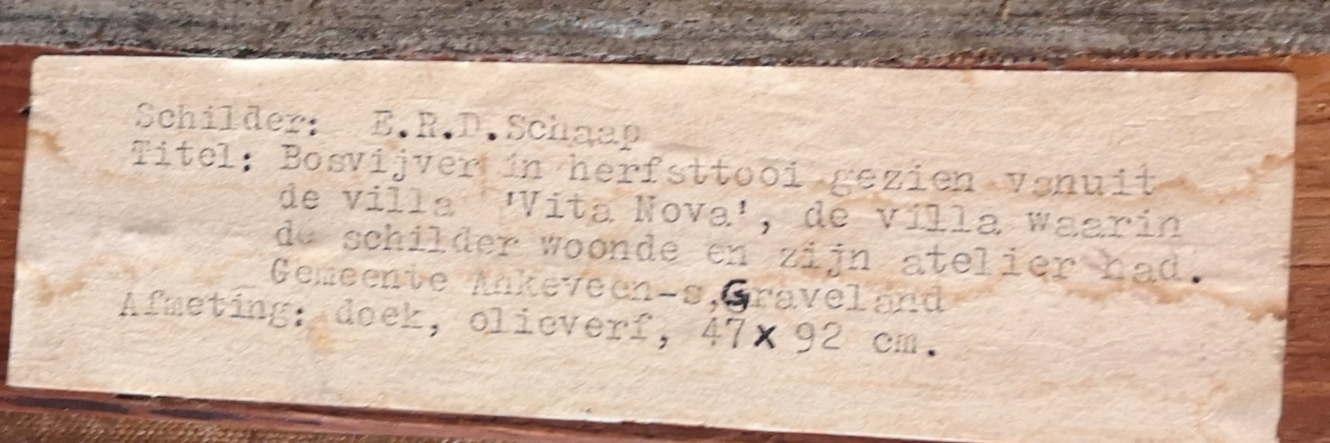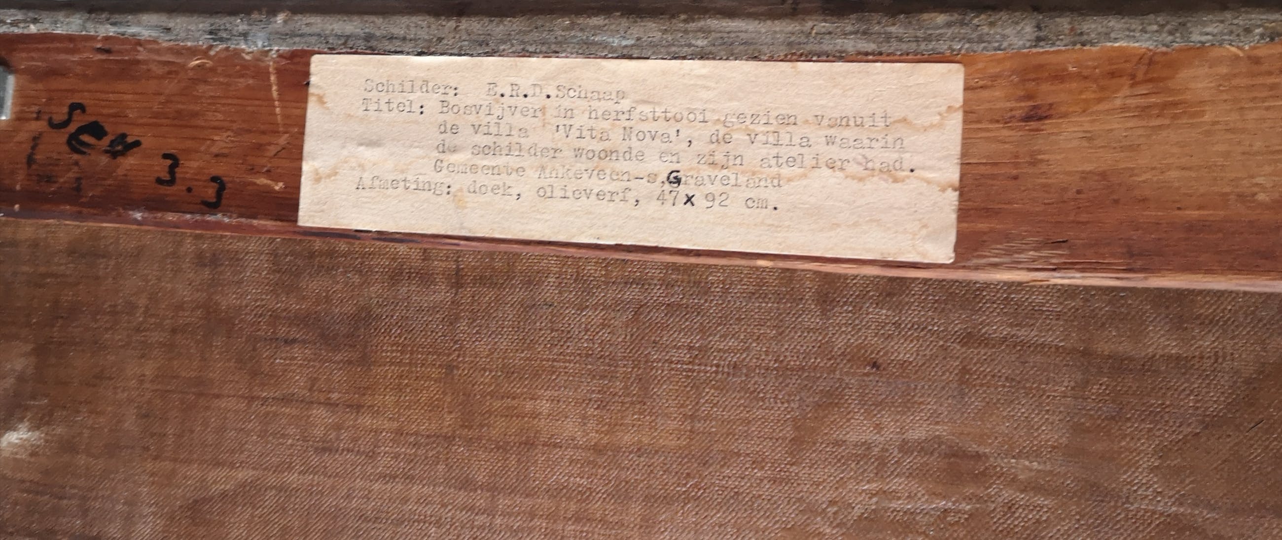 Bosvijver in hersttooi is geschilderd vanuit villa Nova(Ankeveen/, Graveland) met zicht op die tuin. De schilder Egerbert Schaap had hier zijn atelier. Het schilderij is uit z'n bruine periode waarin hij romantisch en klassiek schilderde. Periode 1913. Ik heb het schilderij al 40 jaar. Het schilderij wordt aangeboden zonder lijst maar er zat wel een goedkope lijst omheen die ik eventueel kan meesturen. Geen datum en sticker op achterzijde.