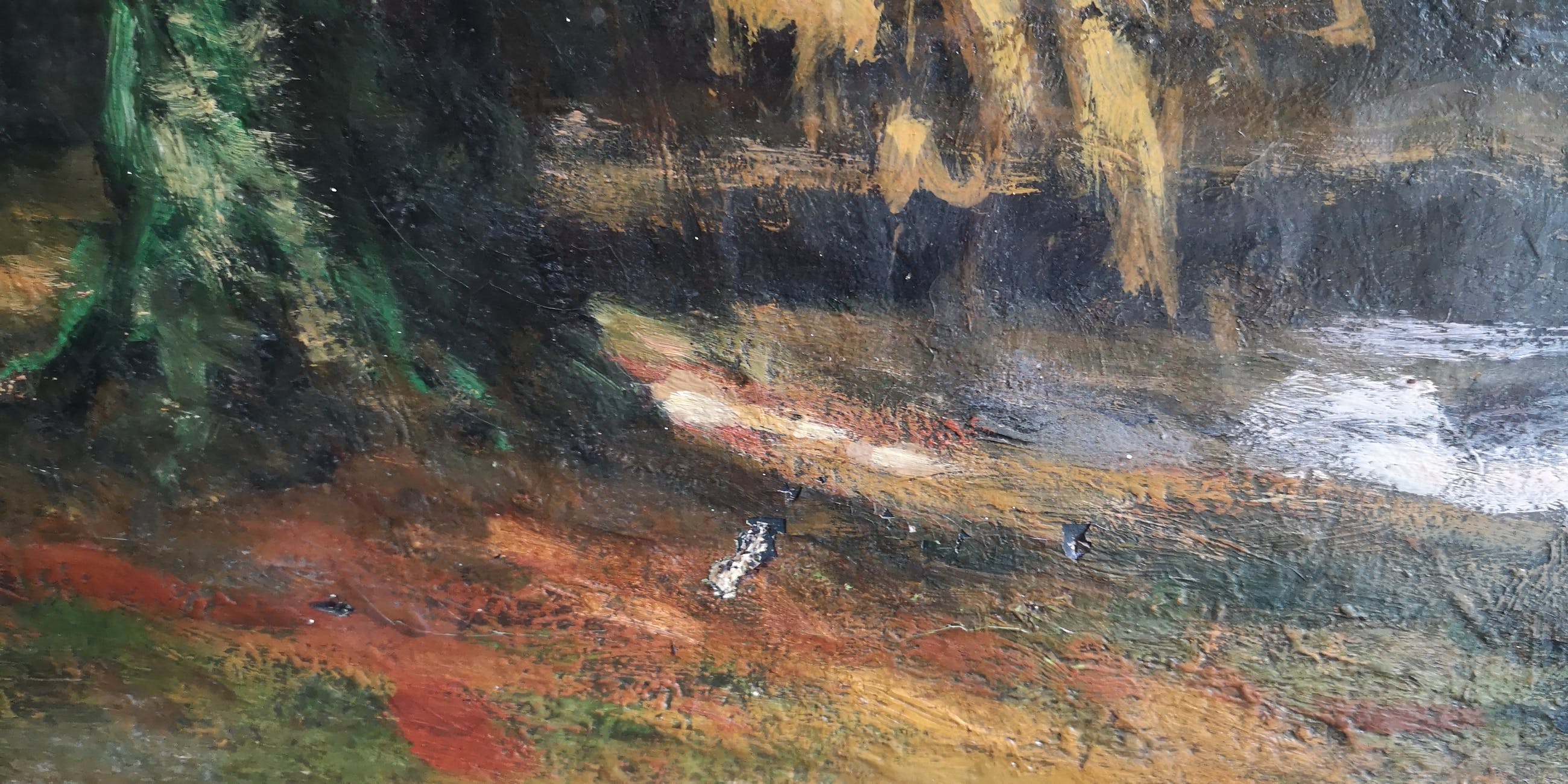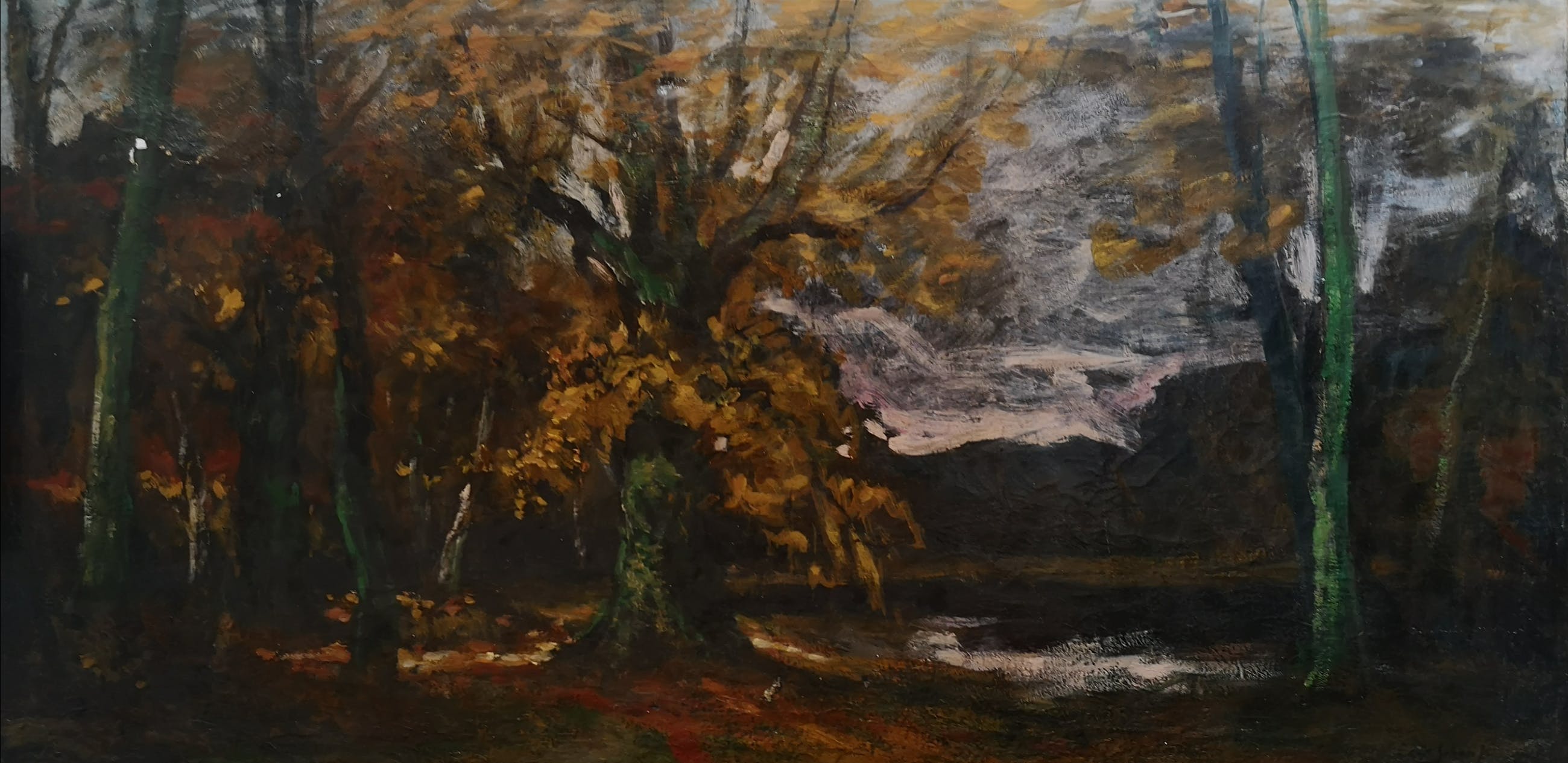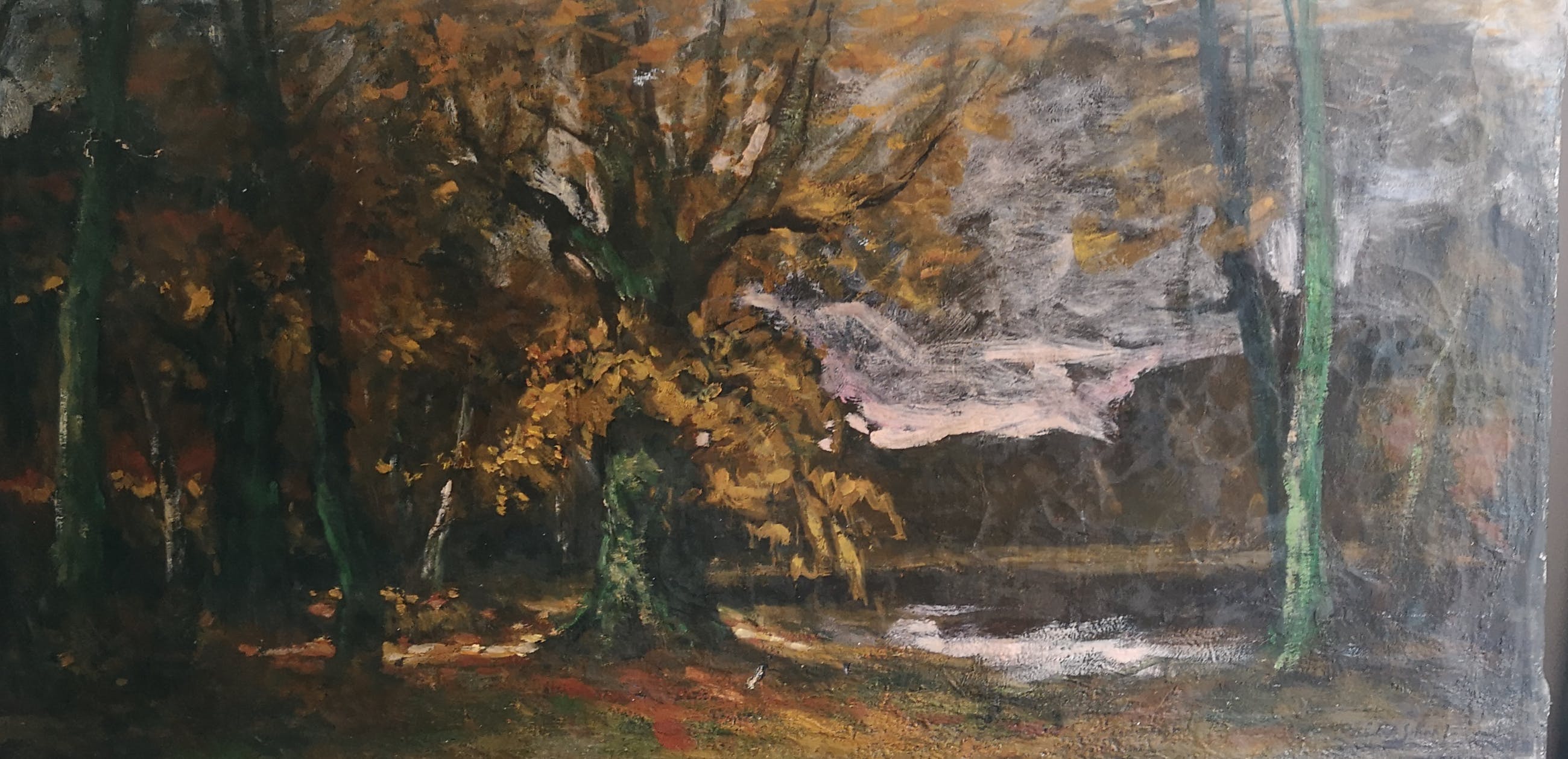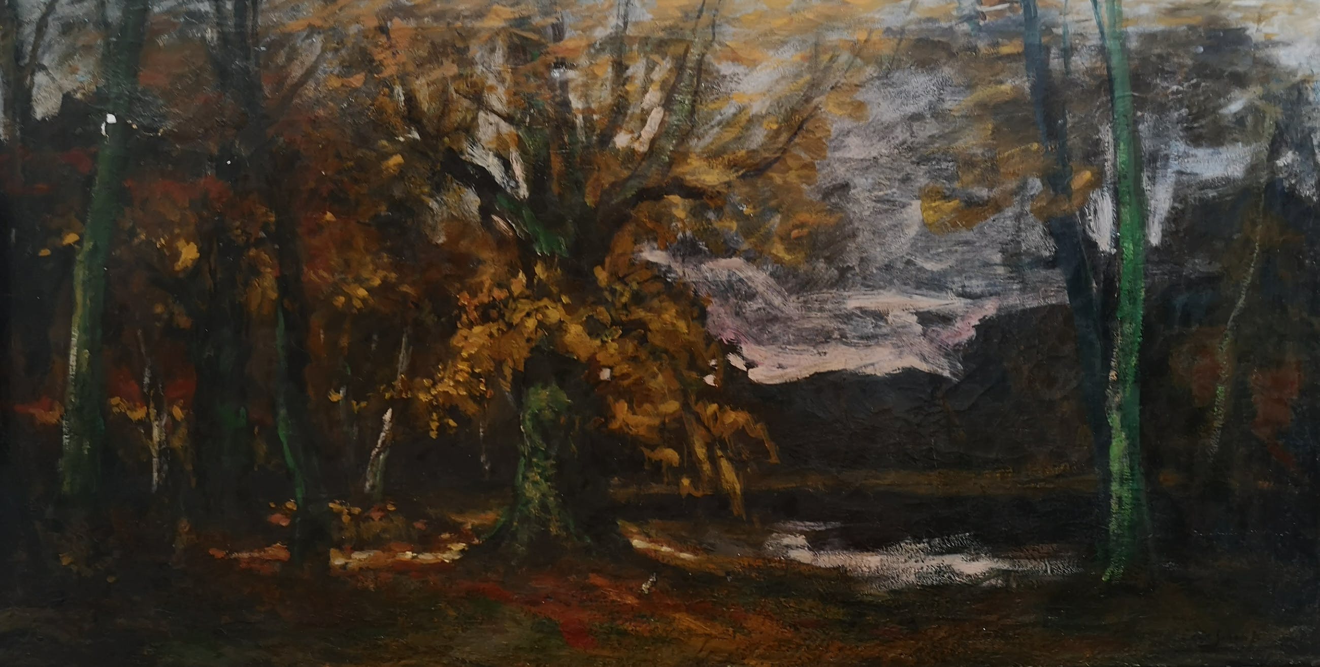 Bosvijver in hersttooi is geschilderd vanuit villa Nova(Ankeveen/, Graveland) met zicht op die tuin. De schilder Egerbert Schaap had hier zijn atelier. Het schilderij is uit z'n bruine periode waarin hij romantisch en klassiek schilderde. Periode 1913. Ik heb het schilderij al 40 jaar. Het schilderij wordt aangeboden zonder lijst maar er zat wel een goedkope lijst omheen die ik eventueel kan meesturen. Geen datum en sticker op achterzijde.