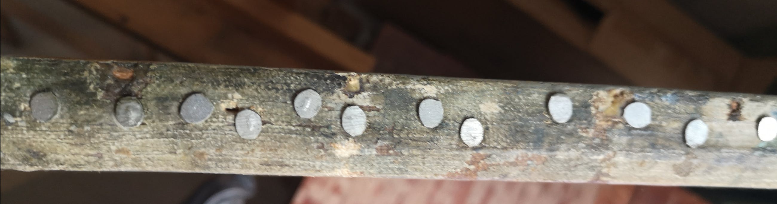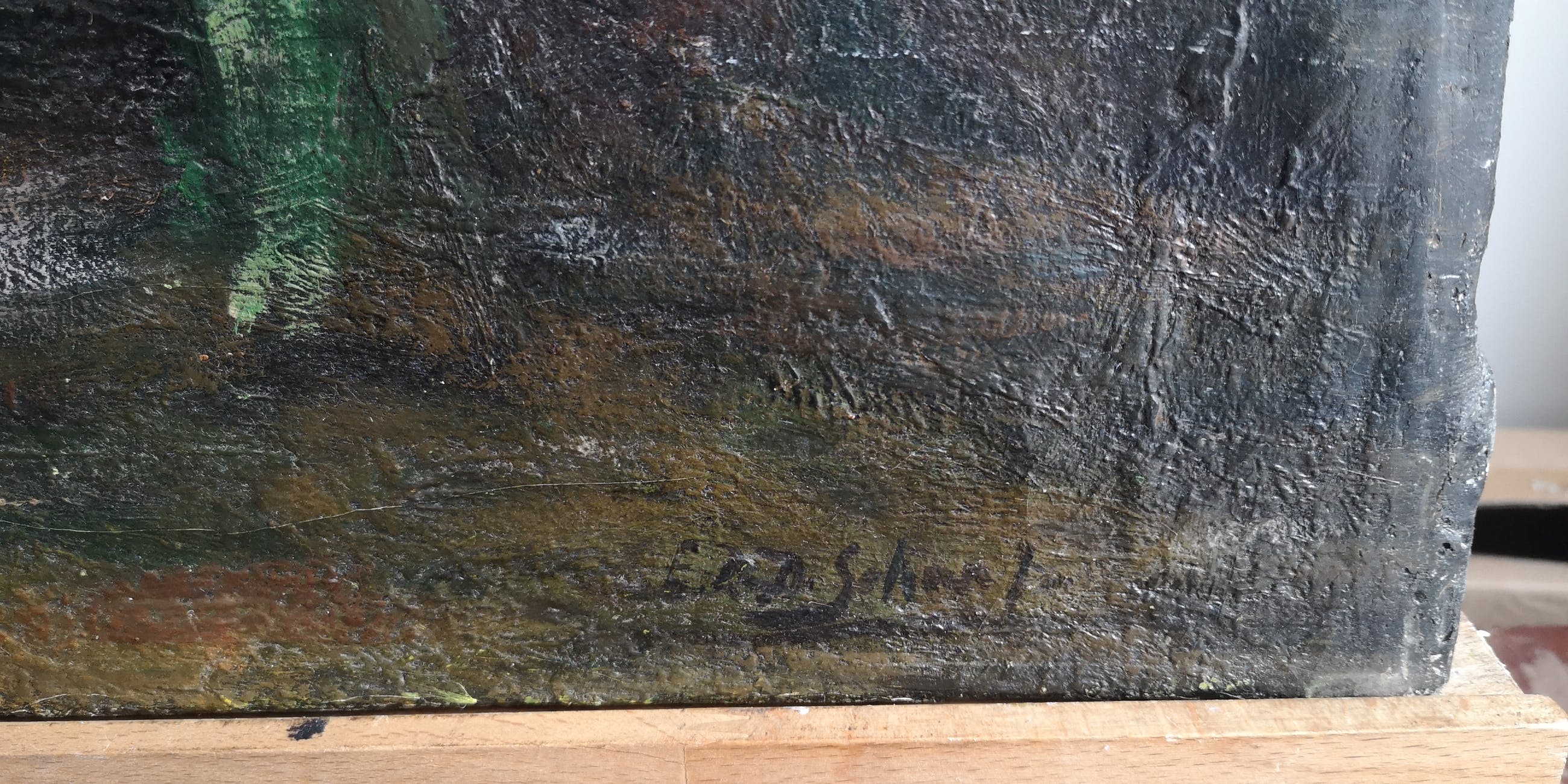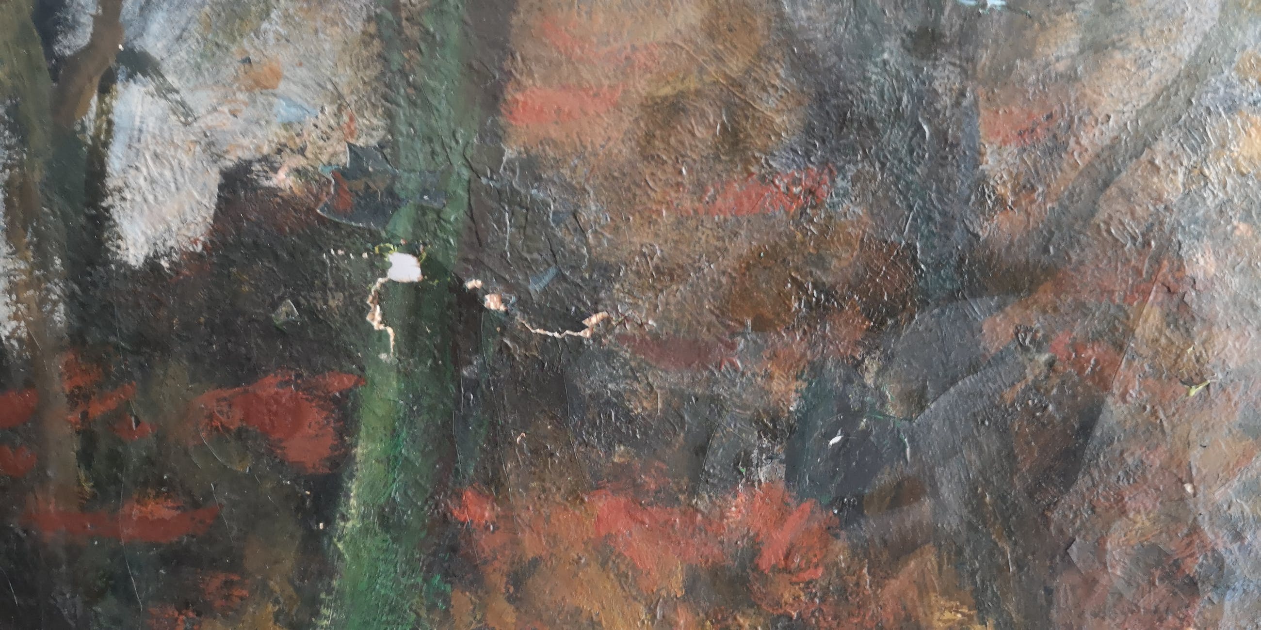 Het schilderij heeft een klein gaatje in het doek en op 1 plek is er wat verf weg.