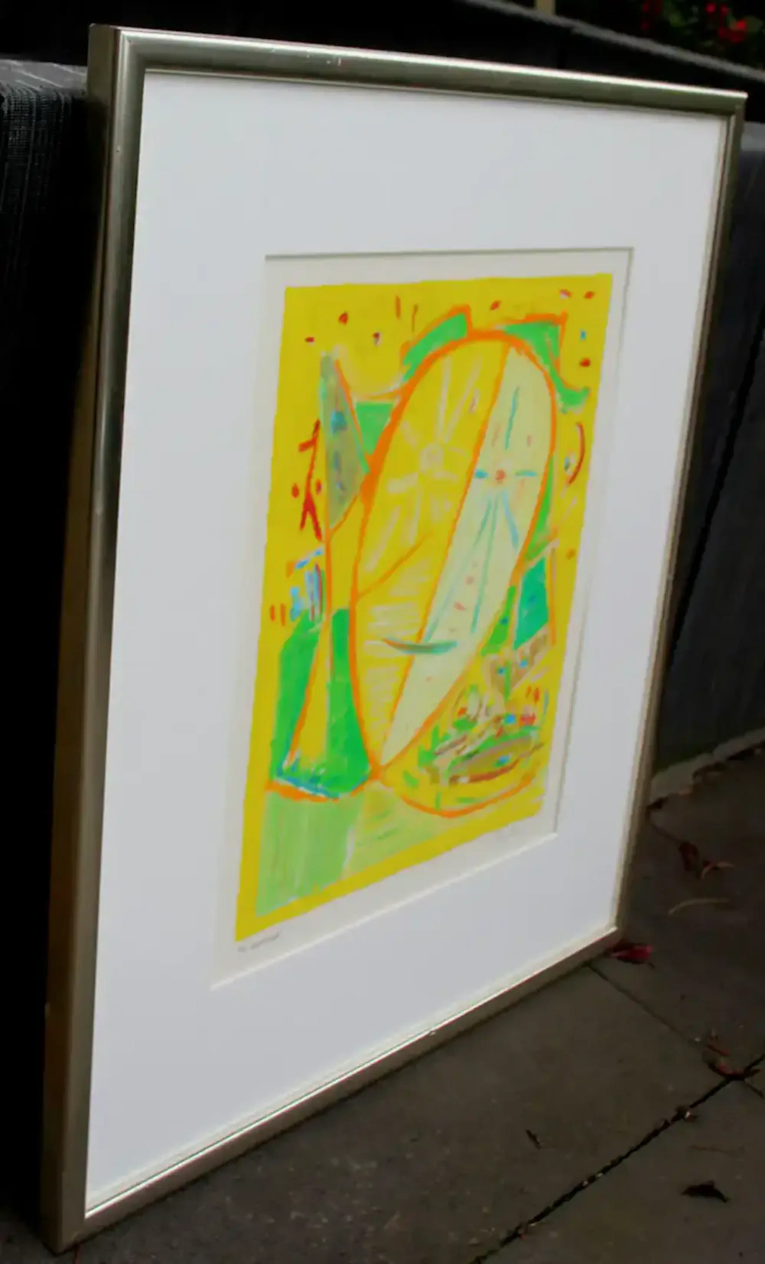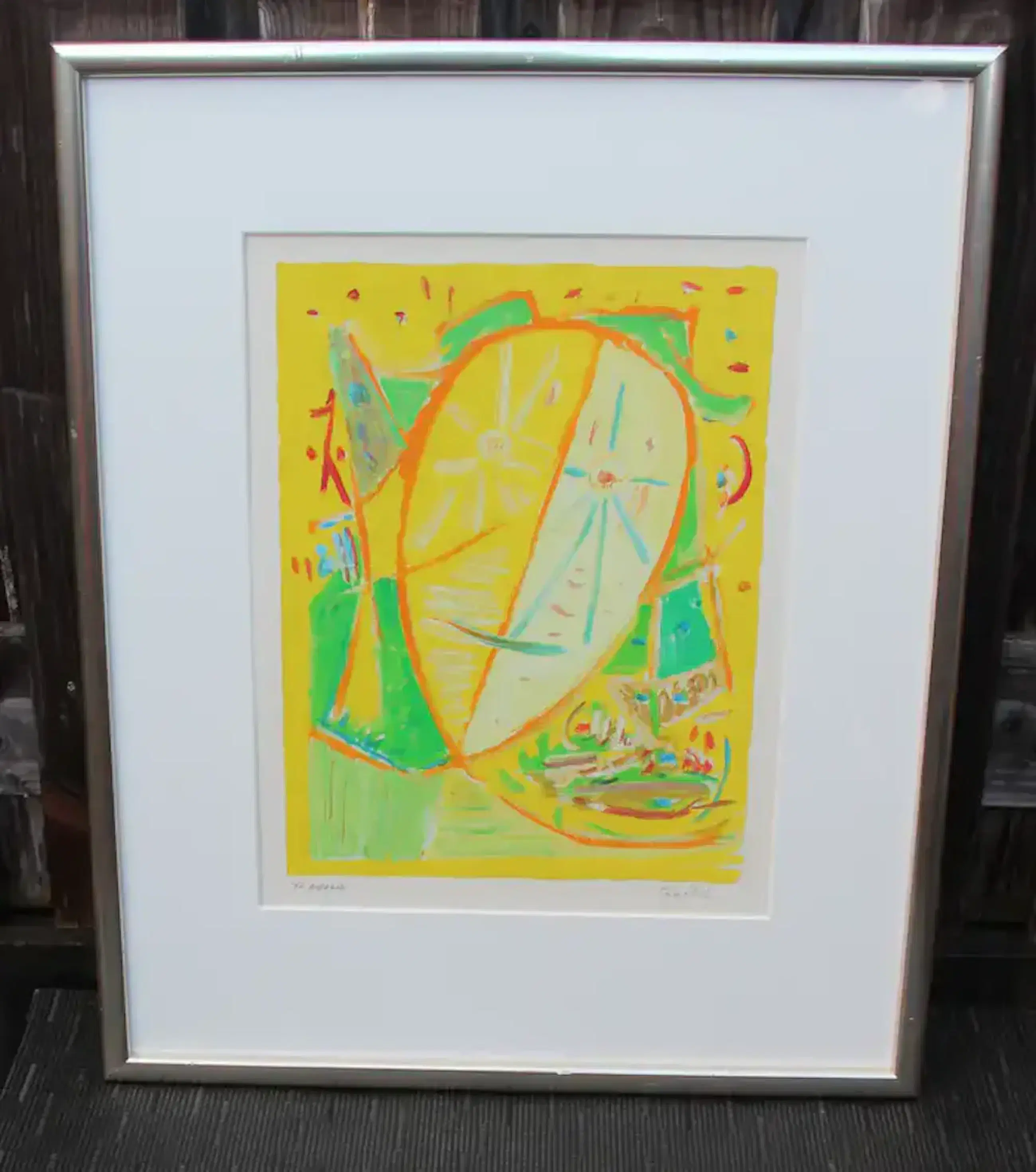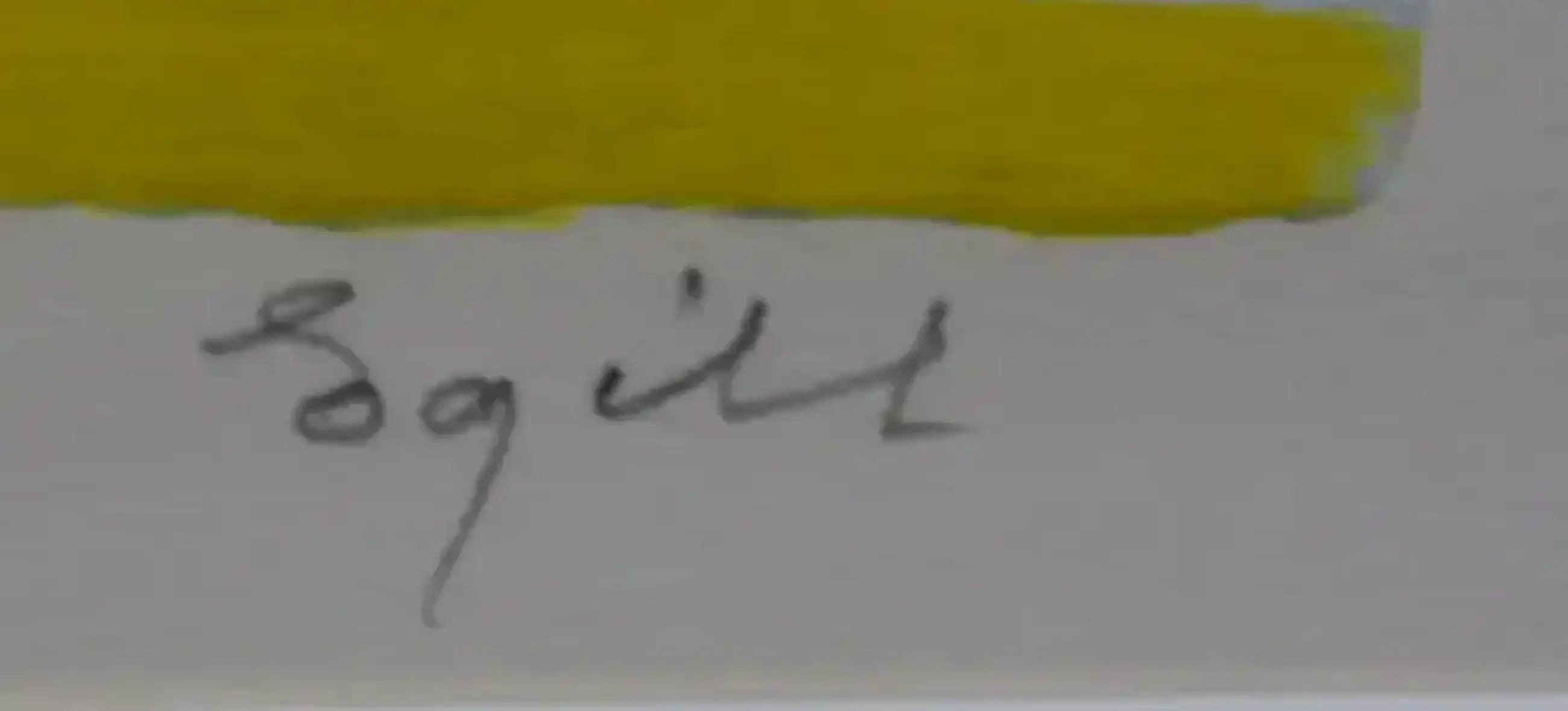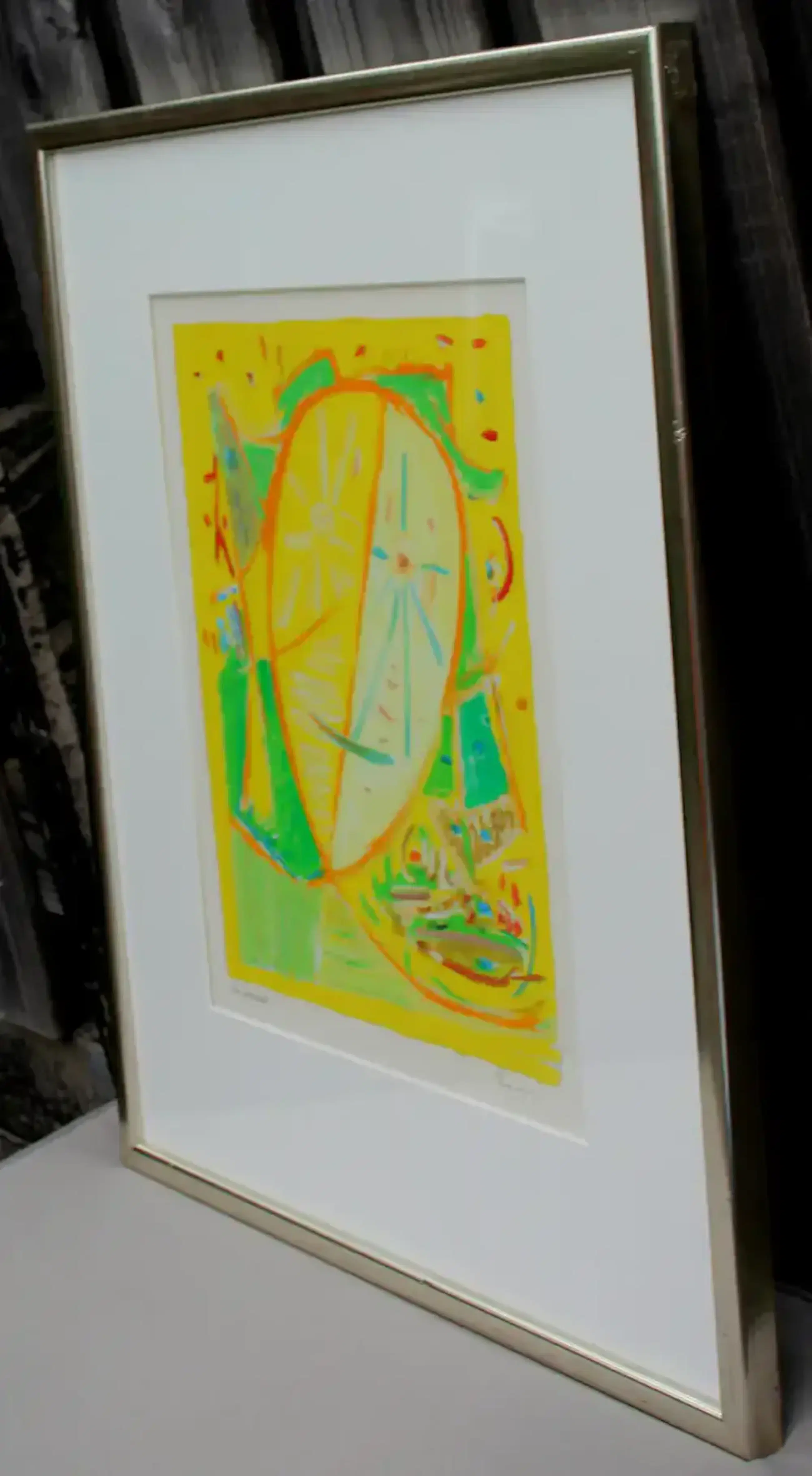 Ingelijste zeefdruk van Egill Jacobsen. Titel: Geel masker. In opdracht, l.o: "To Nellie". Afmetingen incl lijst: H70.5 x b58cm. Afmetingen voorstelling: H41 x b31cm. Het werk is rechtsonder, met potlood, gesigneerd door de kunstenaar. De authenticiteit van het aangeboden werk wordt volledig gegarandeerd. Een certificaat van echtheid kan, op aanvraag, worden gemaild.