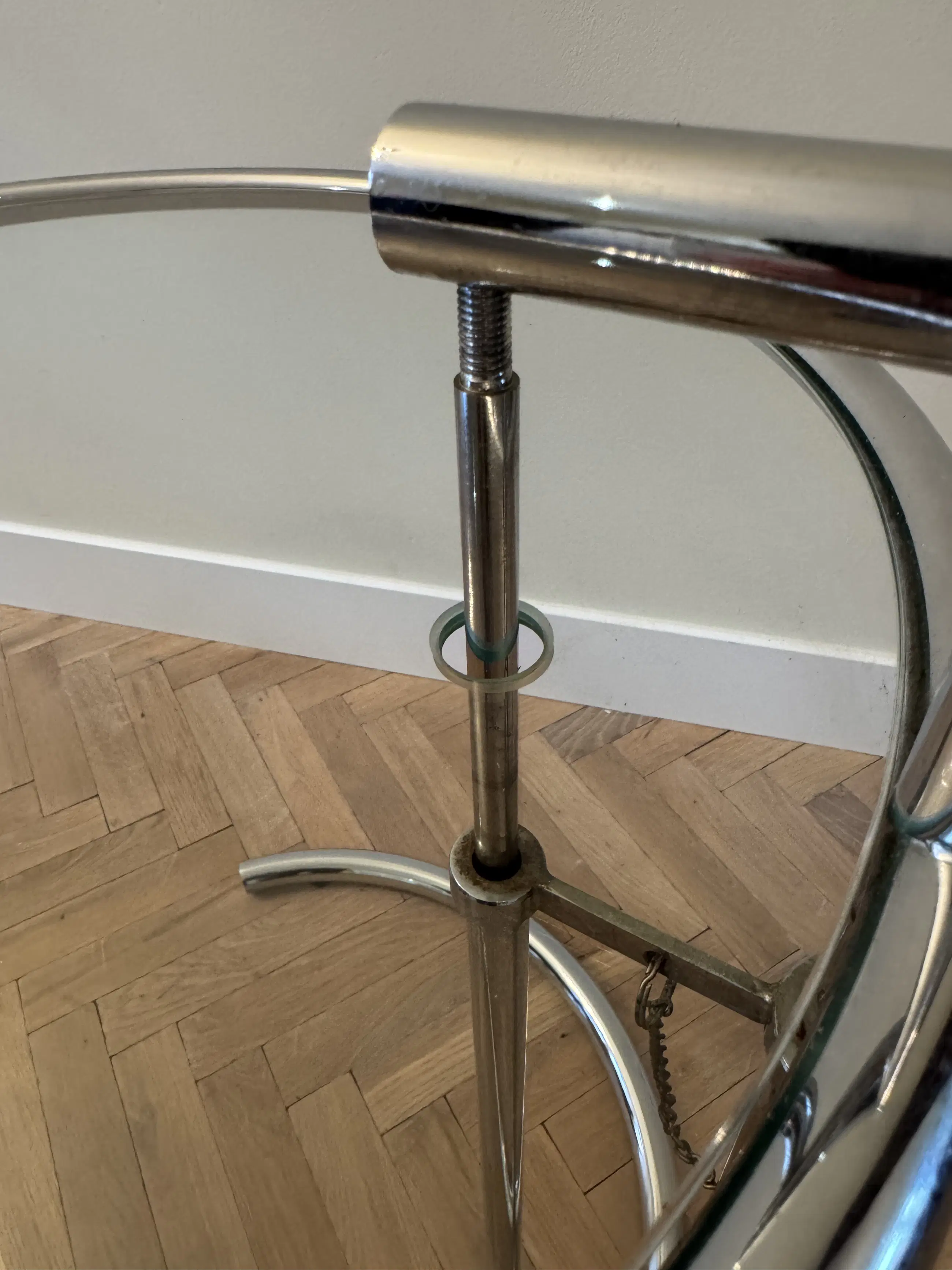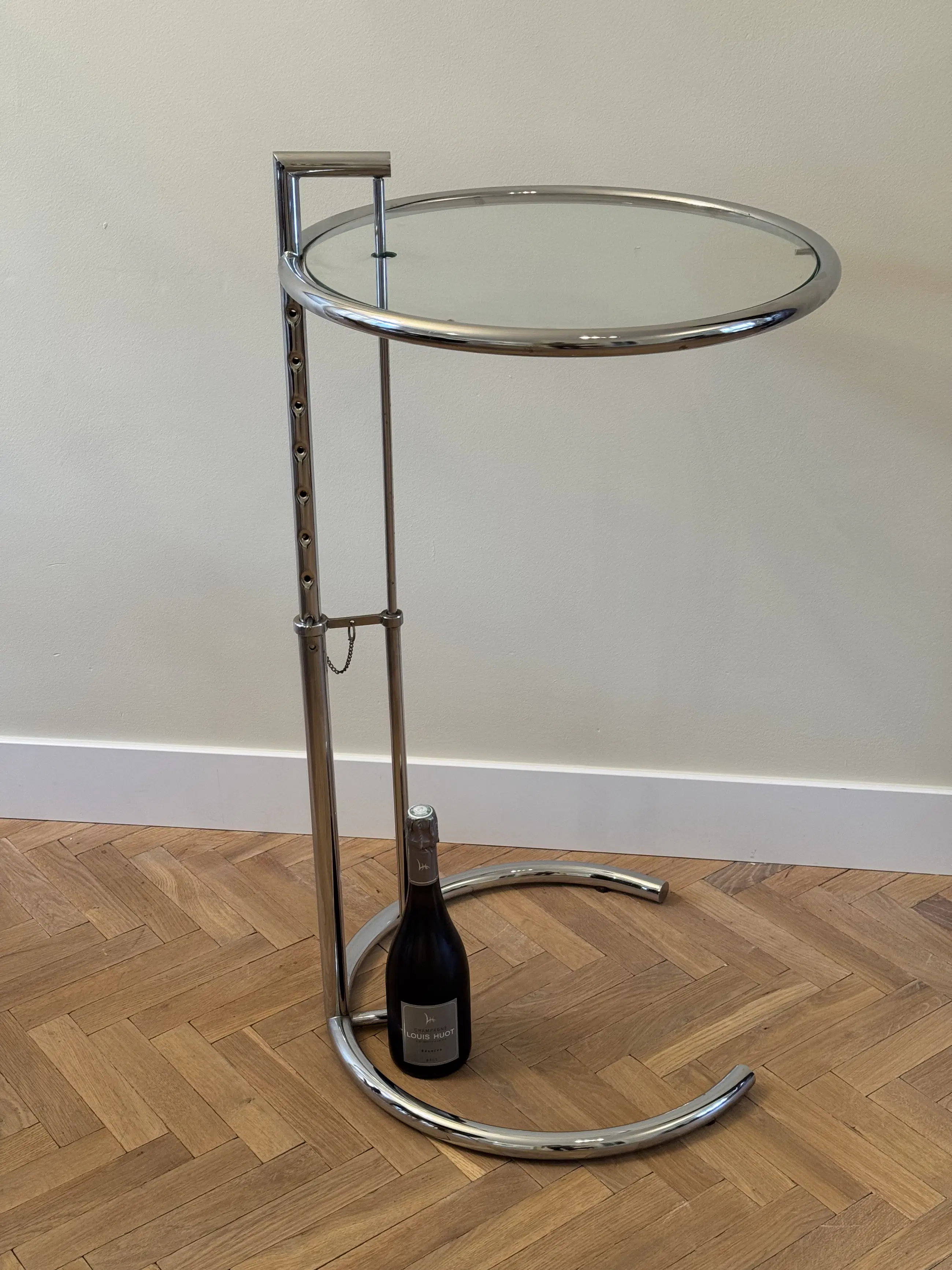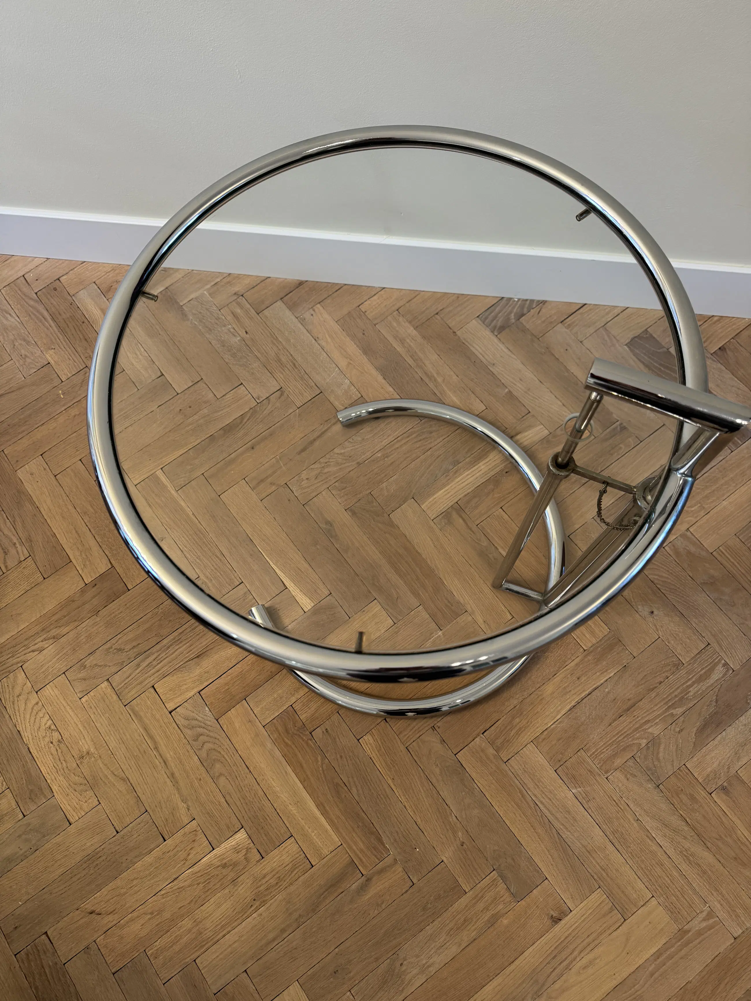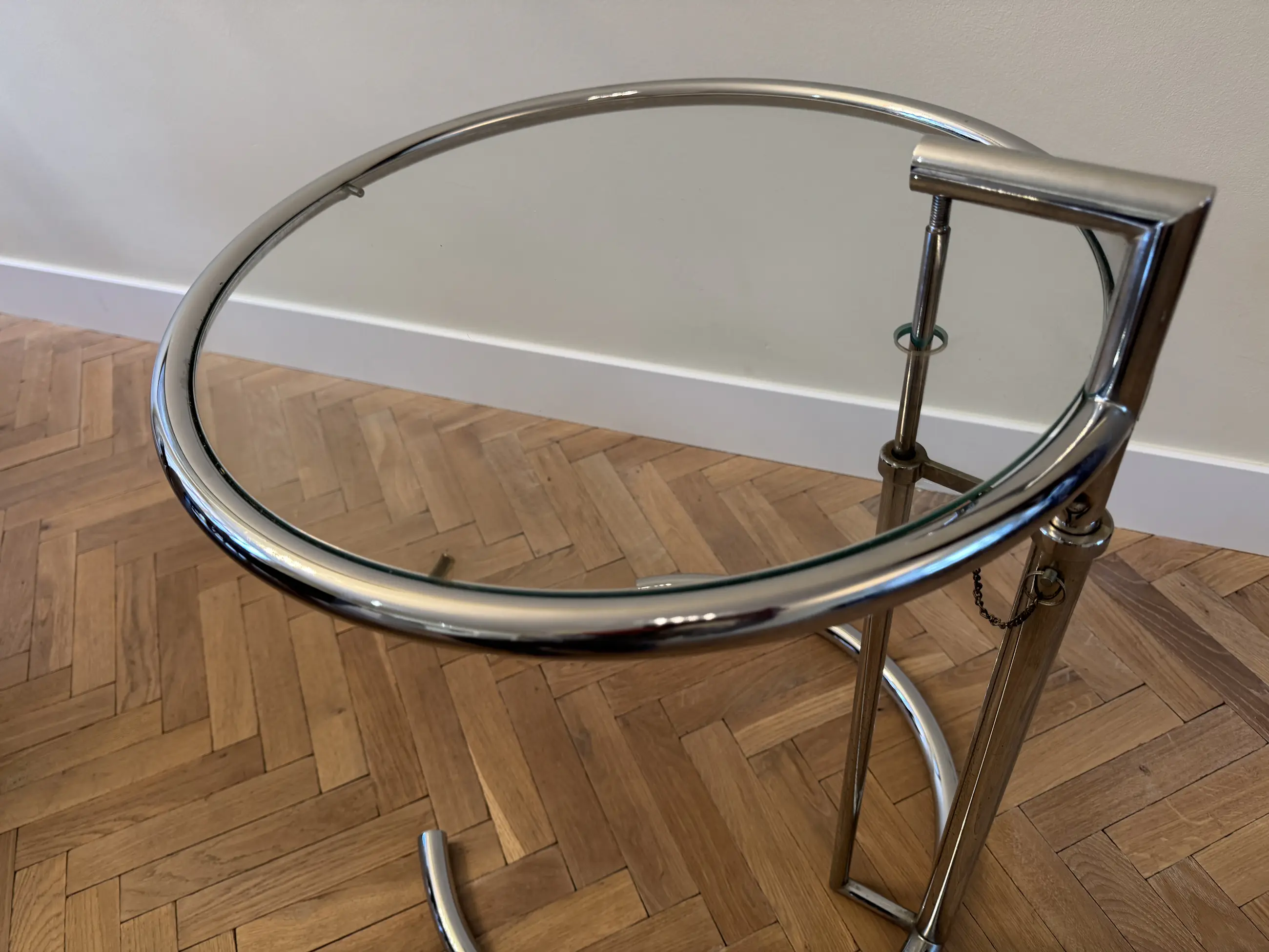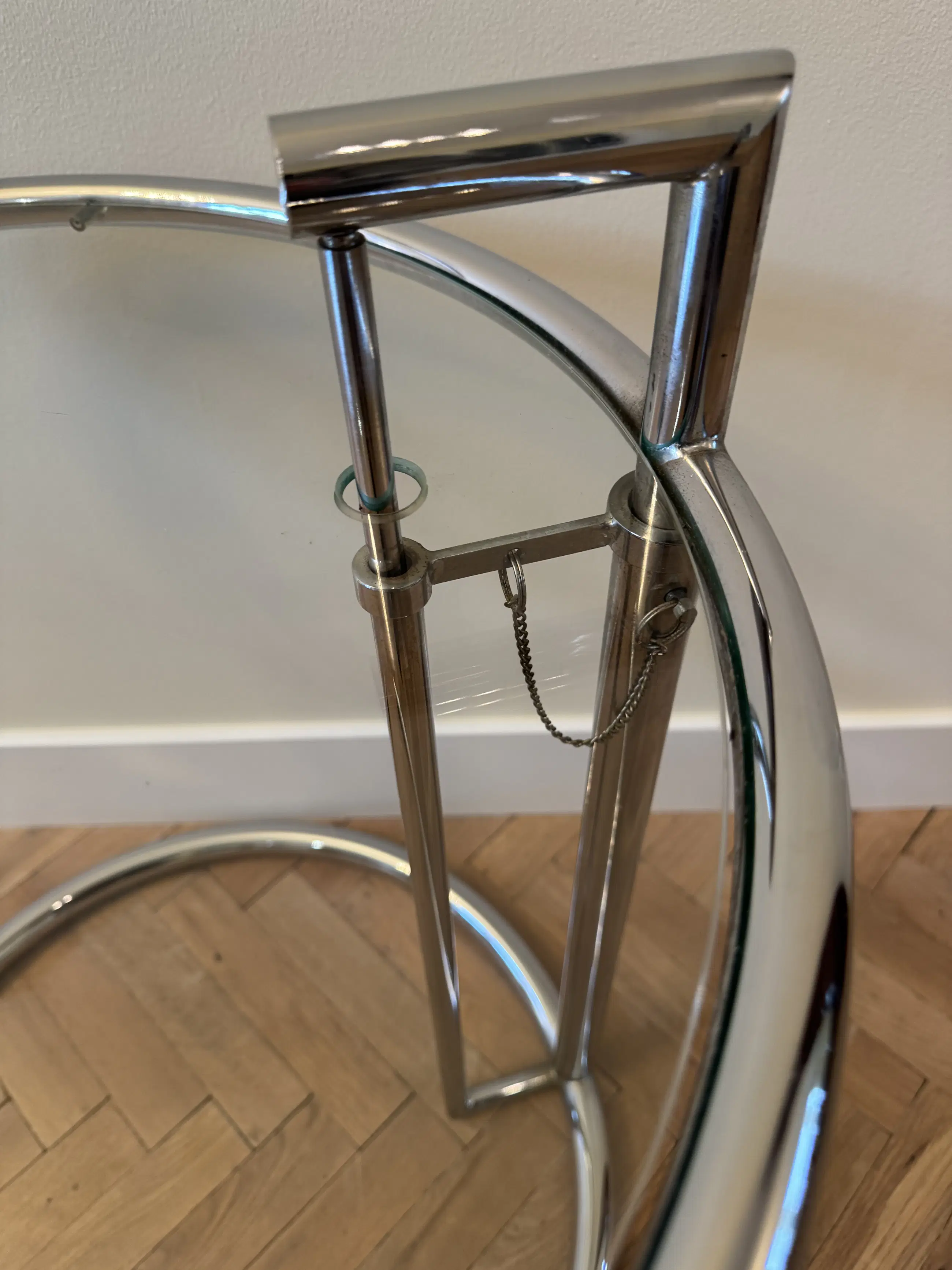 Toegeschreven Eileen Gray chromen design bijzettafel E 1027 – verstelbaar – glas en verchroomd staal – jaren 1970-1990 designklassieker
