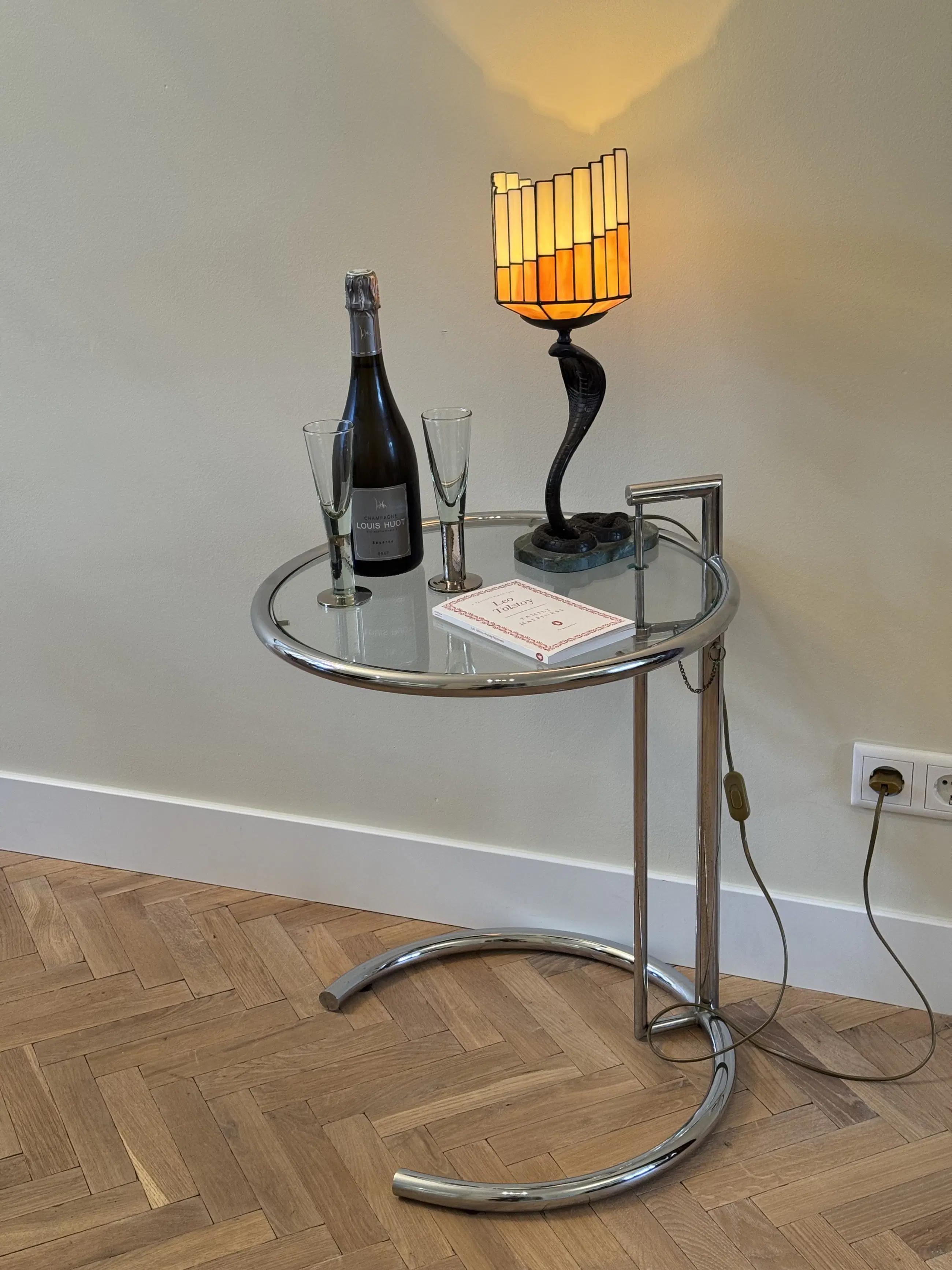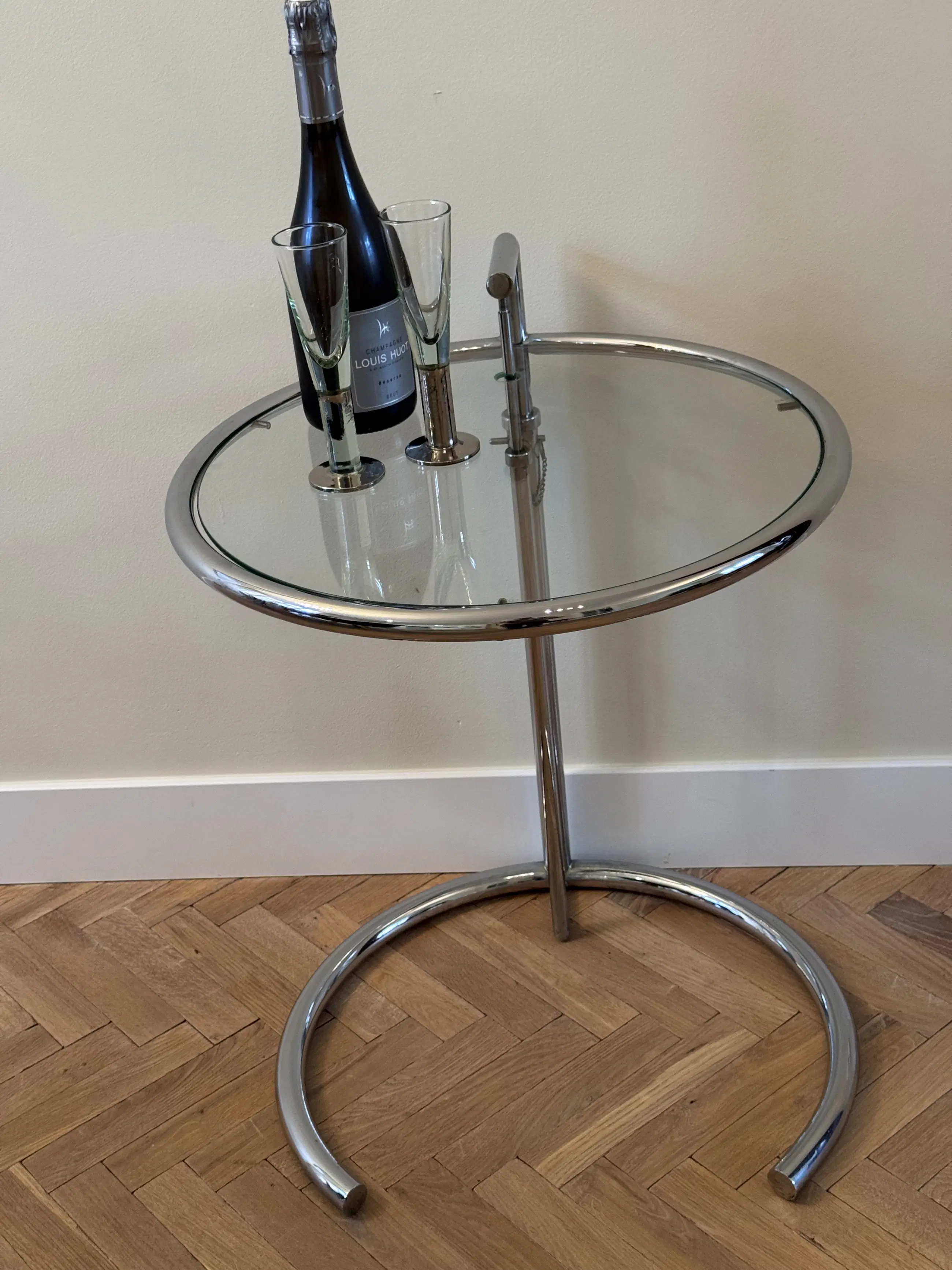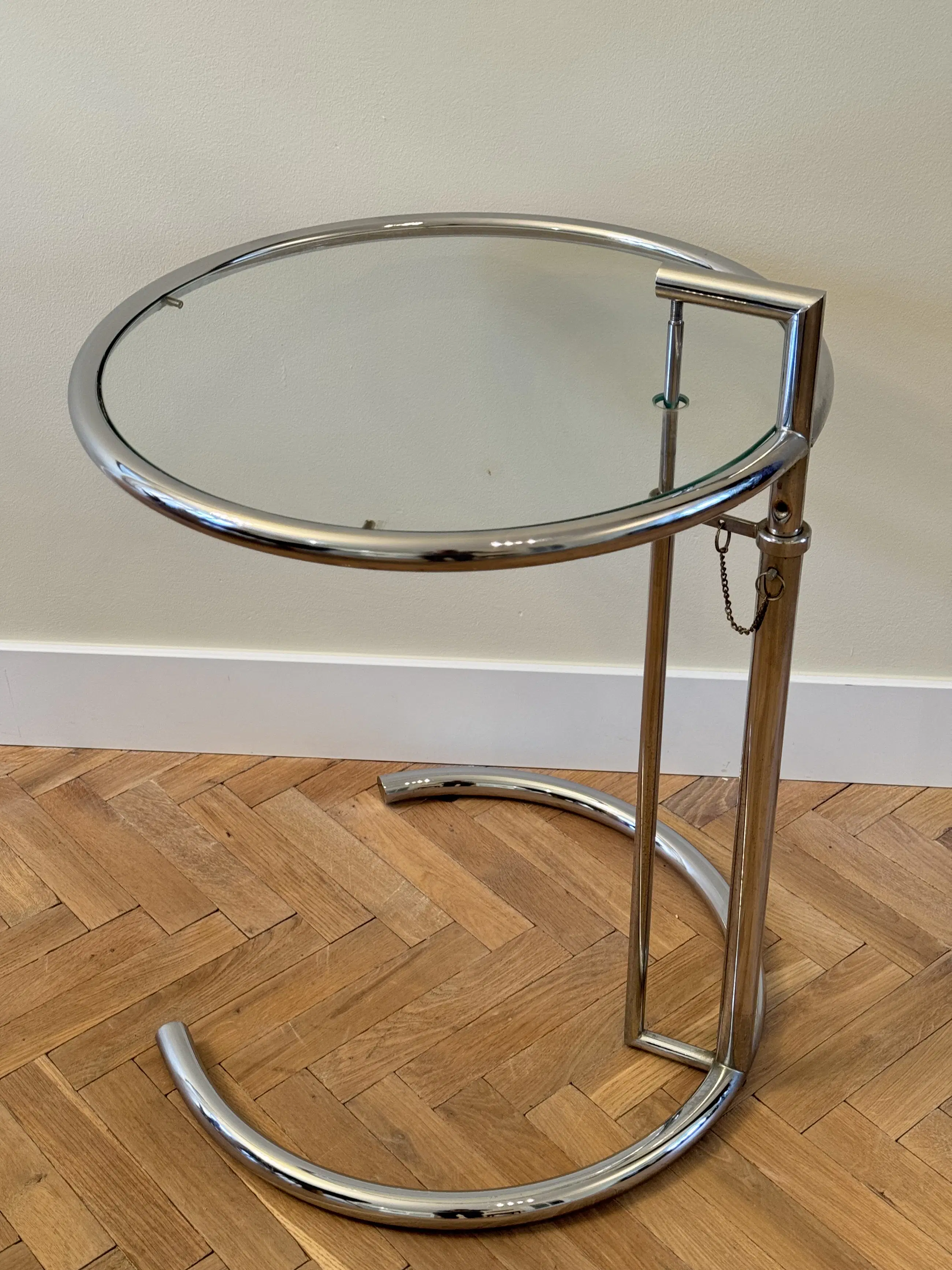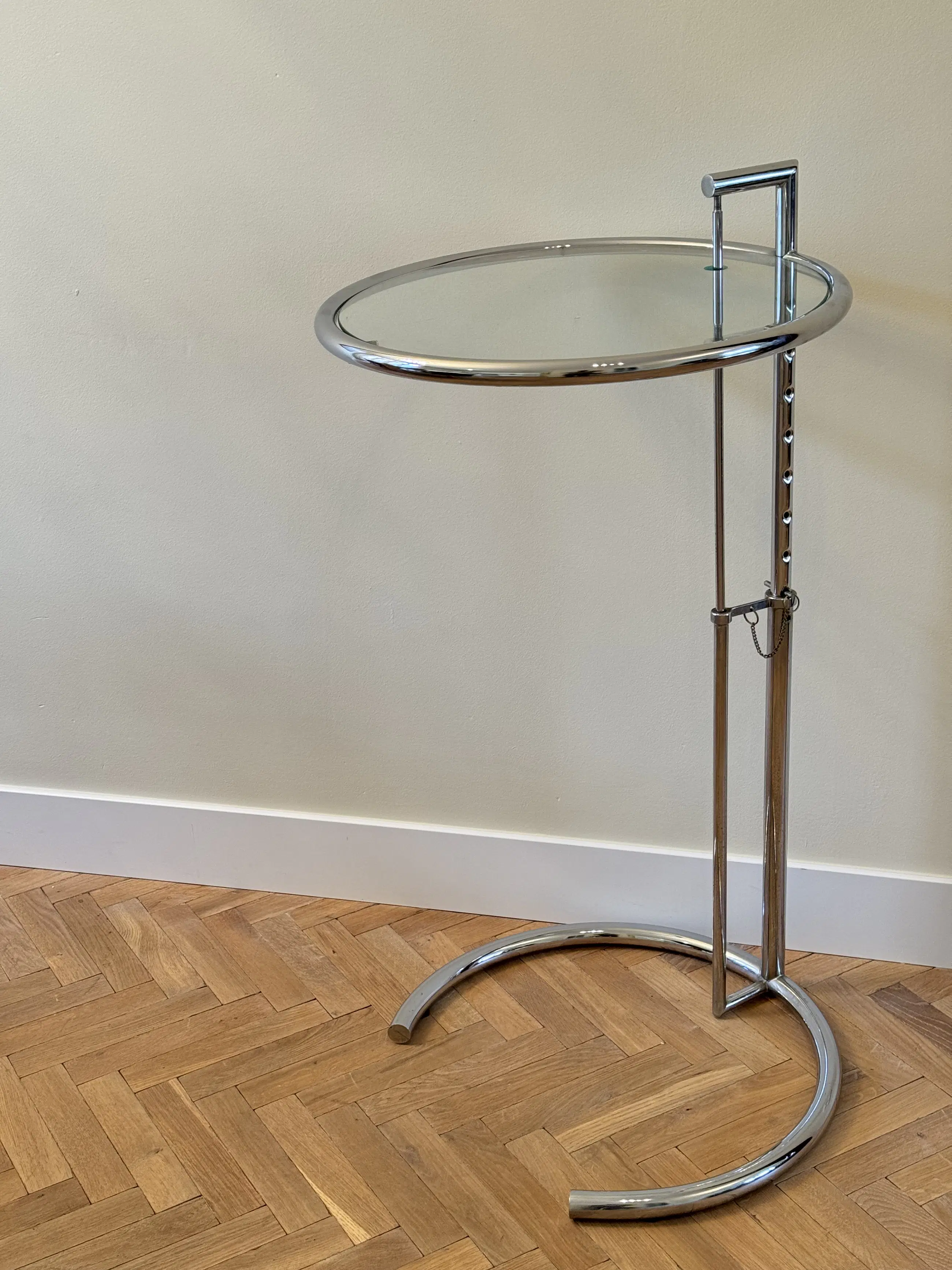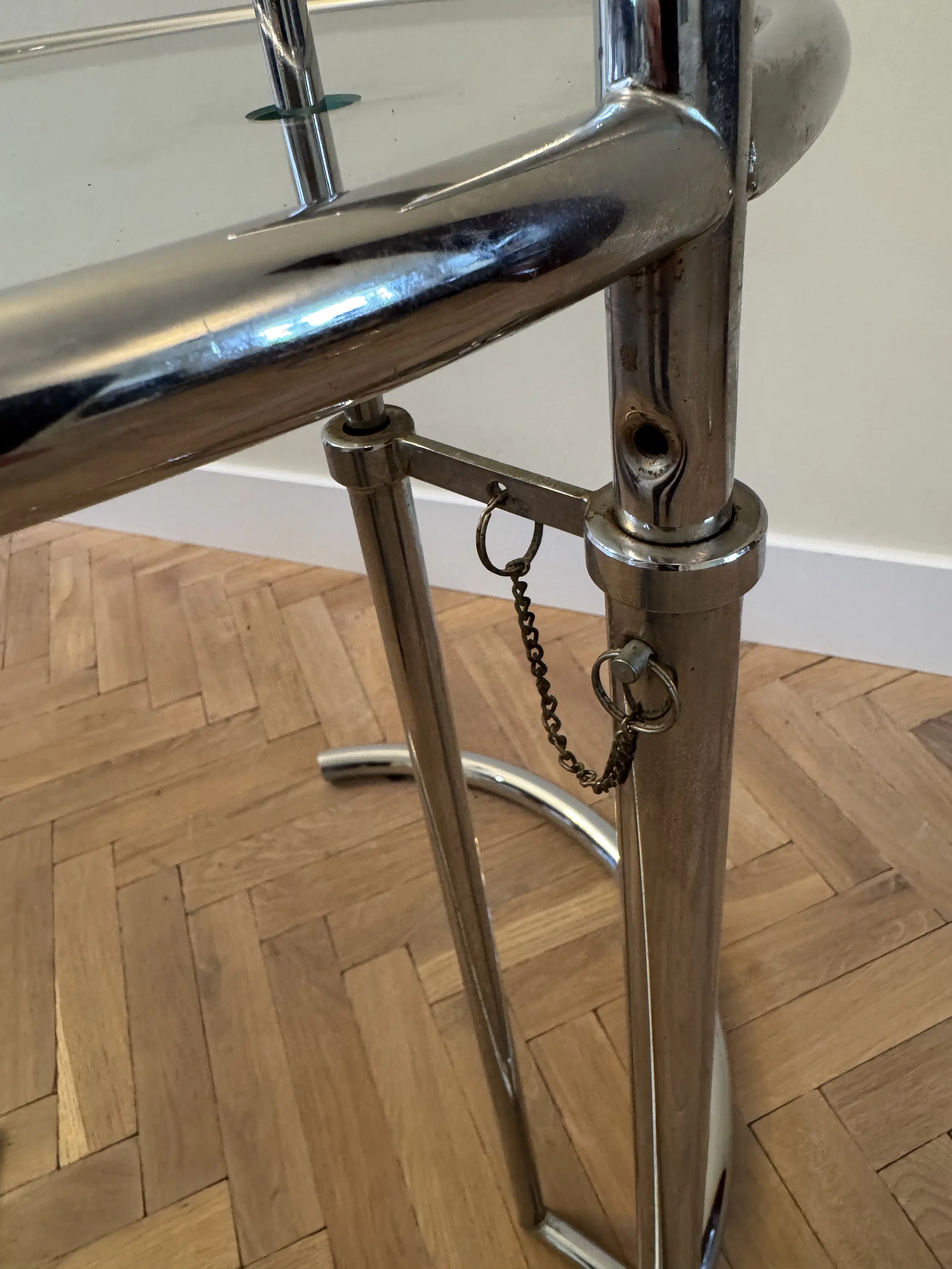 Toegeschreven Eileen Gray chromen design bijzettafel E 1027 – verstelbaar – glas en verchroomd staal – jaren 1970-1990 designklassieker